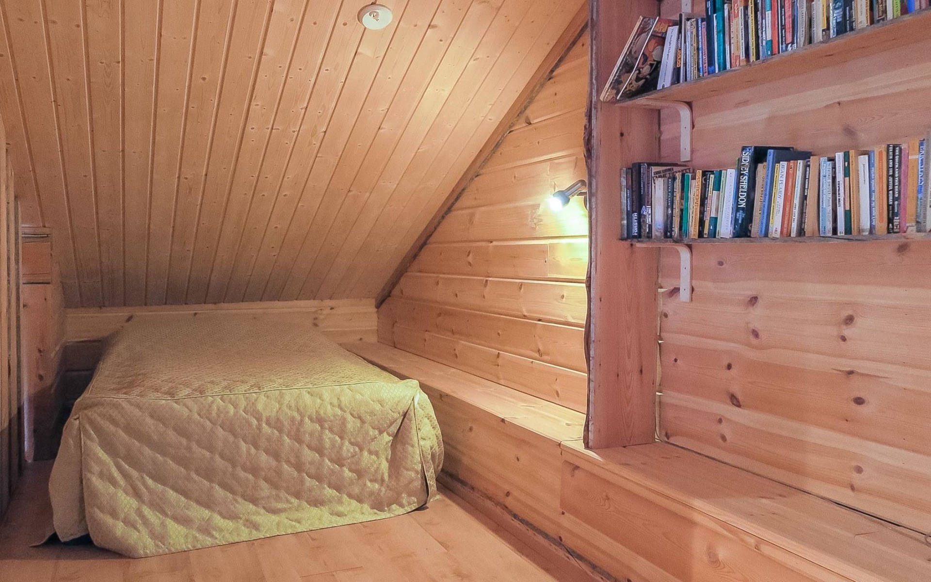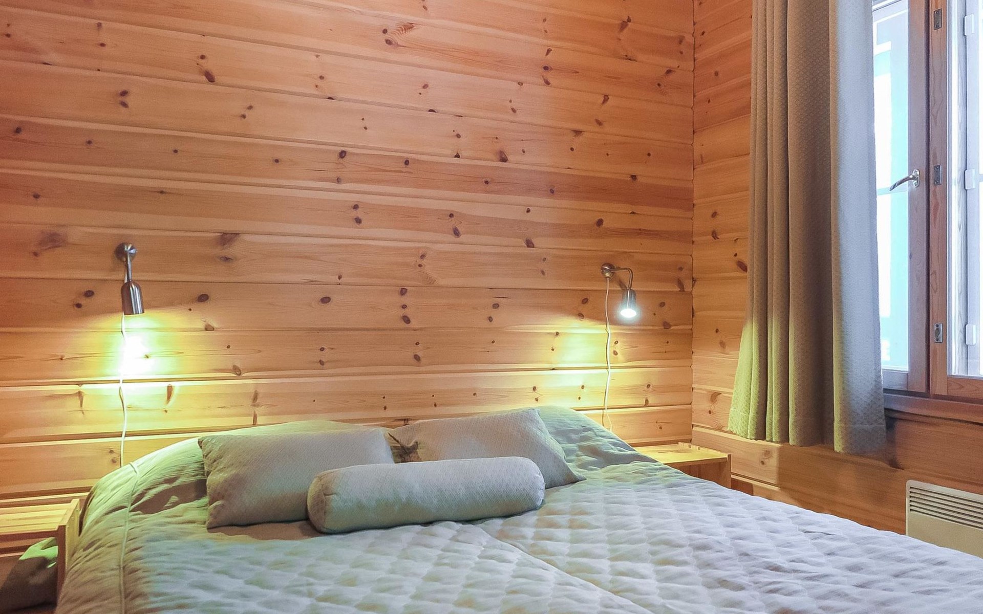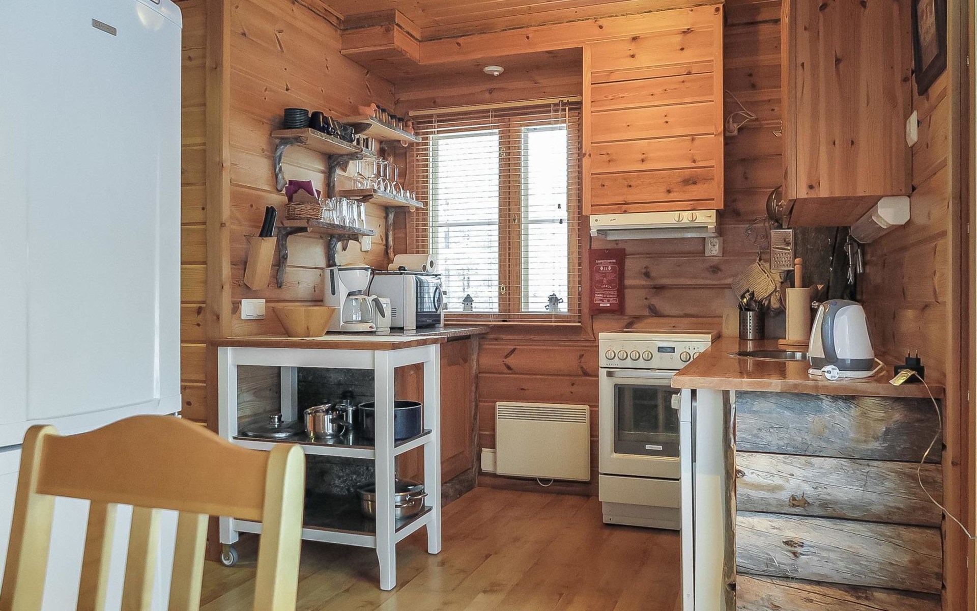 Wooden semi-detached house, built in 2005. Living room with sofa, kitchenette, bedroom with double bed (sliding door). Loft with double bed and 2 single beds (widths 80 cm and 120 cm). Sauna, washing room, separate toilet and small covered porch. The kitchen also has coffee and water kettles, an espresso machine (the customer brings the capsules) and a toaster.