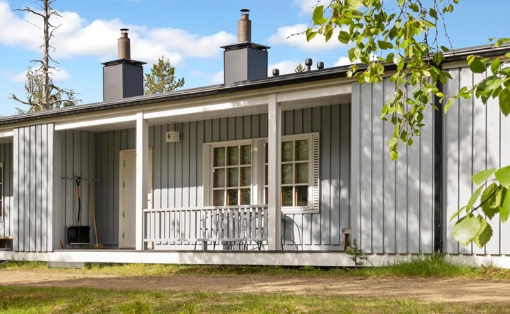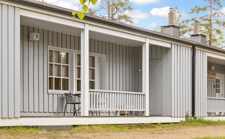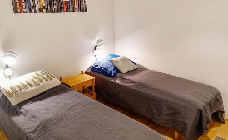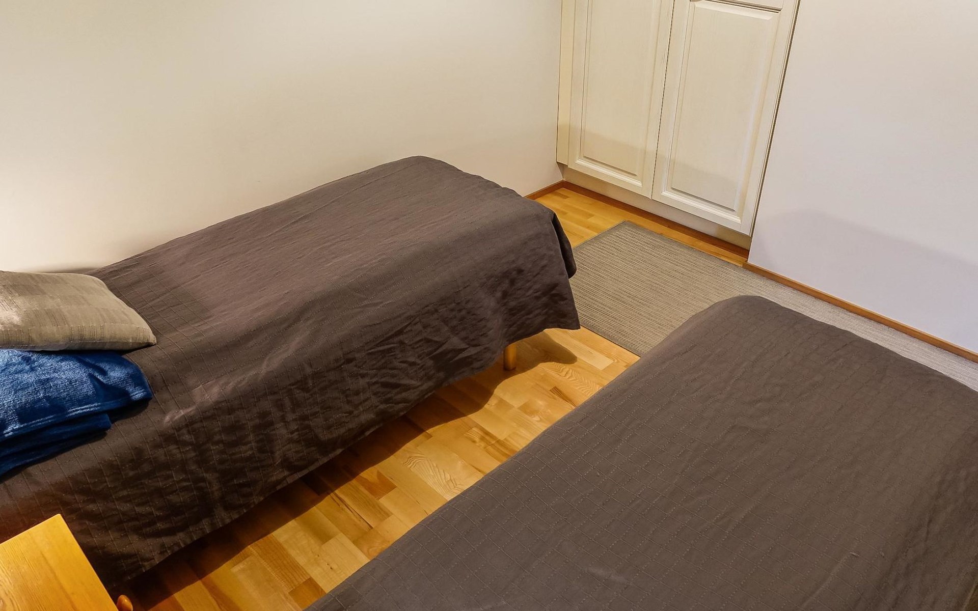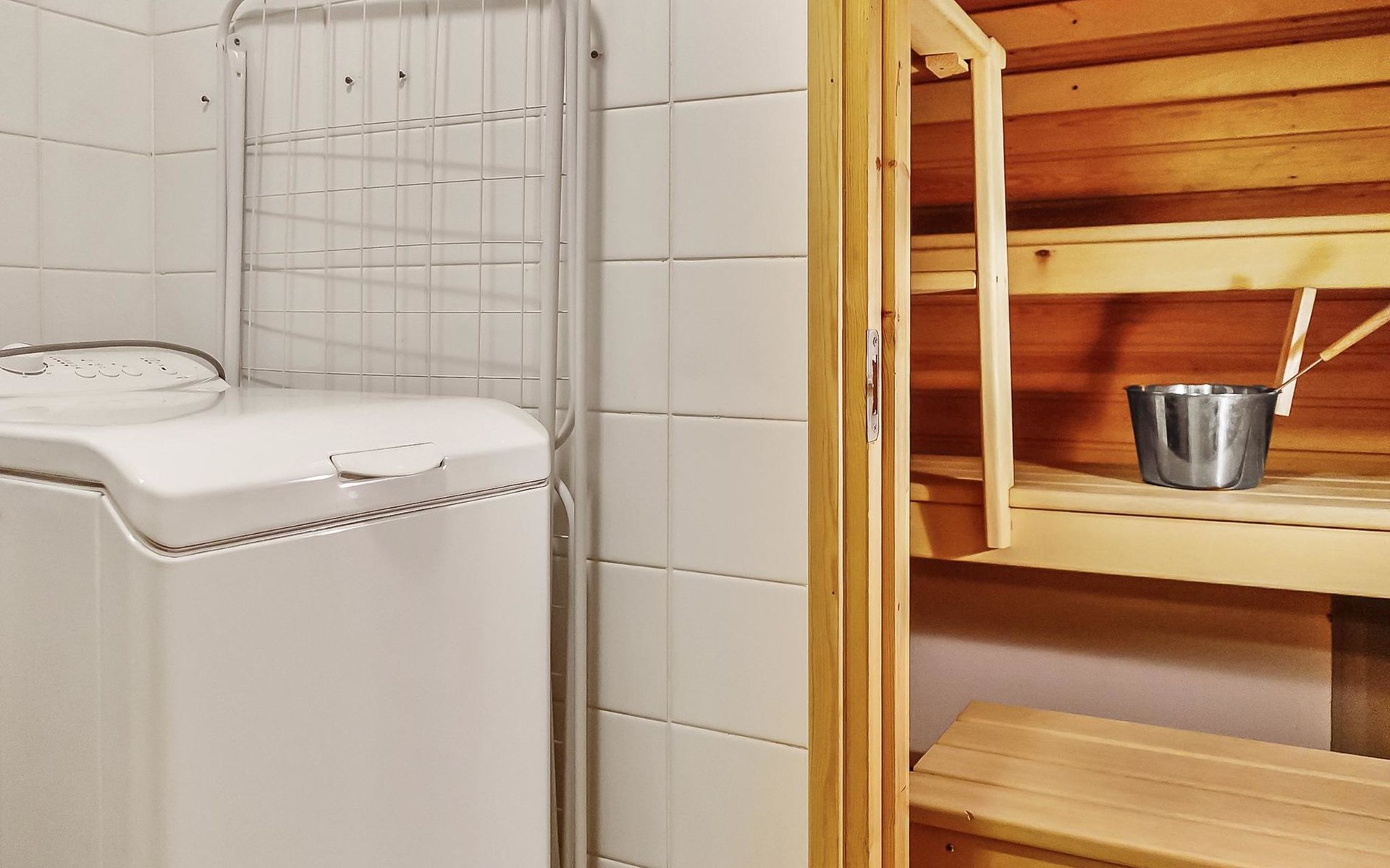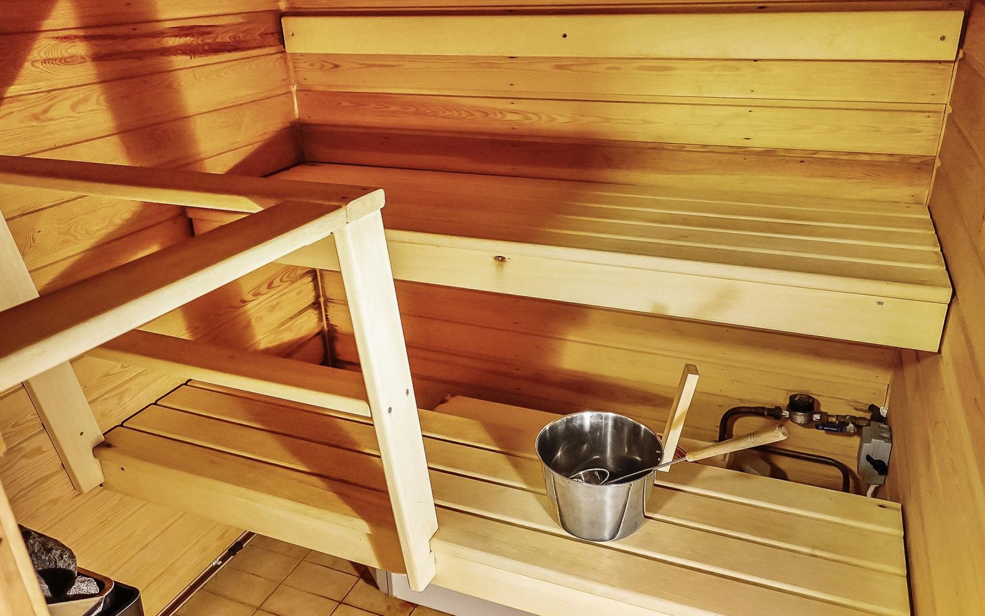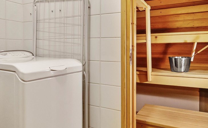 Living room with sofa bed, kitchenette, bedroom with 2 beds, another bedroom with bunk bed, sauna, washroom, separate WC and covered terrace.