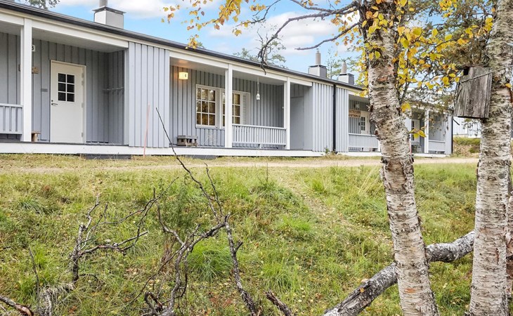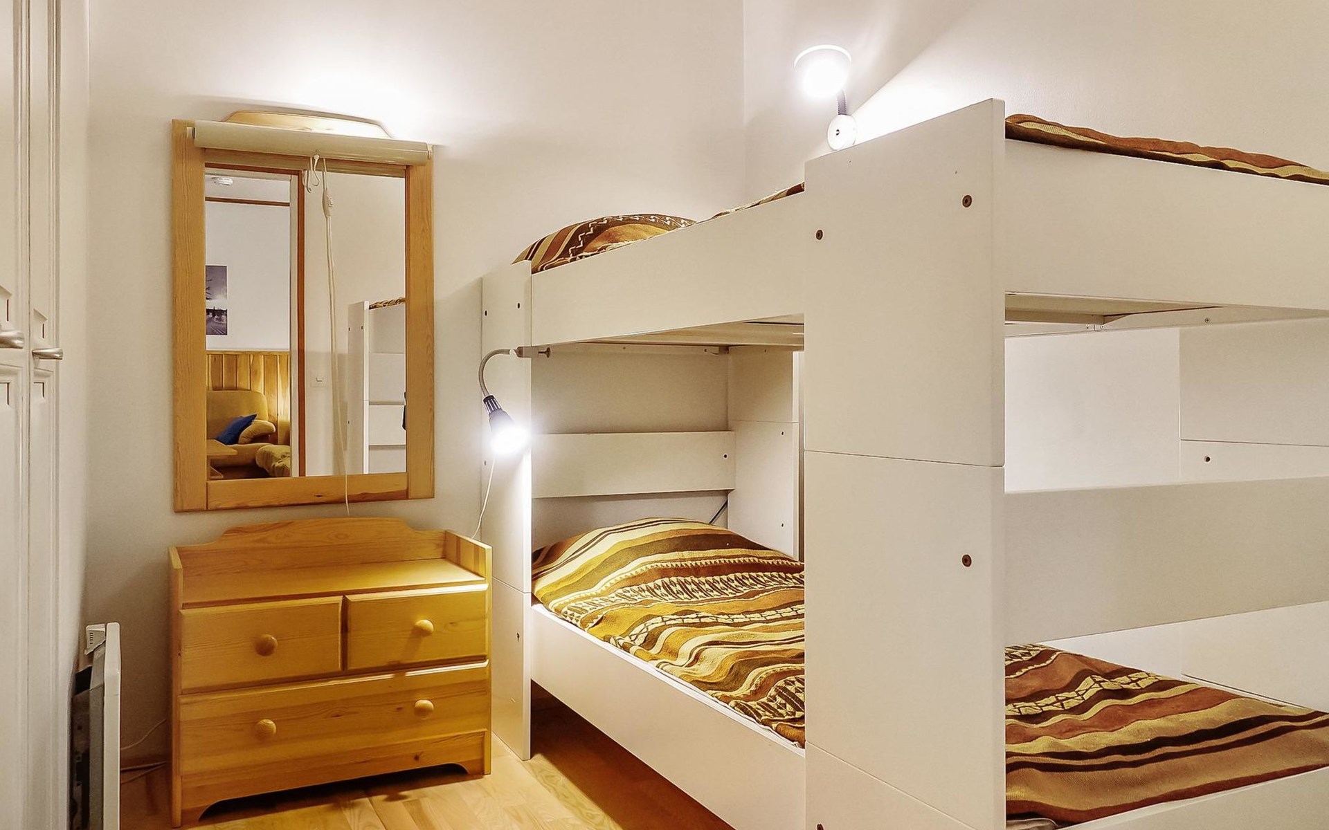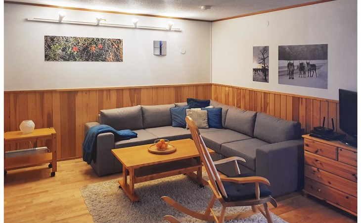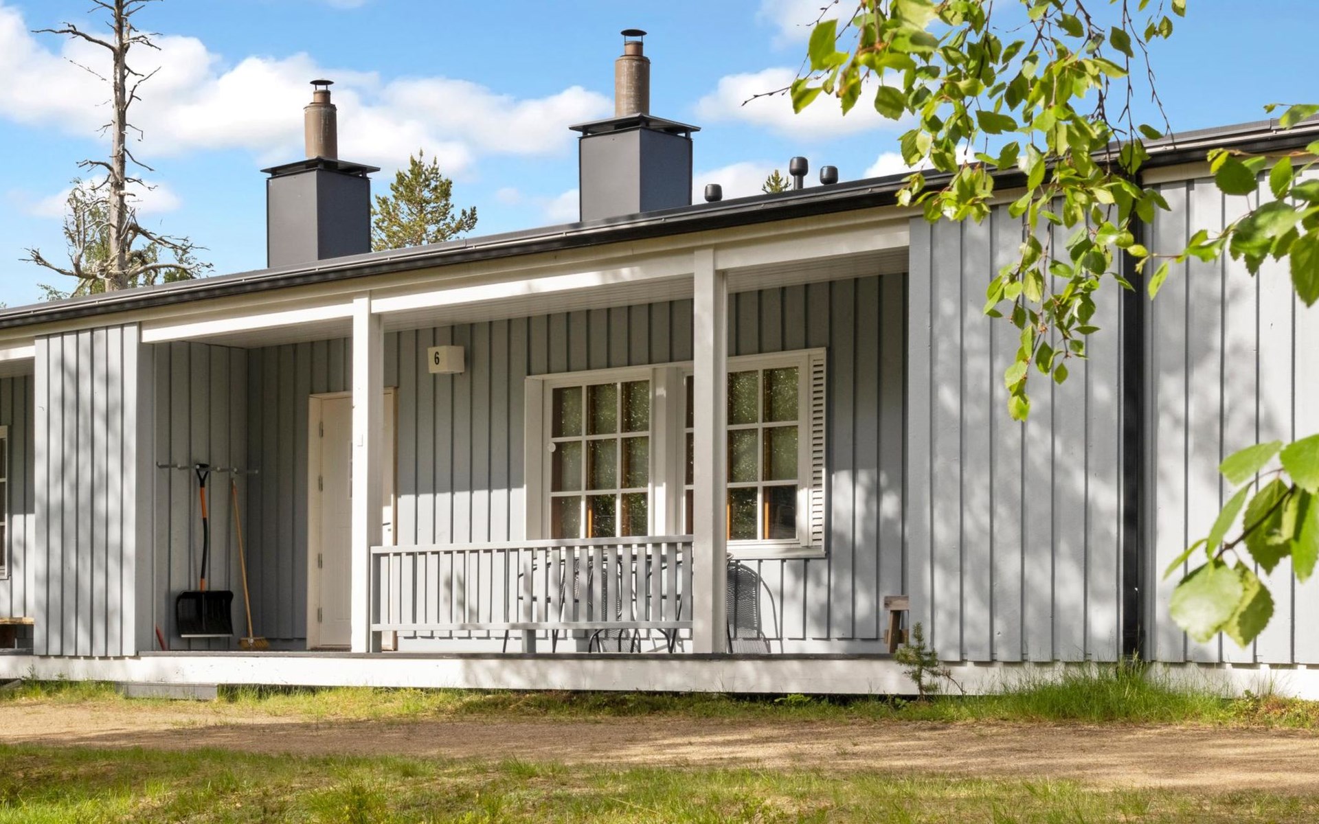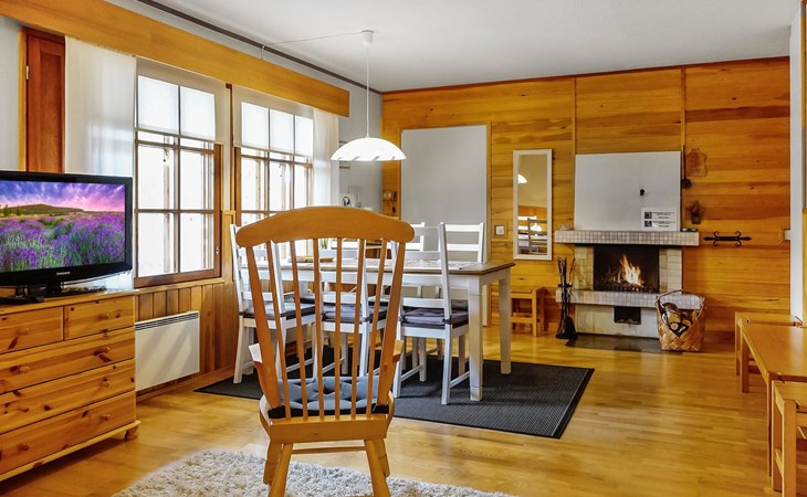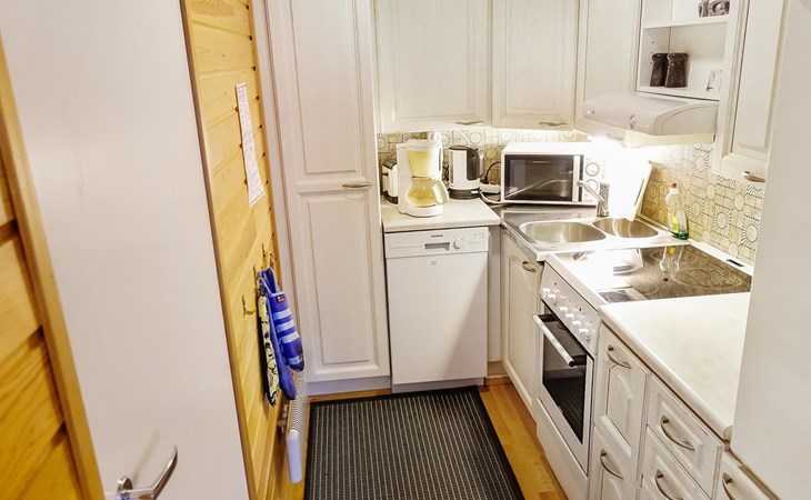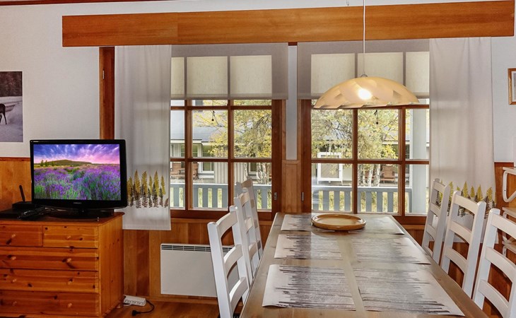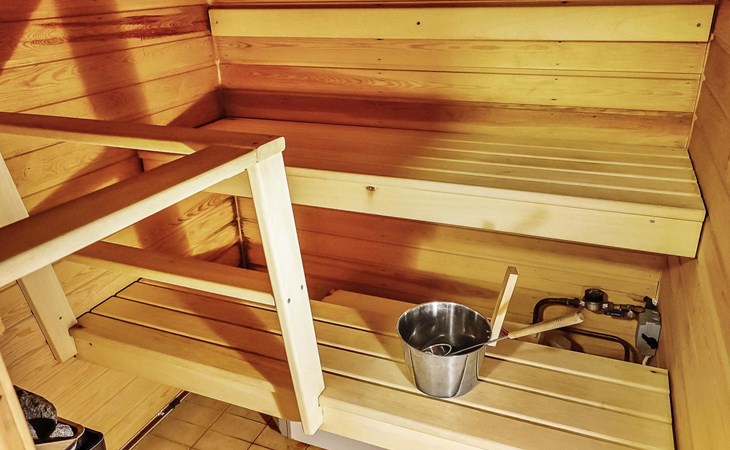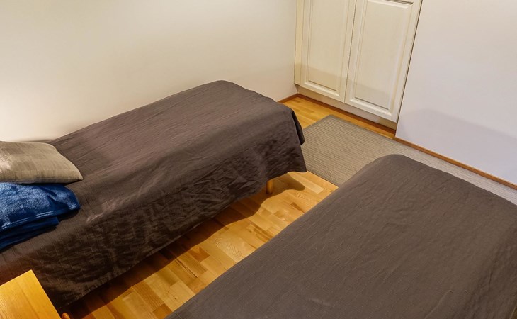 Living room with sofa bed, kitchenette, bedroom with 2 beds, another bedroom with bunk bed, sauna, washroom, separate WC and covered terrace.
