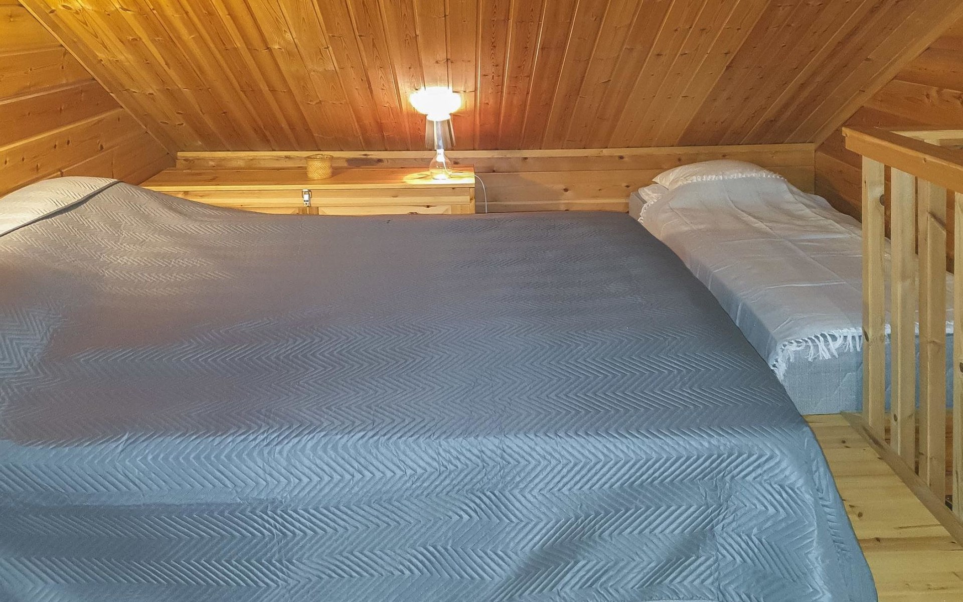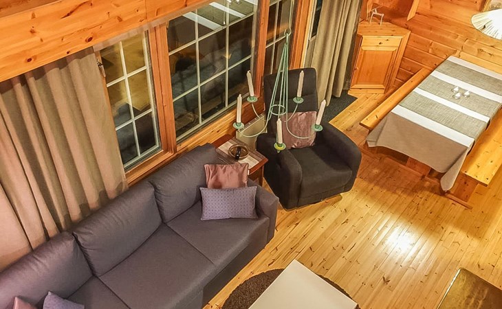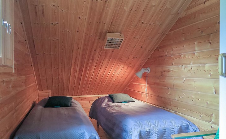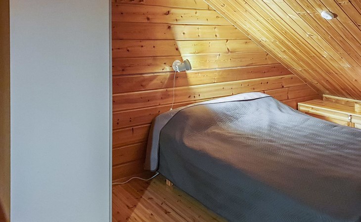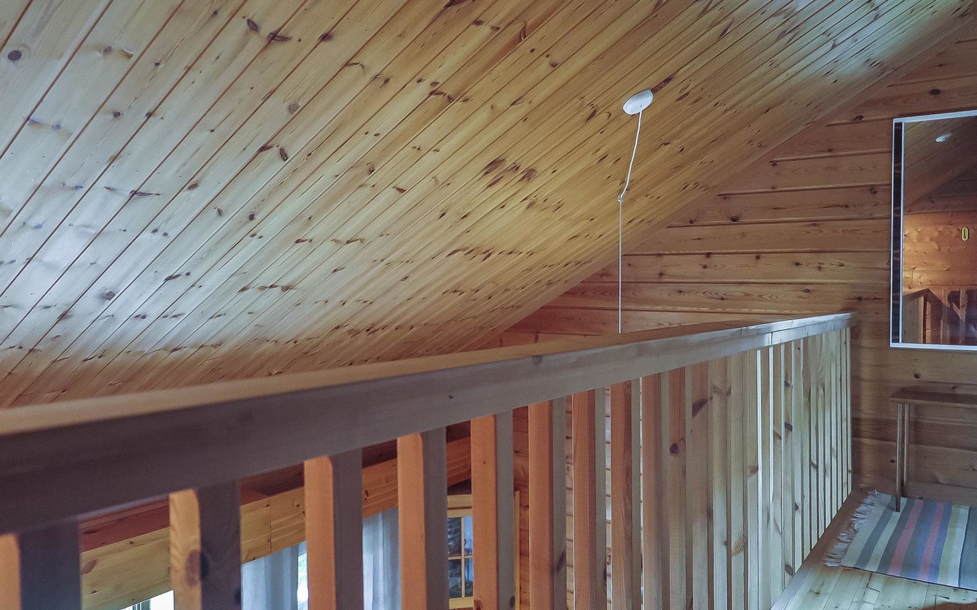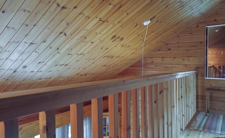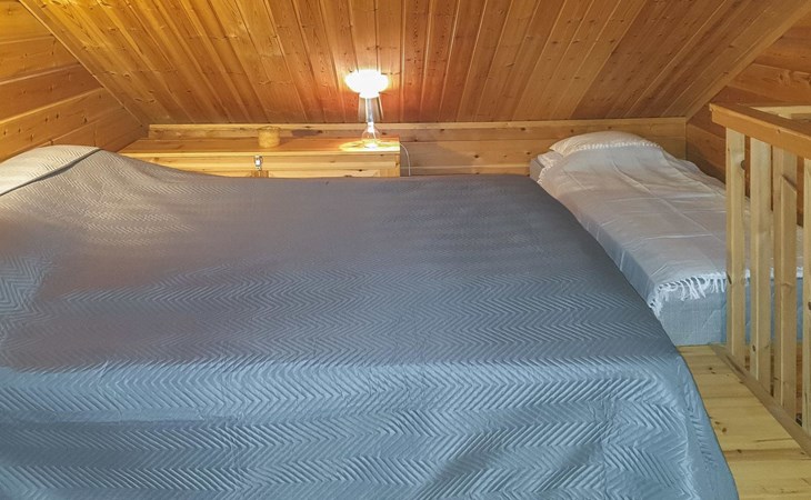 Living room with sofa bed, kitchenette, loft divided to compartments, 2 beds in both departments, sloped ceiling, sauna, washroom, separate WC, open veranda, storeroom.