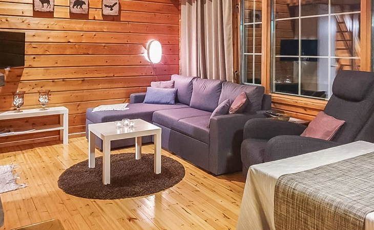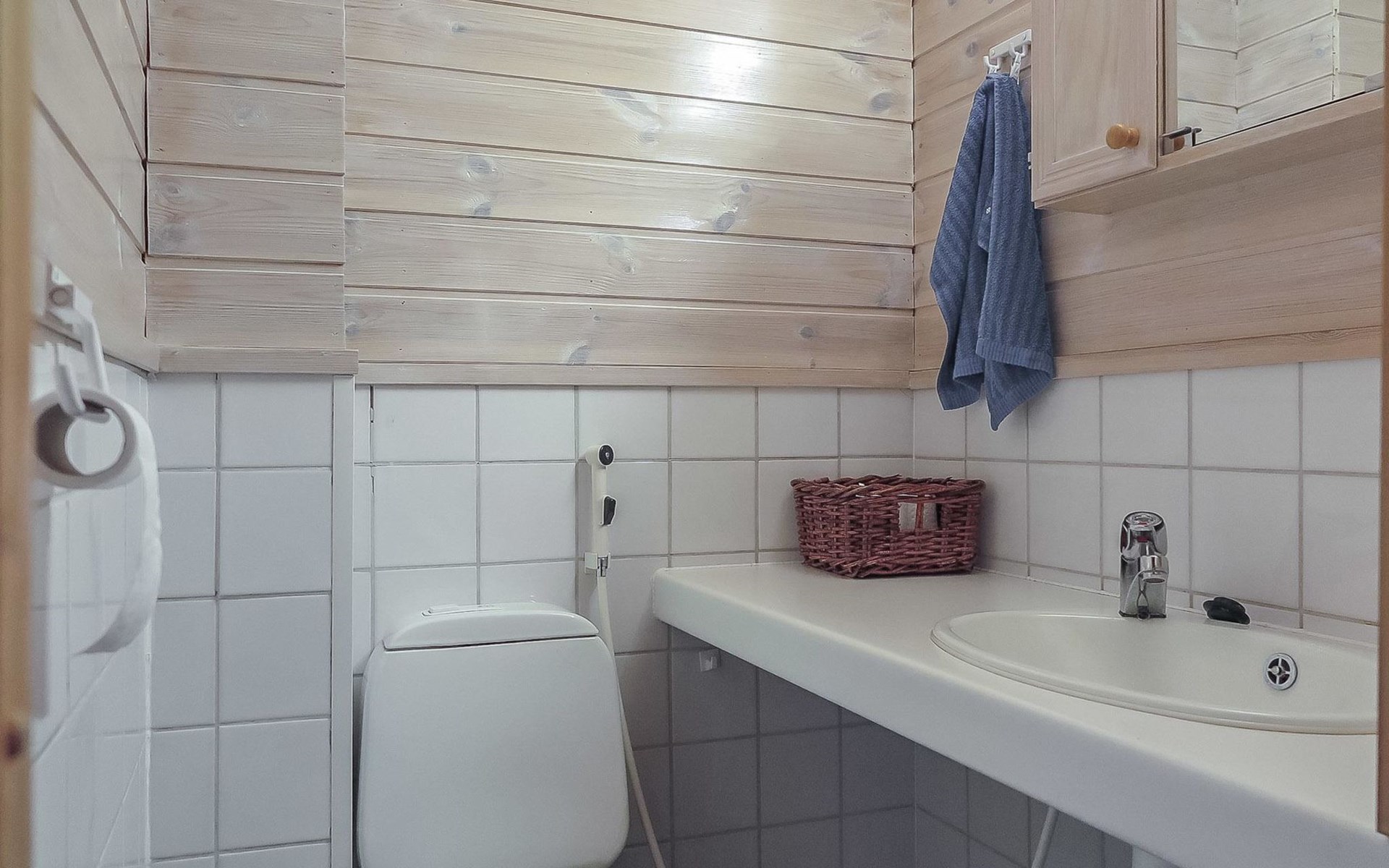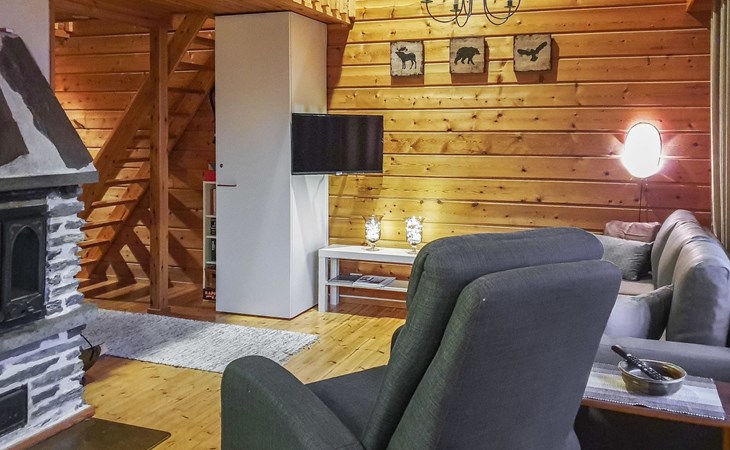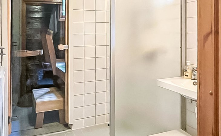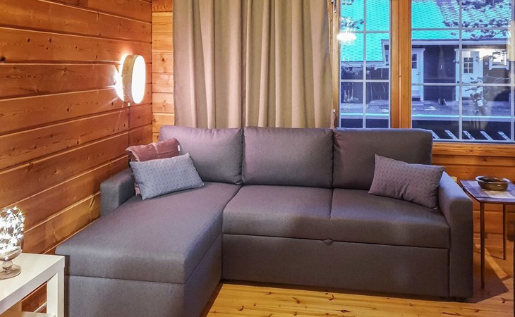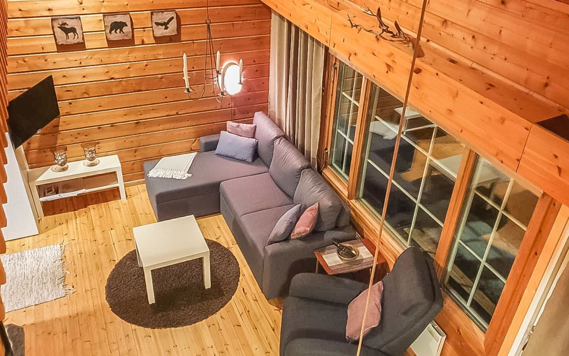 Living room with sofa bed, kitchenette, loft divided to compartments, 2 beds in both departments, sloped ceiling, sauna, washroom, separate WC, open veranda, storeroom.