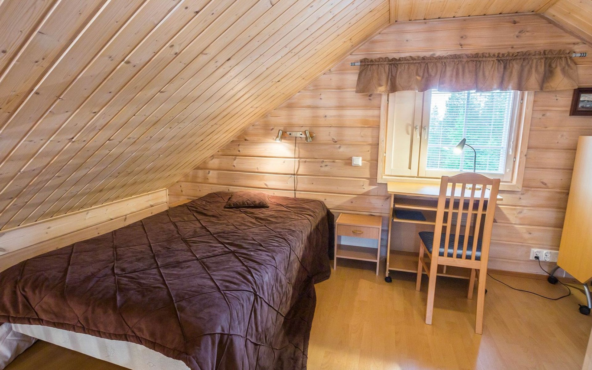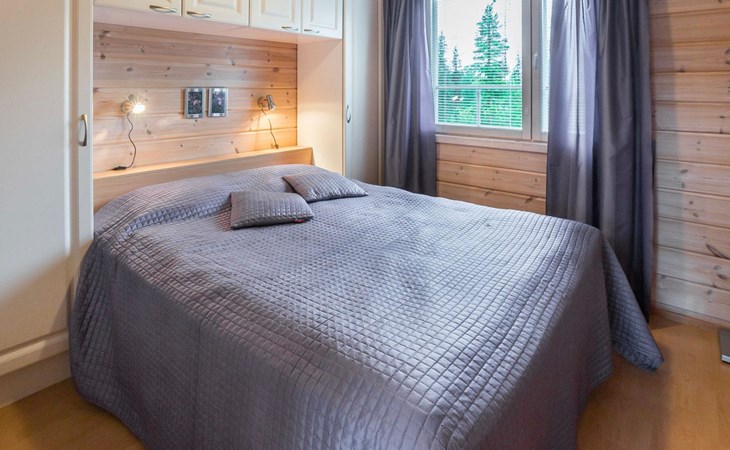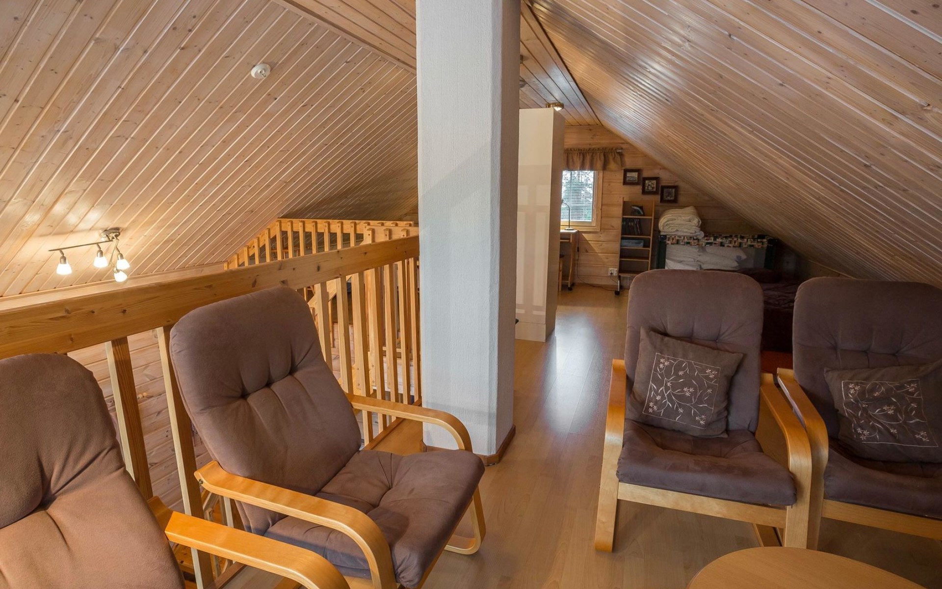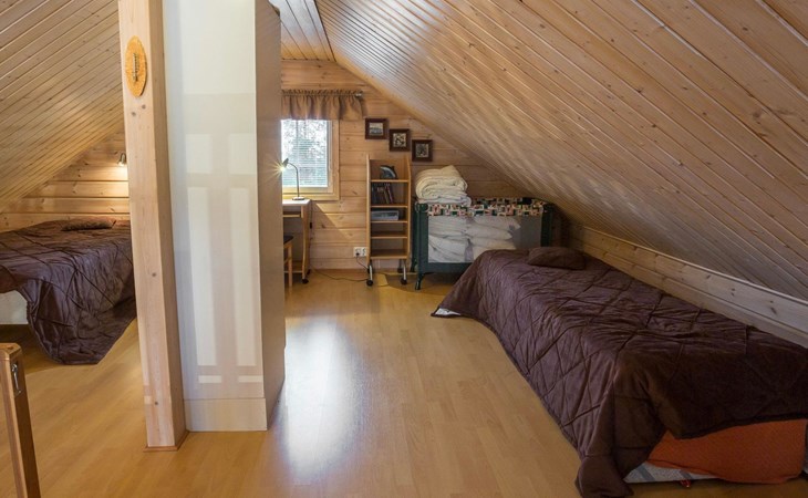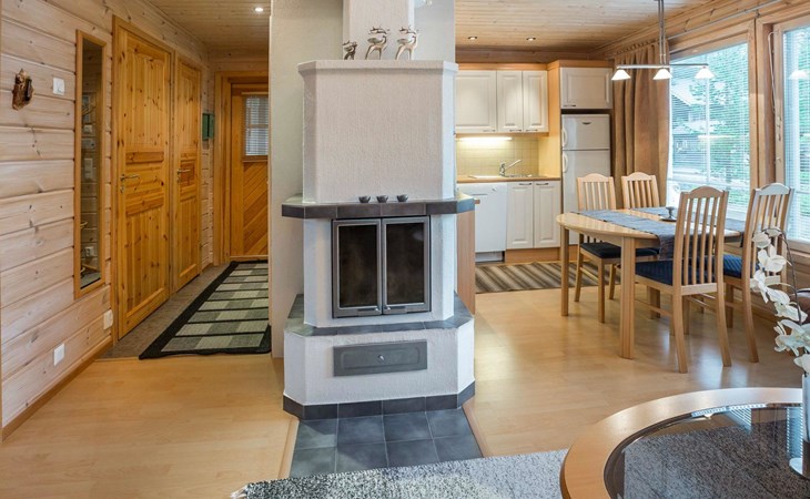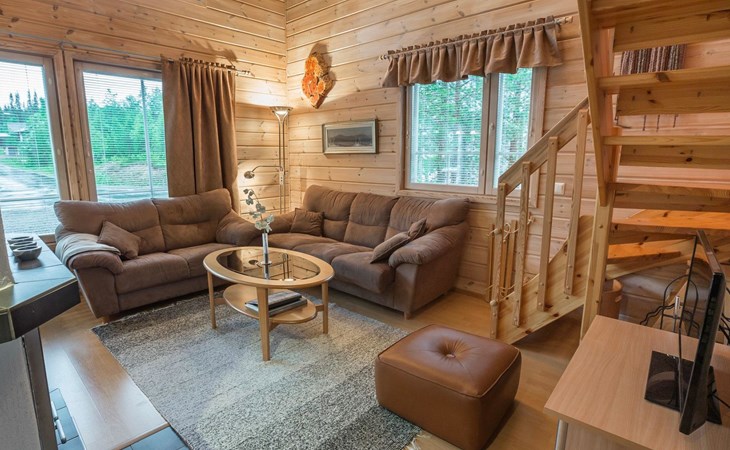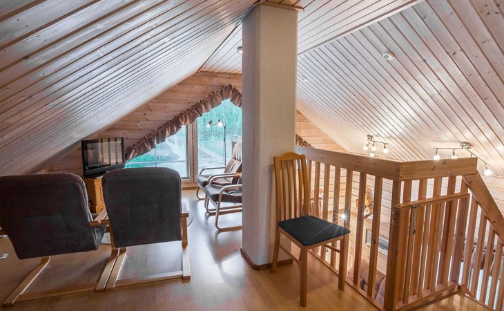 Log duplex apartment (built 2007) that has livingroom/kitchen with bed sofa, bedroom with double bed, loft (20 m2) with double bed and two mattresses, electric sauna, separate toilet and heated ski maintenance space. Area 65 m² of which 20 m² on the loft.