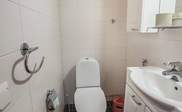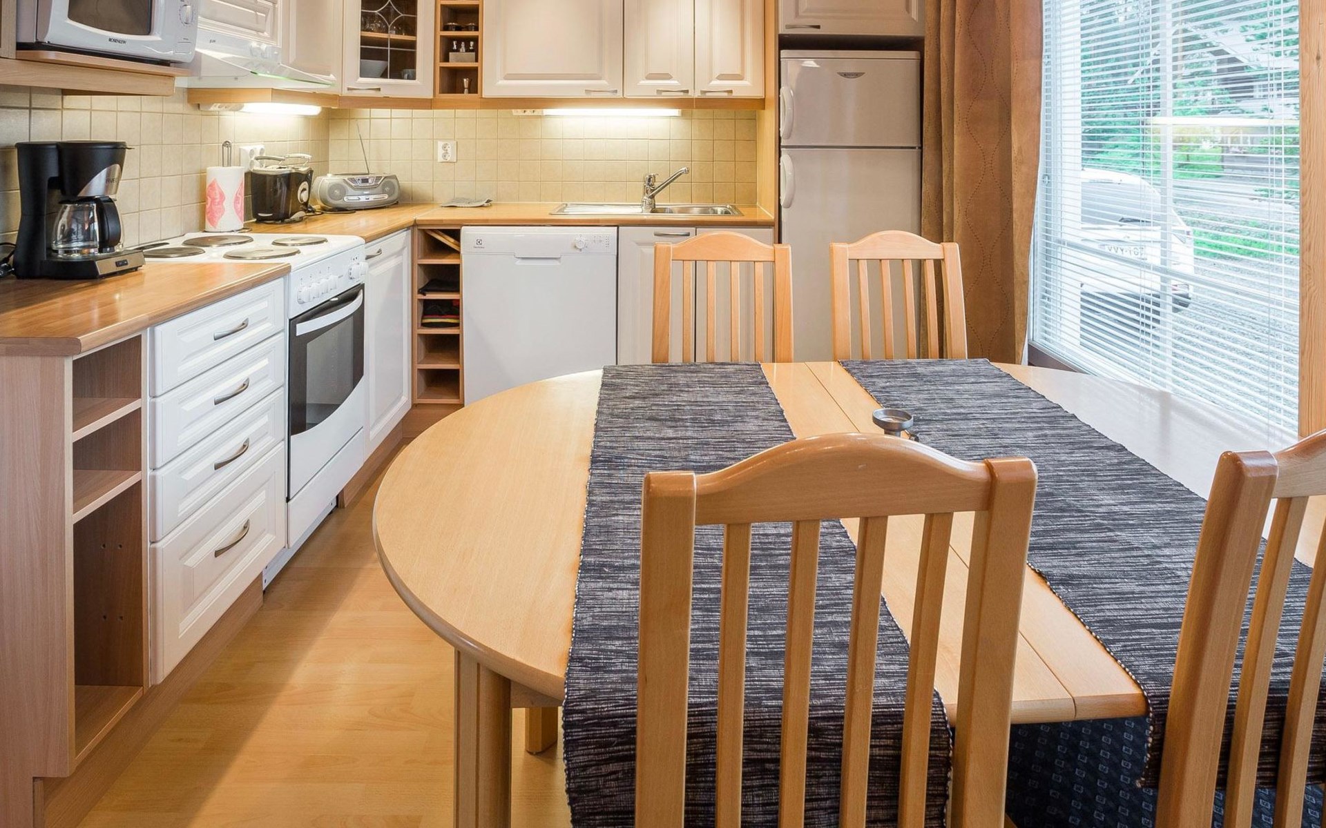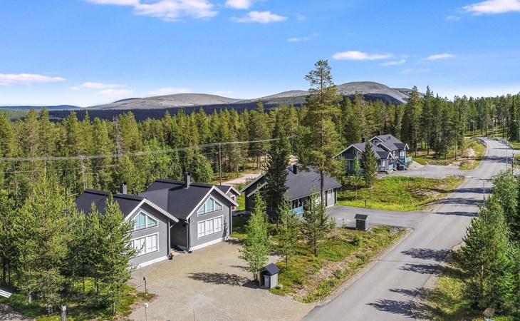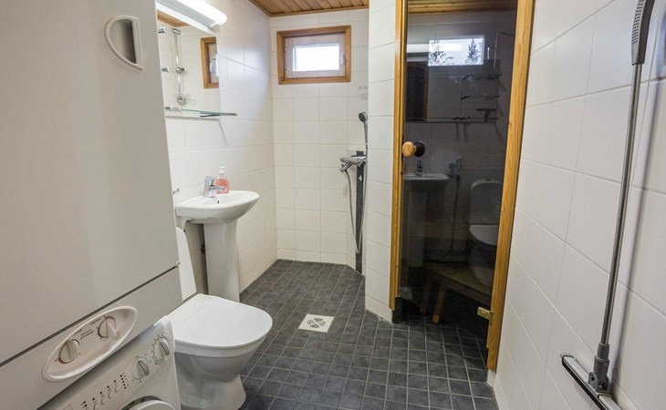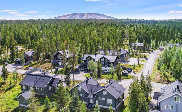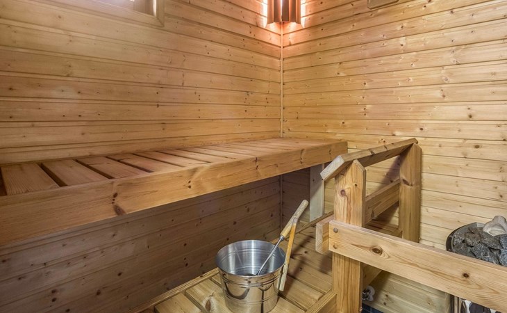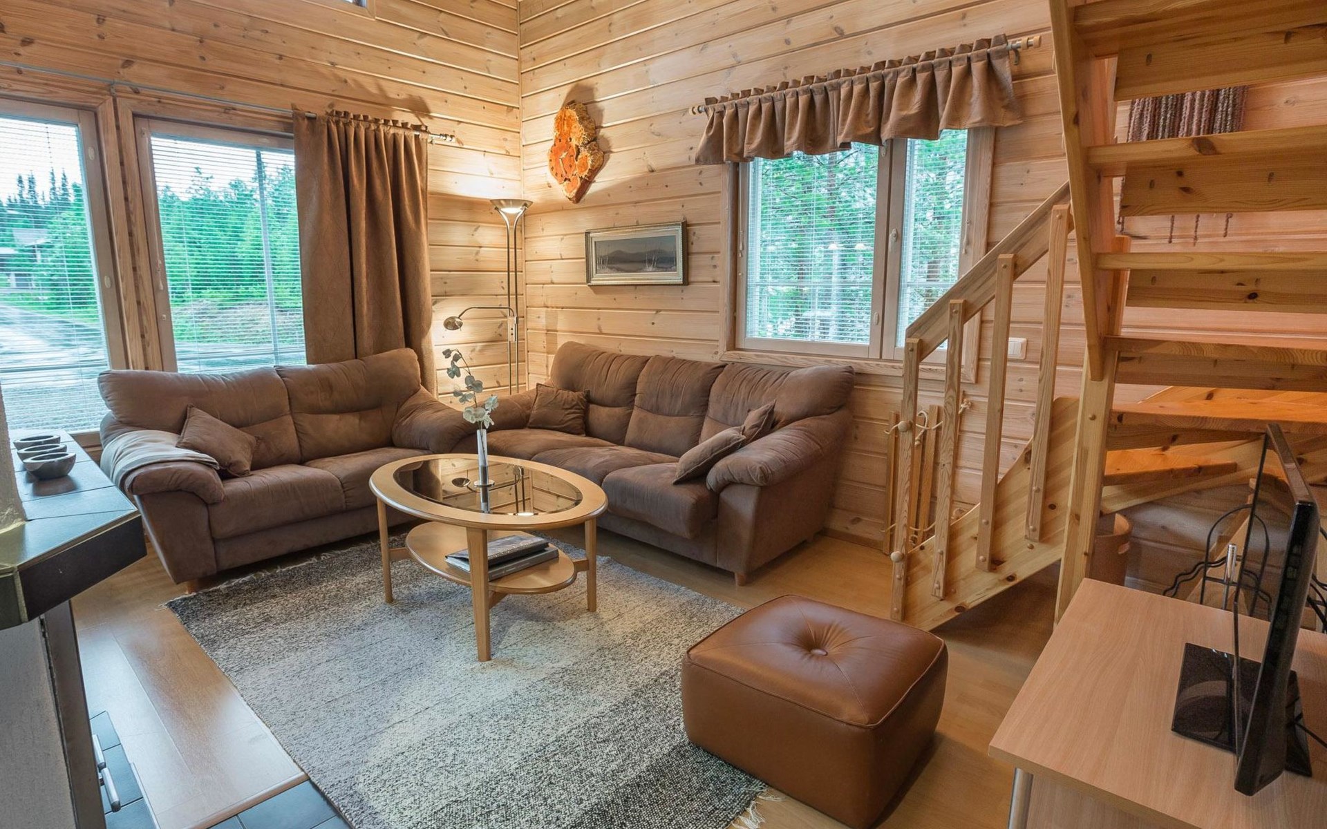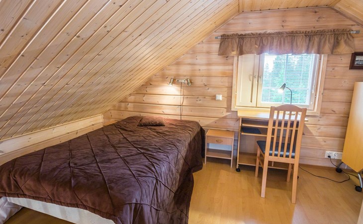 Log duplex apartment (built 2007) that has livingroom/kitchen with bed sofa, bedroom with double bed, loft (20 m2) with double bed and two mattresses, electric sauna, separate toilet and heated ski maintenance space. Area 65 m² of which 20 m² on the loft.
