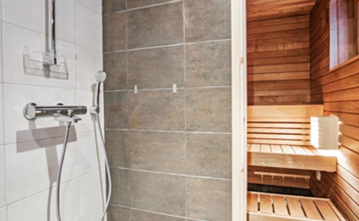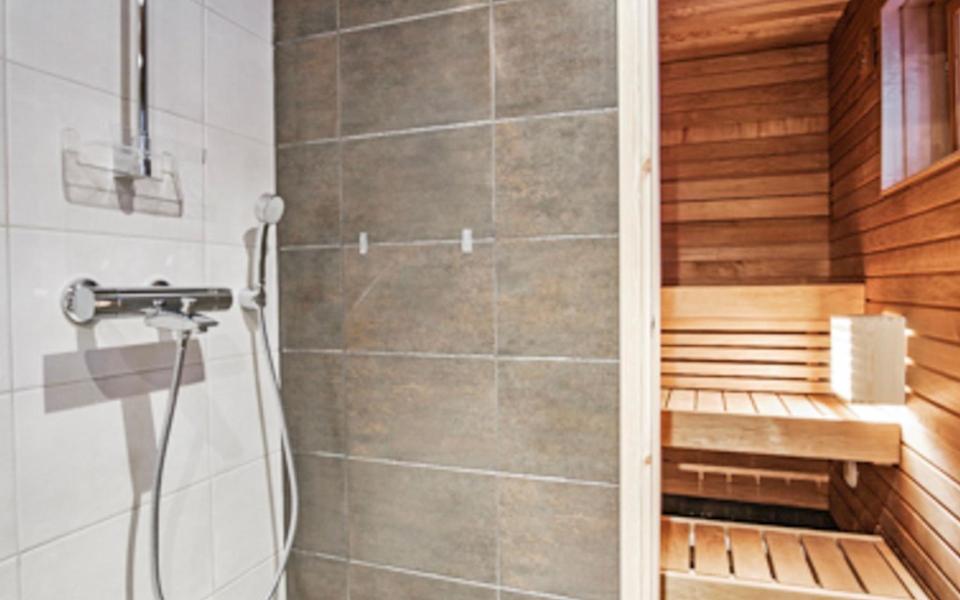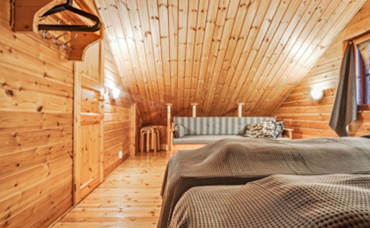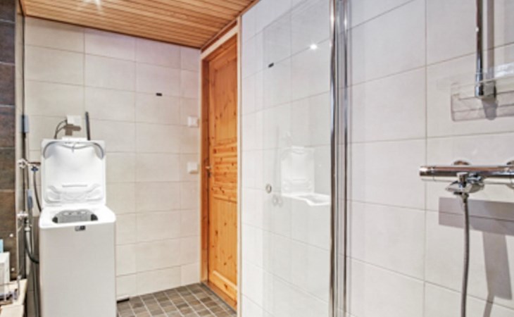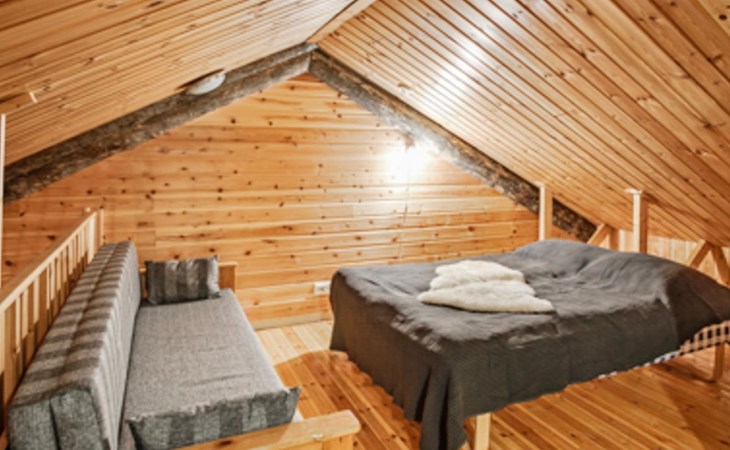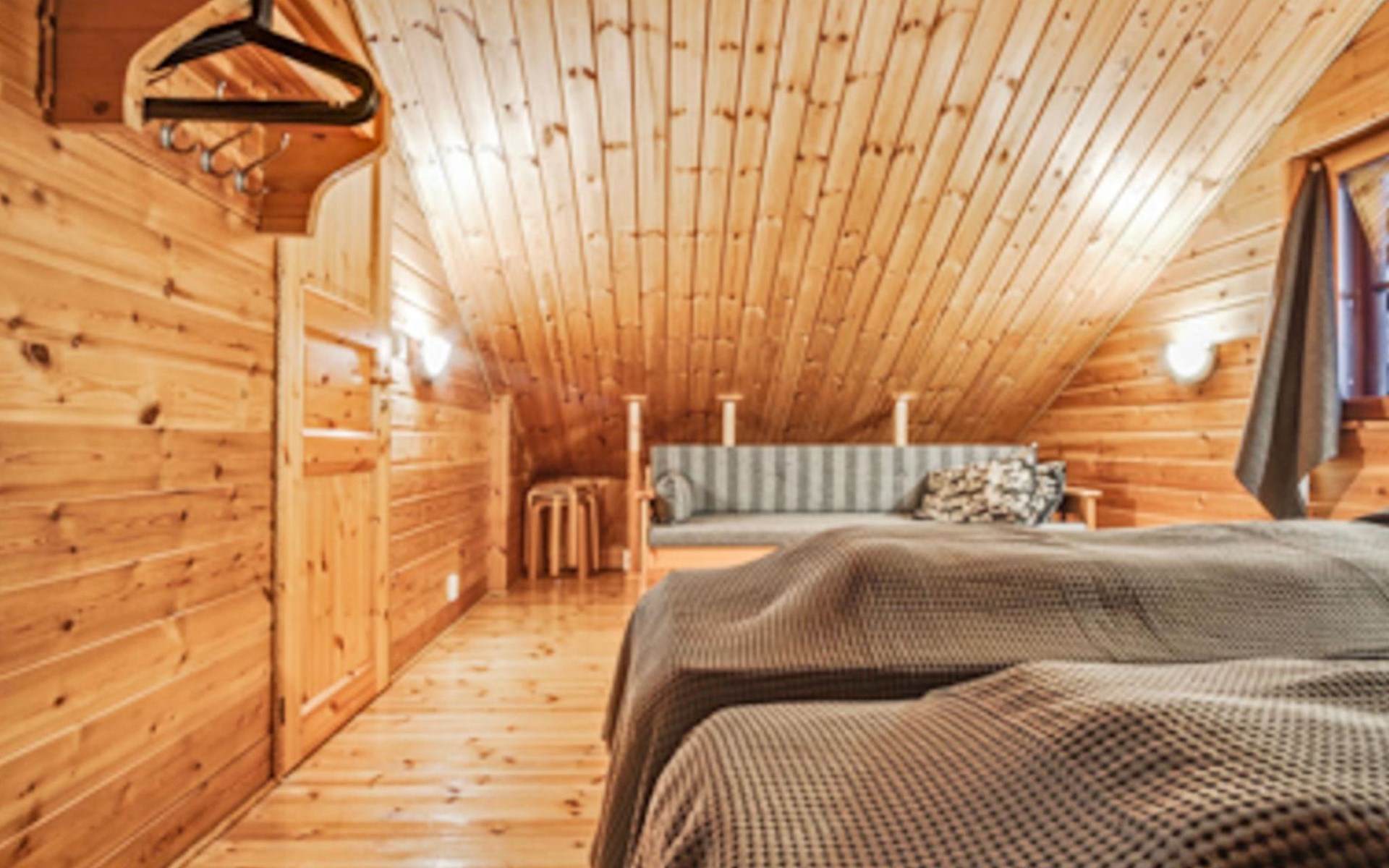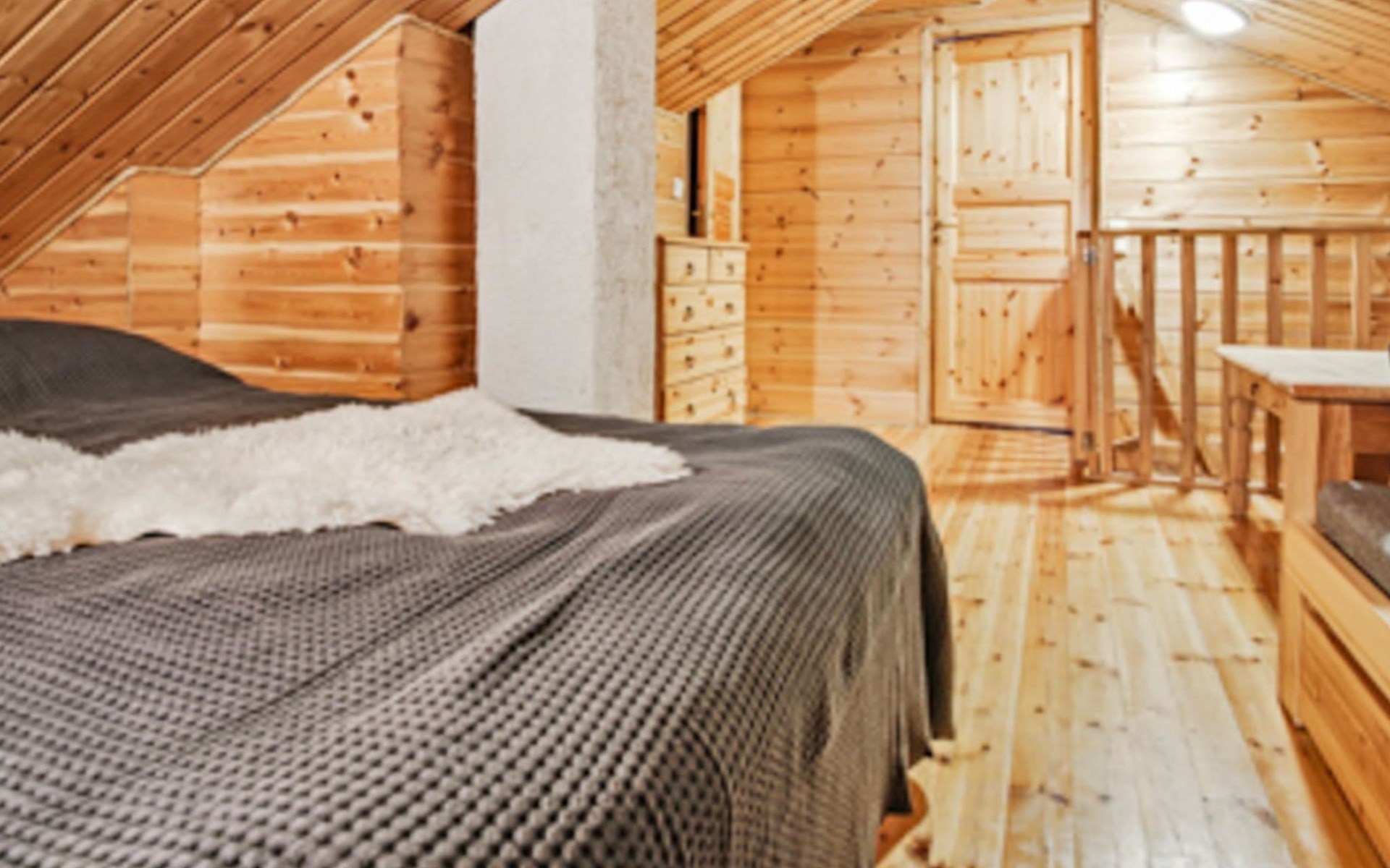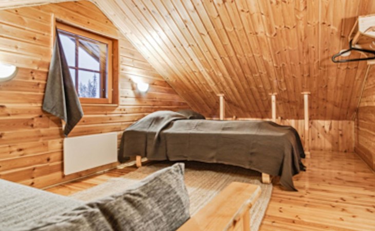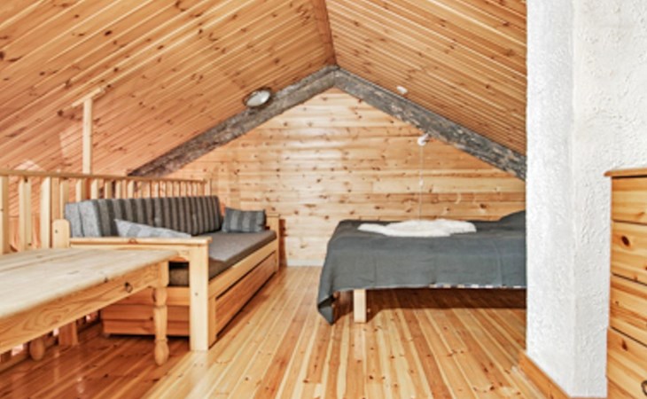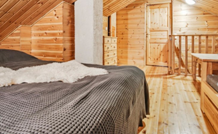 Downstairs: living room/kitchen, 1 x bedroom with 2x80 cm beds, toilet, washroom, sauna (electric stove) and fireplace.