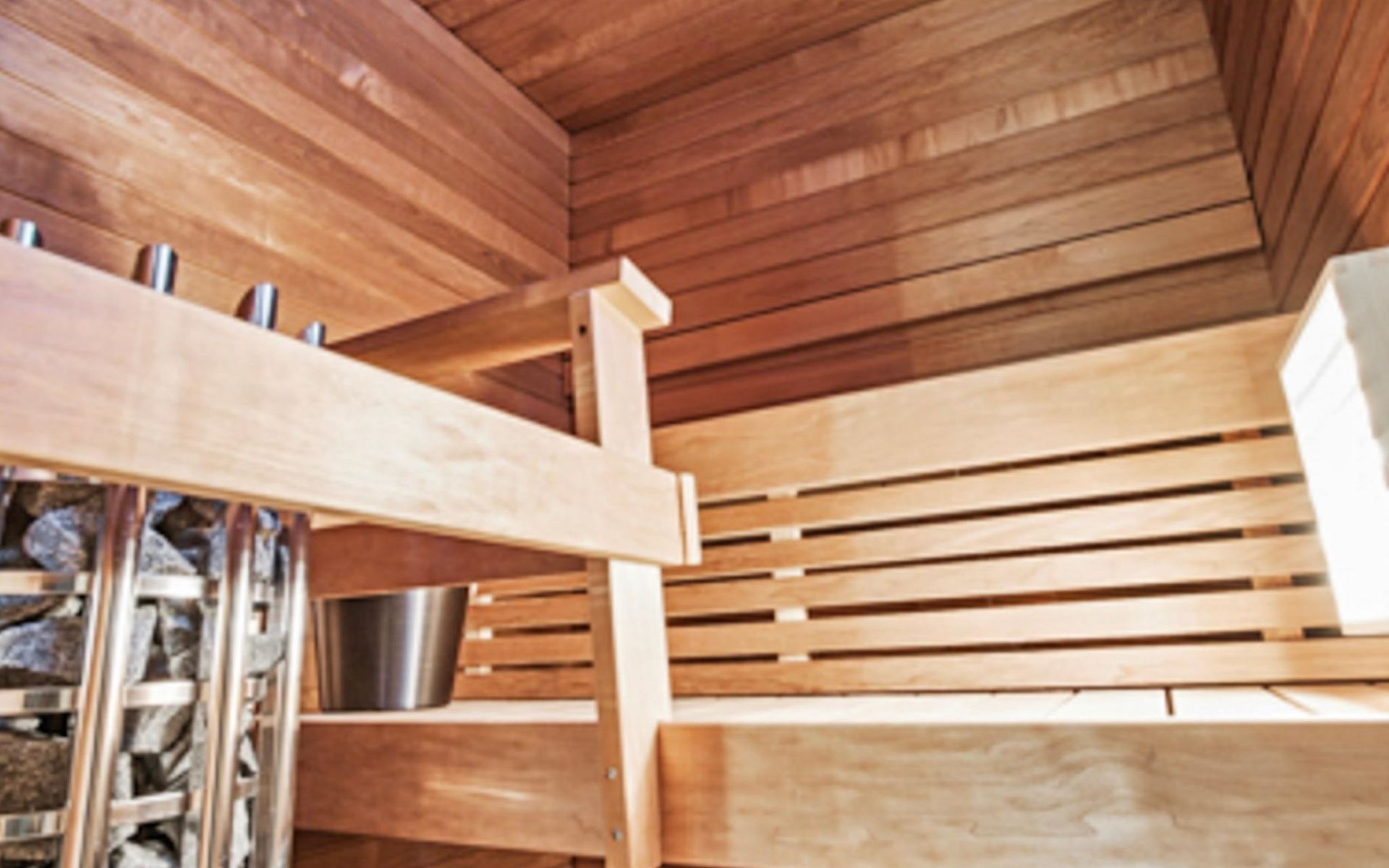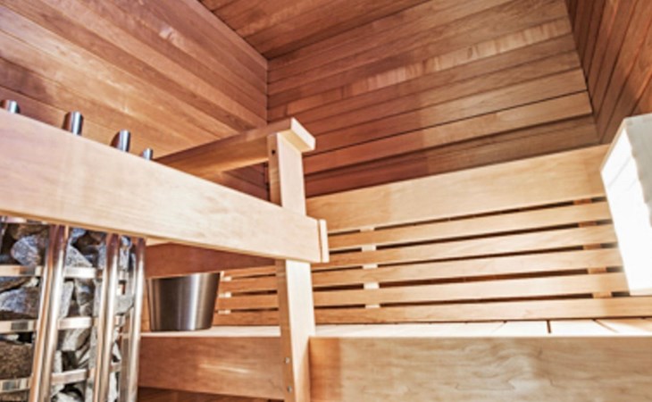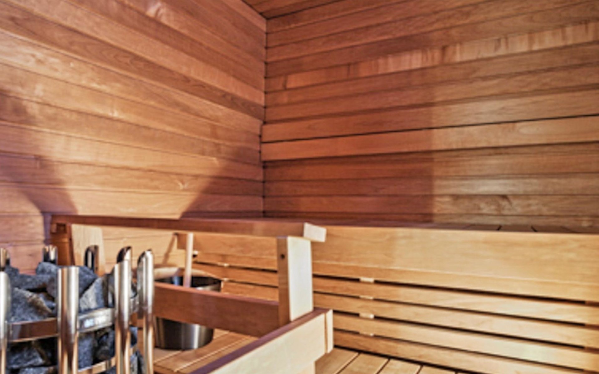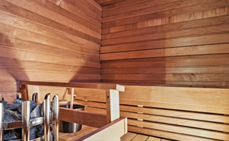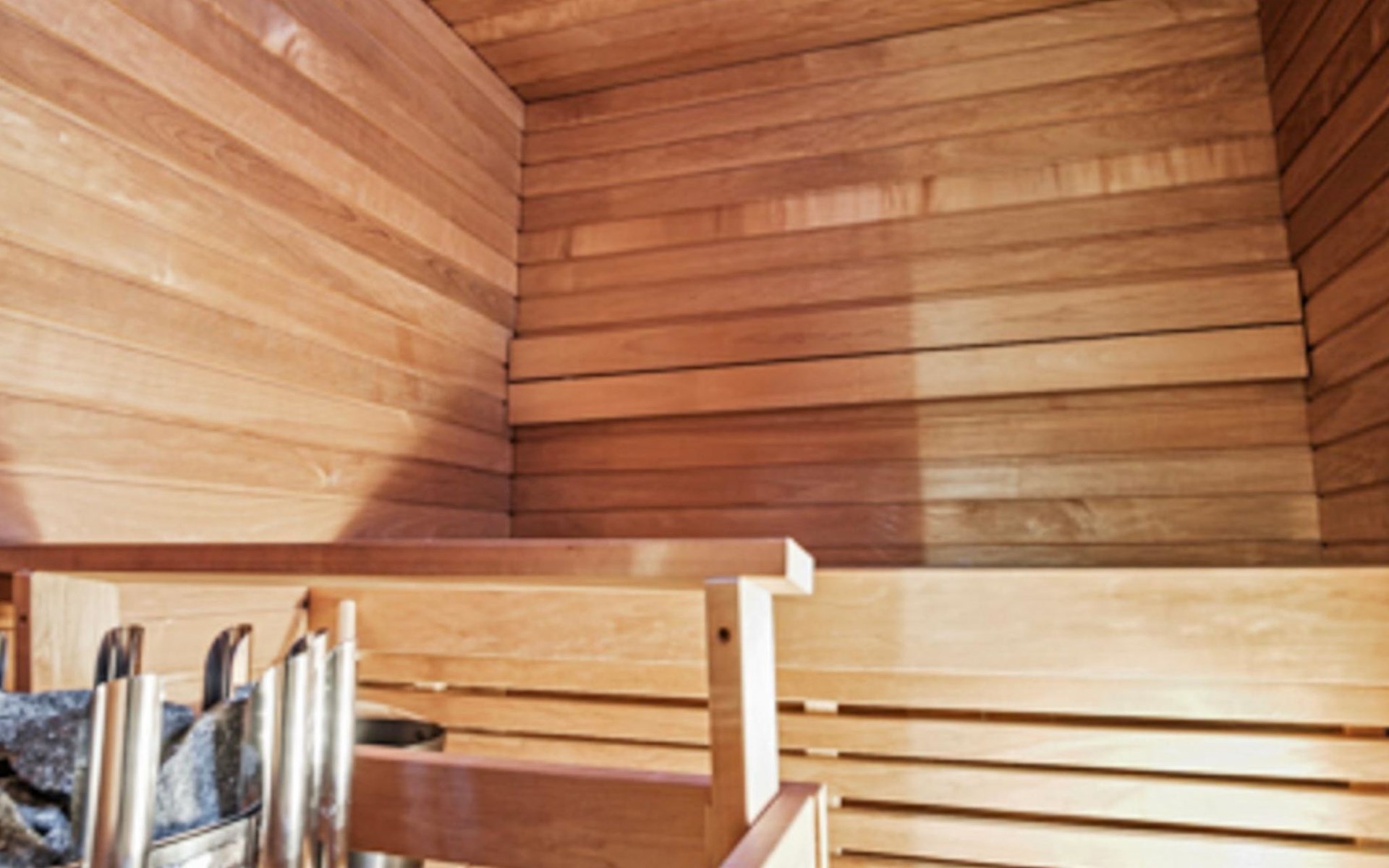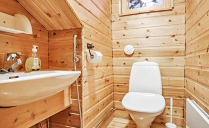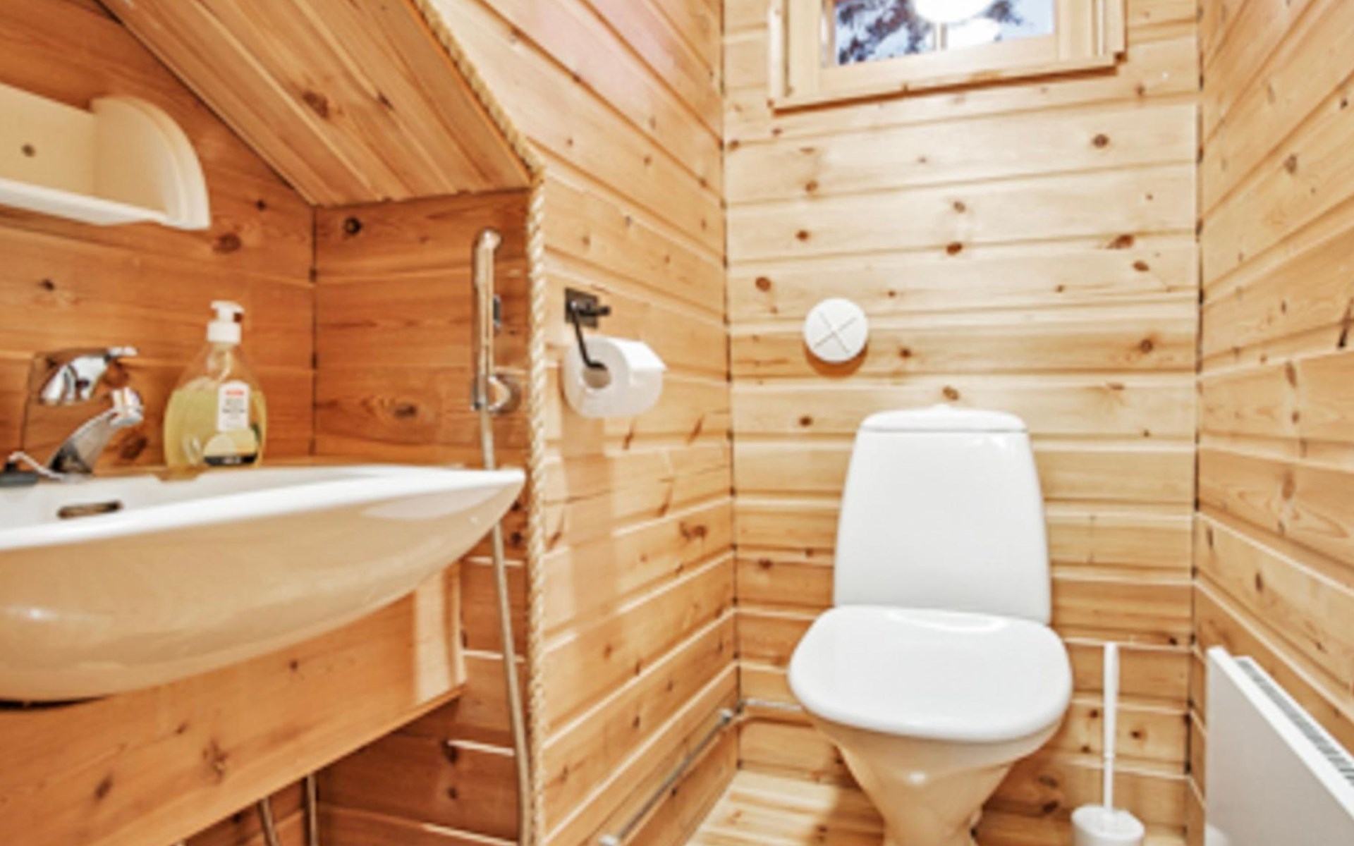 Downstairs: living room/kitchen, 1 x bedroom with 2x80 cm beds, toilet, washroom, sauna (electric stove) and fireplace.