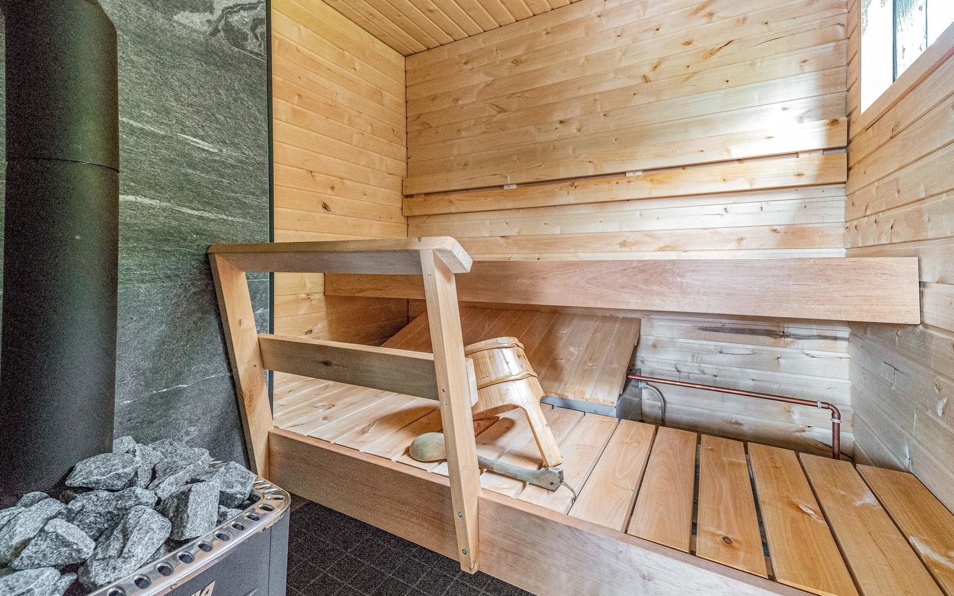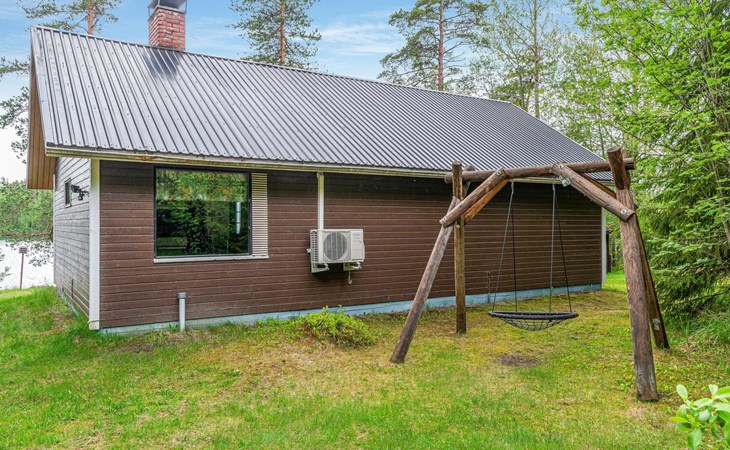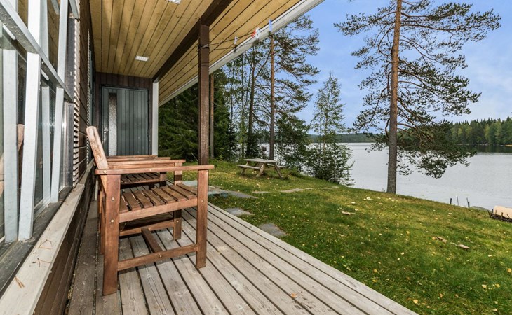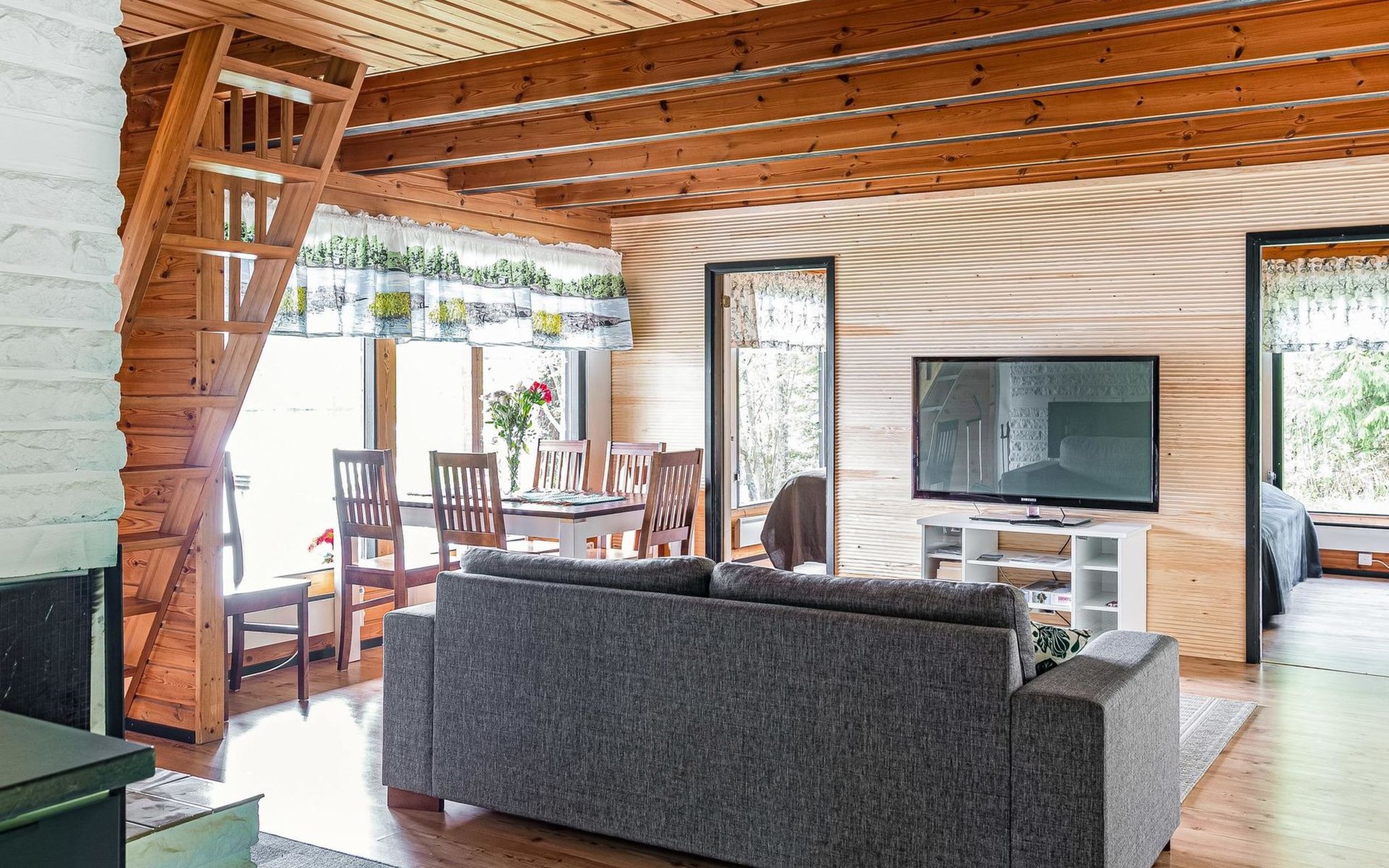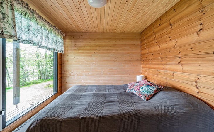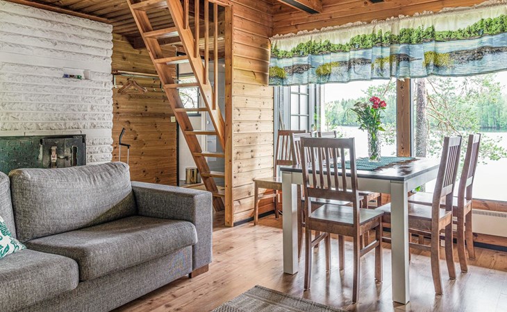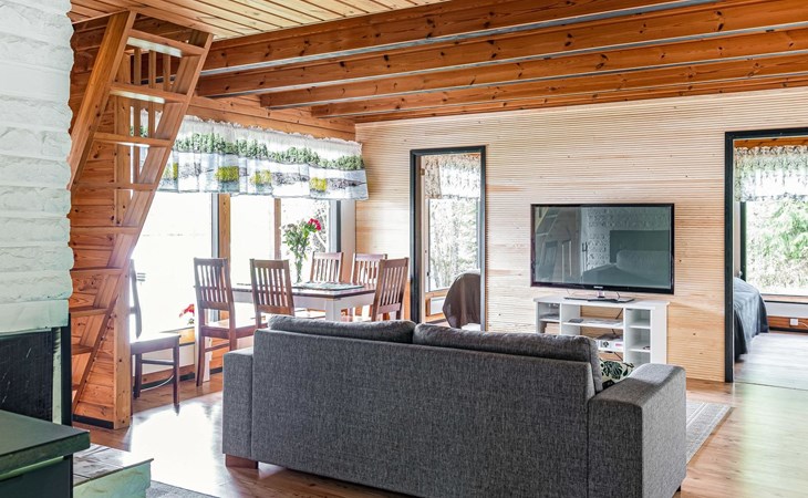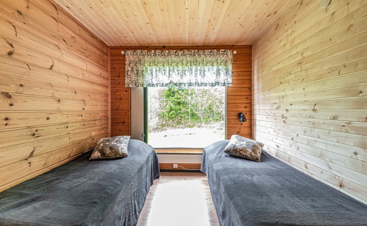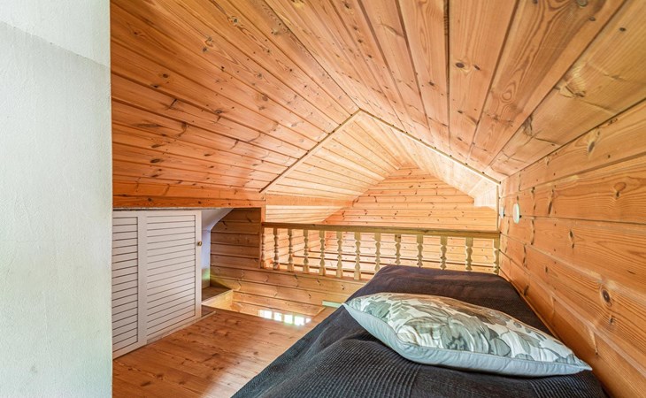 Wooden cabin 1987, renovated 1993 and 2022. Kitchen/living room, 2 bedrooms (one with double bed, another with 2 single beds), sleeping loft with 2 beds, steep stairs, washroom, sauna, open veranda.