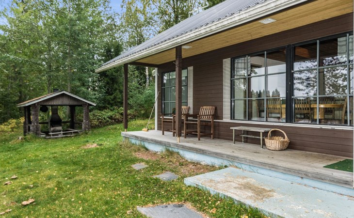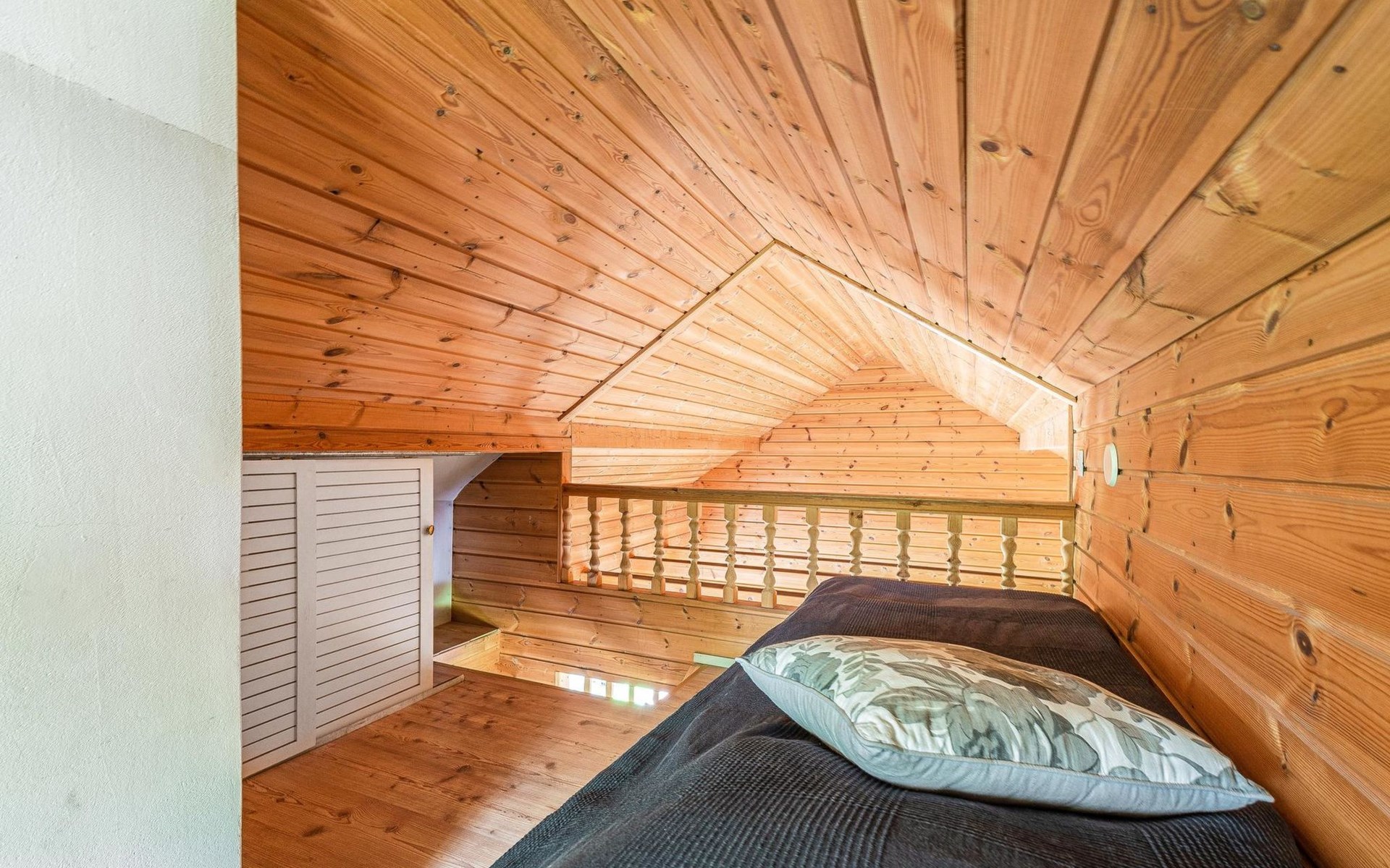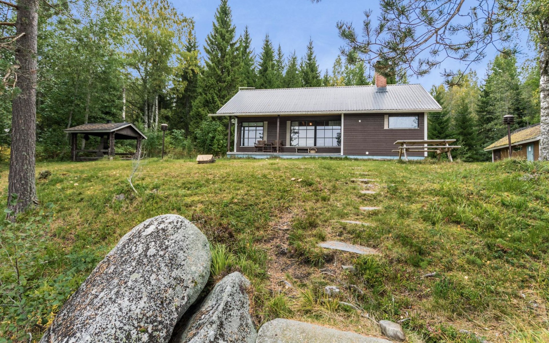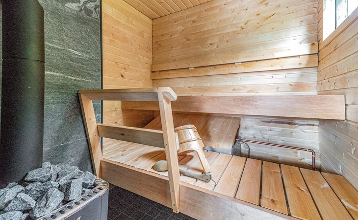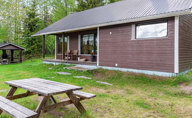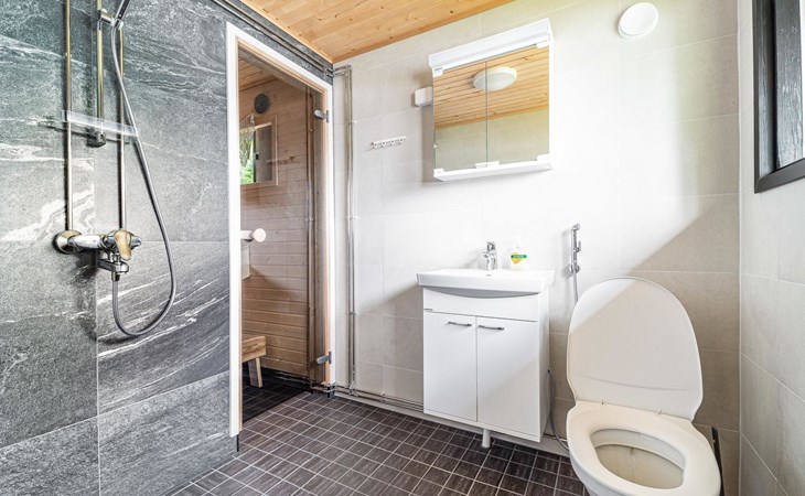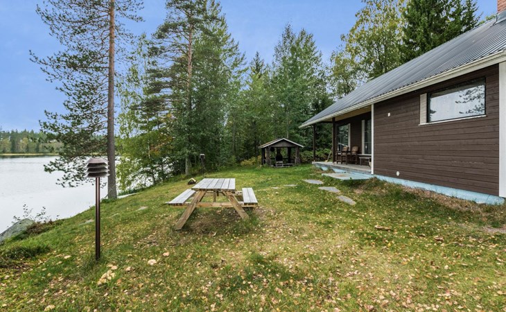 Wooden cabin 1987, renovated 1993 and 2022. Kitchen/living room, 2 bedrooms (one with double bed, another with 2 single beds), sleeping loft with 2 beds, steep stairs, washroom, sauna, open veranda.
