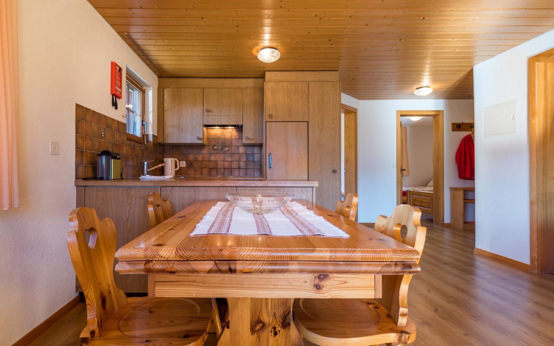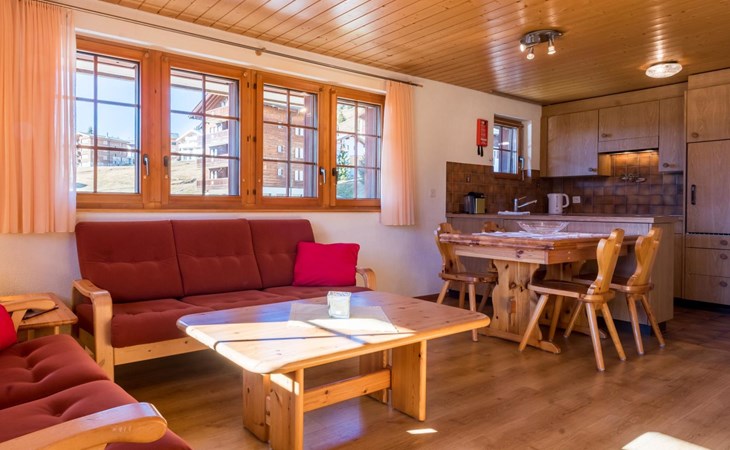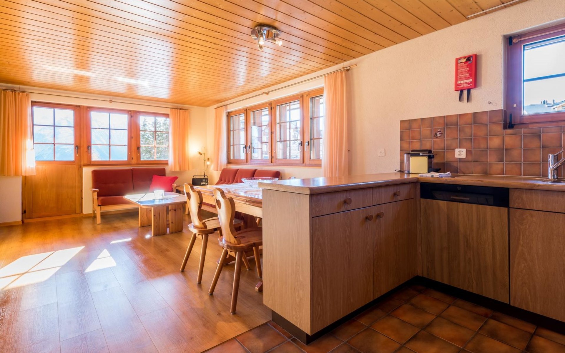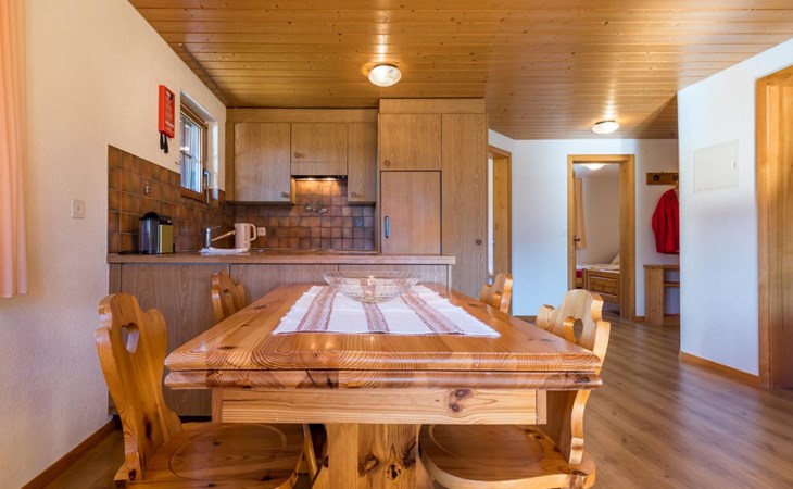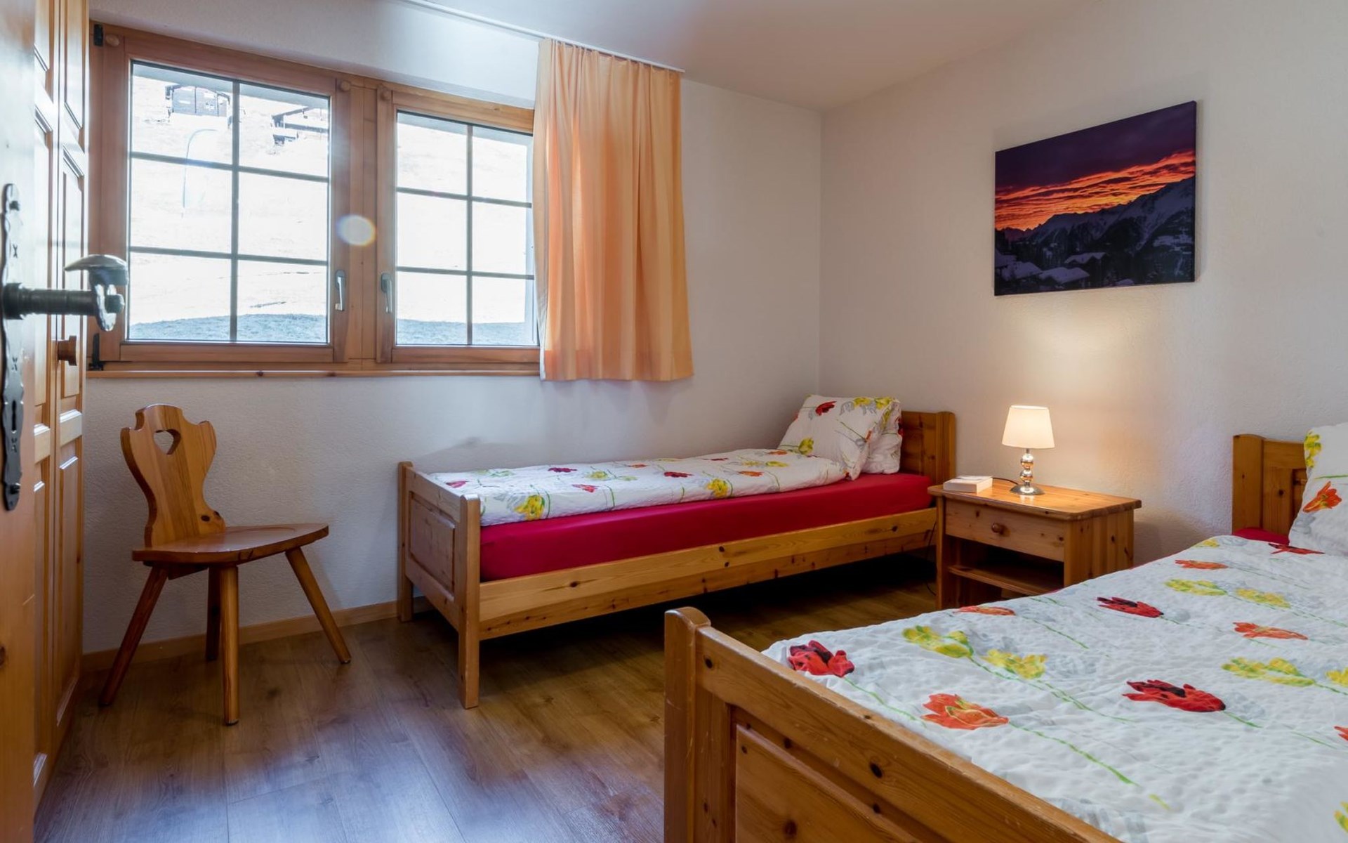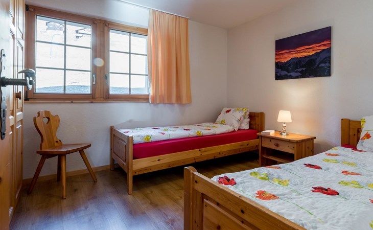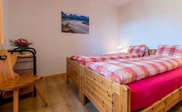 The 3 1/2-room apartment accommodates 1 to 4 guests. It consists of two separate bedrooms, a living area with a kitchen and two foldable beds, as well as a bathroom. The southwest balcony offers an unobstructed view of the Valais four-thousand-meter peaks. The apartment is well-maintained, very clean, and fully equipped with Wi-Fi, satellite TV, dishwasher, elevator access, as well as a shared washing machine and dryer. In winter, a lockable ski room with a modern shoe drying and disinfection system is available. In summer, a sunbathing lawn with a barbecue area invites you to linger. All apartments are non-smoking apartments.