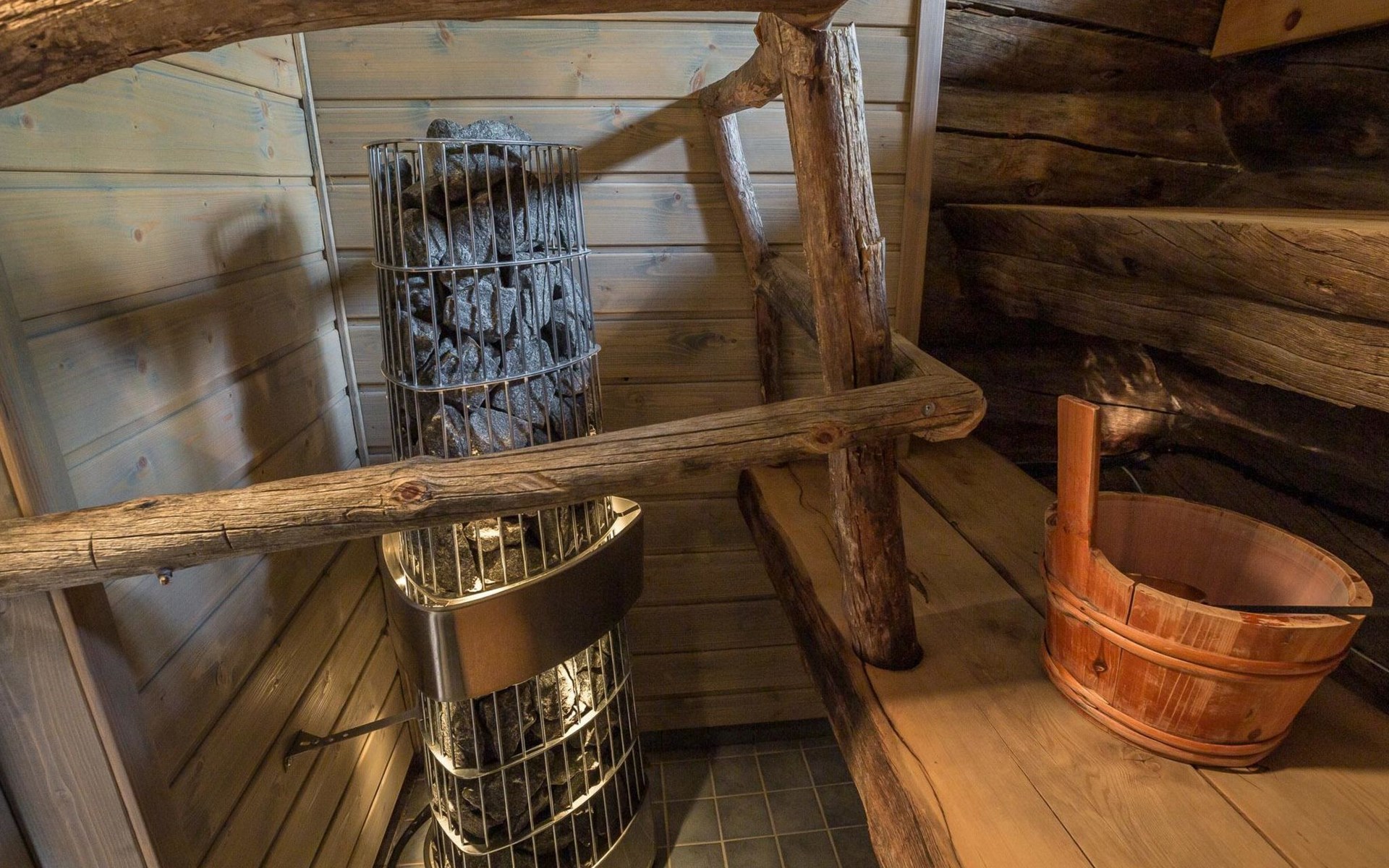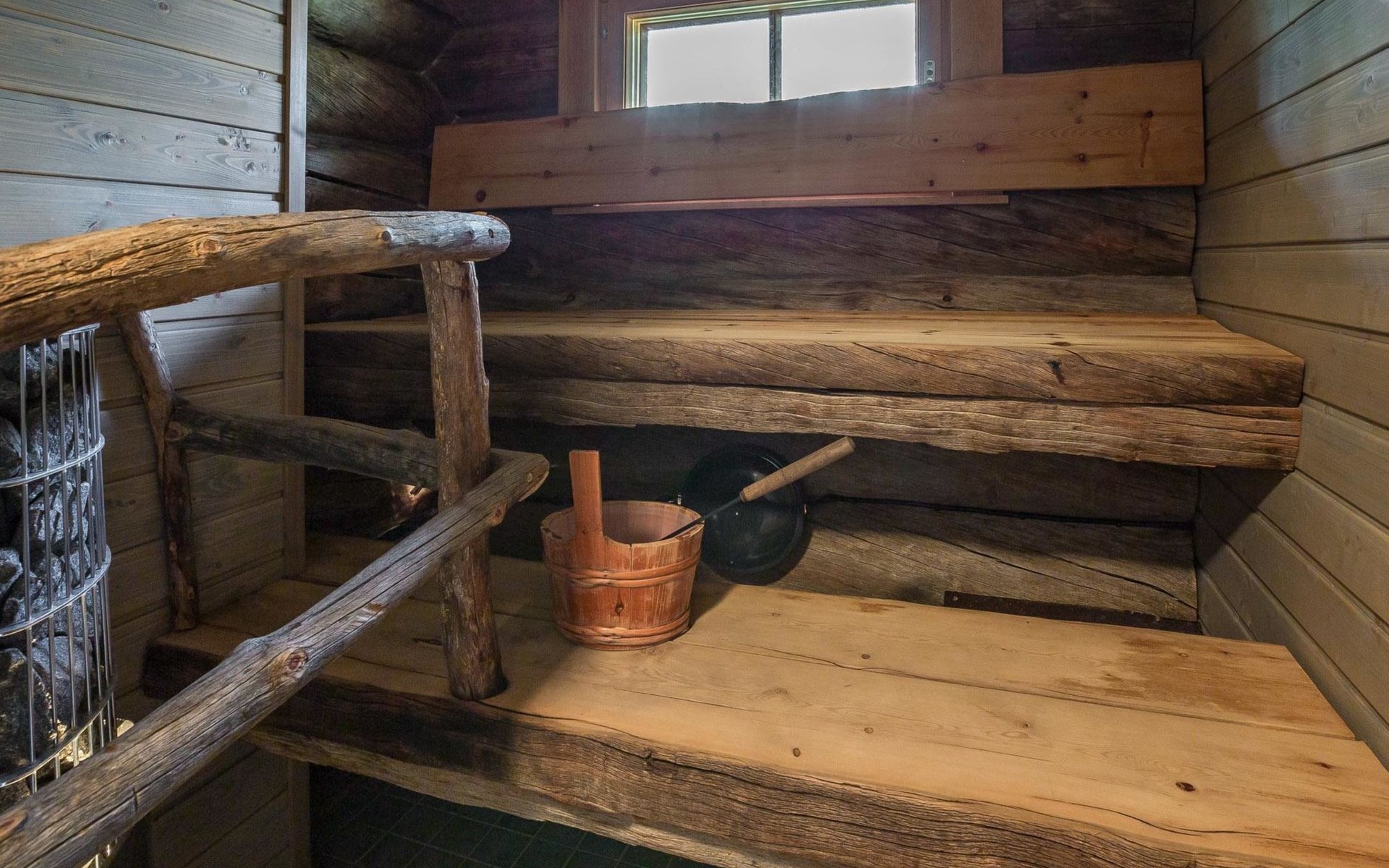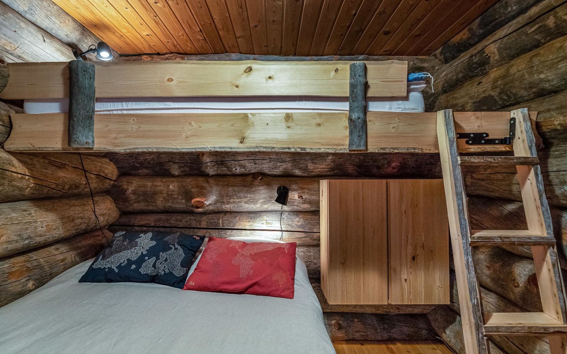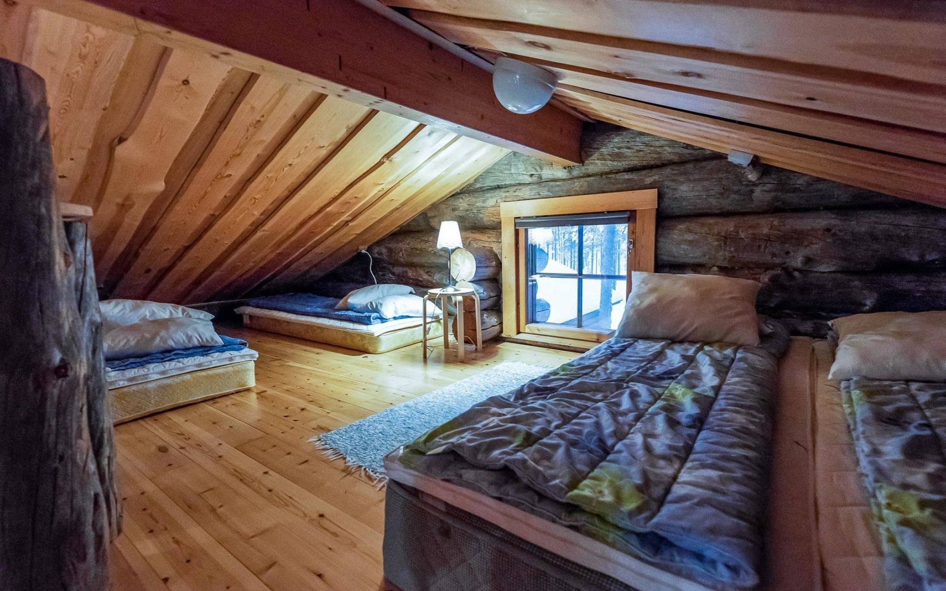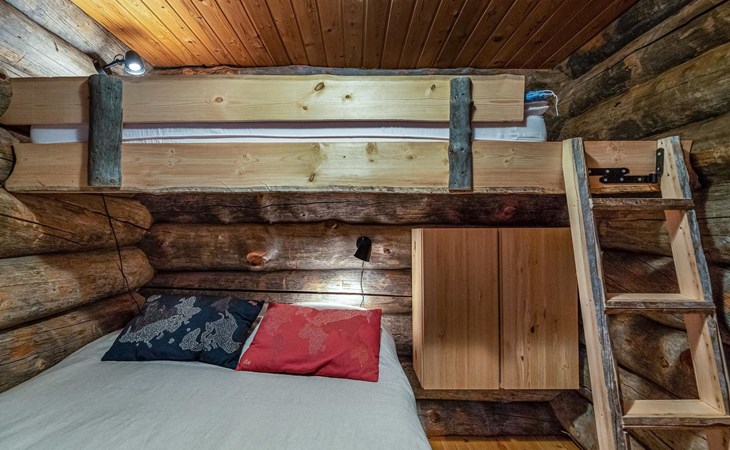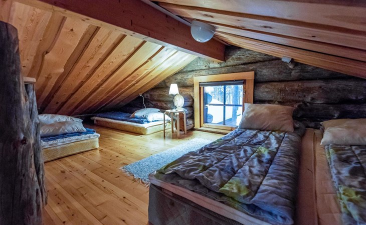 There is plenty of accommodation. One bedroom with a double bed and a 80 cm wide loft bed complement. The second bedroom has a double bed, and a sound- and light-insulating acoustic curtain provides privacy (the room does not have a door). In addition, there are four mattresses in the loft (14 m²), which provide comfortable sleeping places. The cottage has an electric sauna, separate washroom, toilet and practical storage.