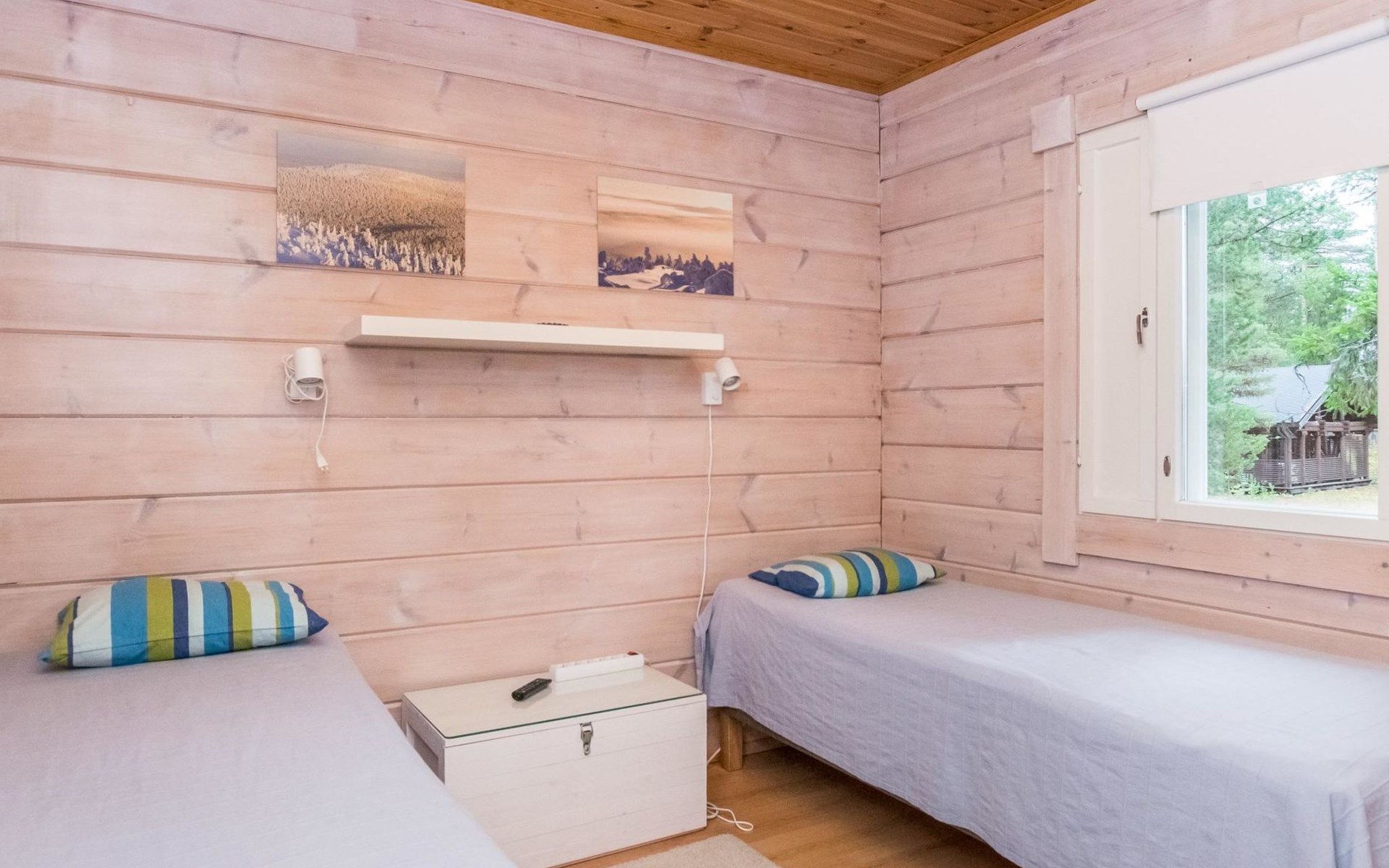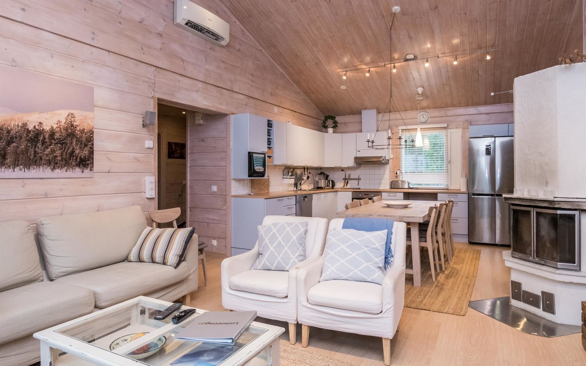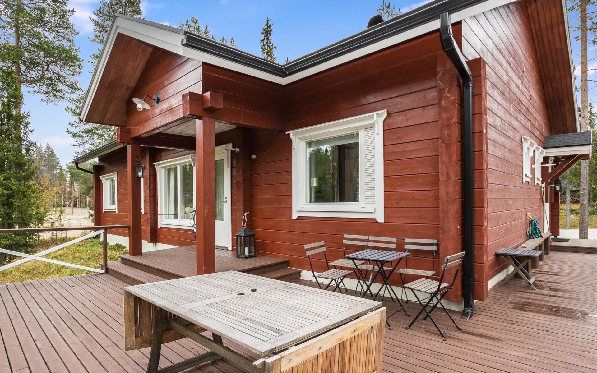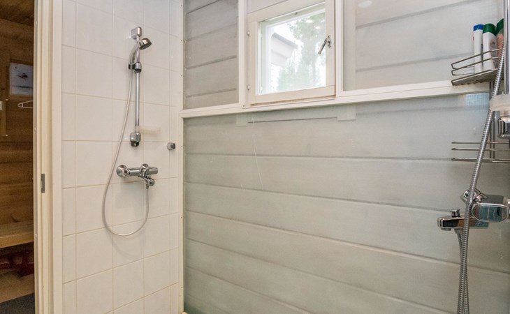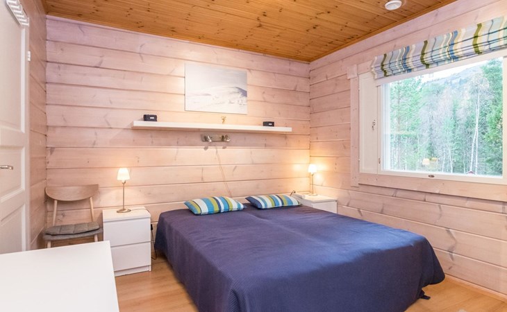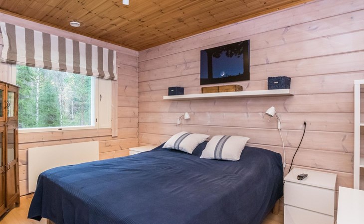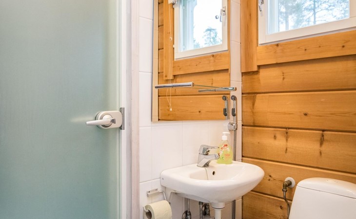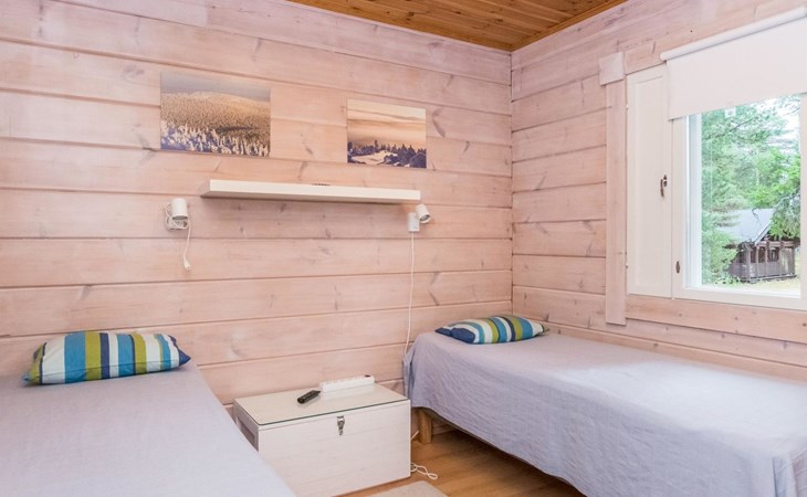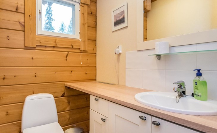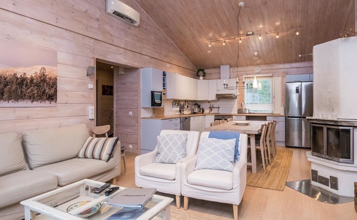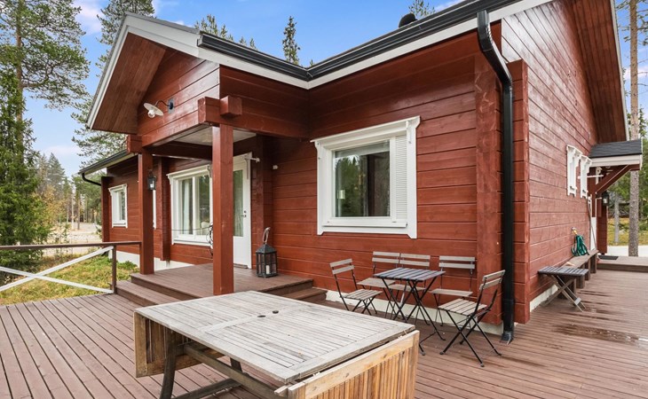 Living room, big kitchen, 4 bedrooms with two separate beds (80*200cm) in each. One bedroom has its own toilet. There is another toilet in the entry. Utility room, bathroom with two showers, sauna with electric and wooden stove, big terrace with outdoor furniture. There are also two extra beds in the cabin.