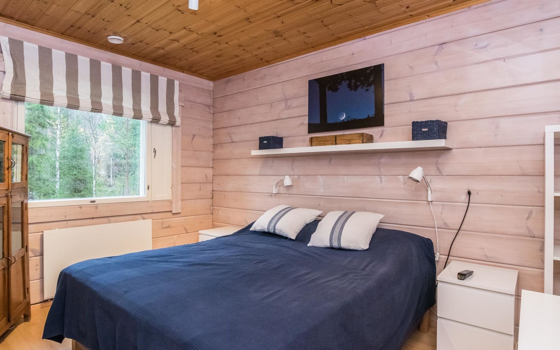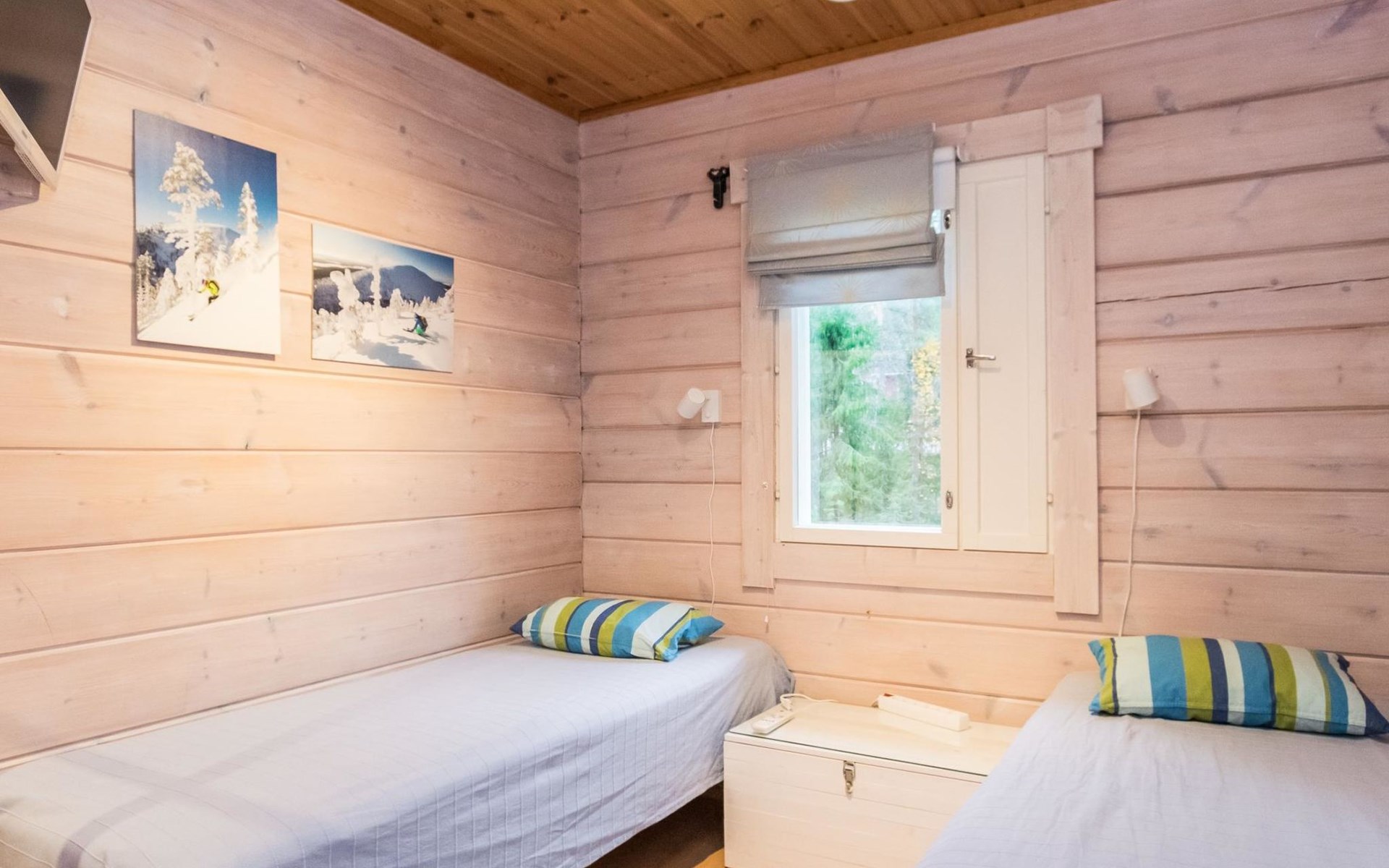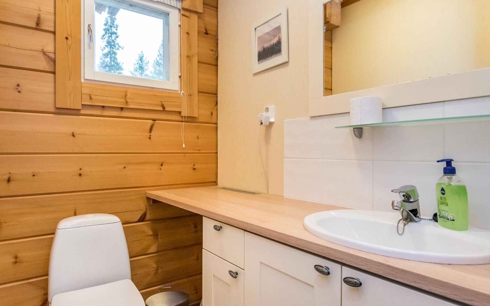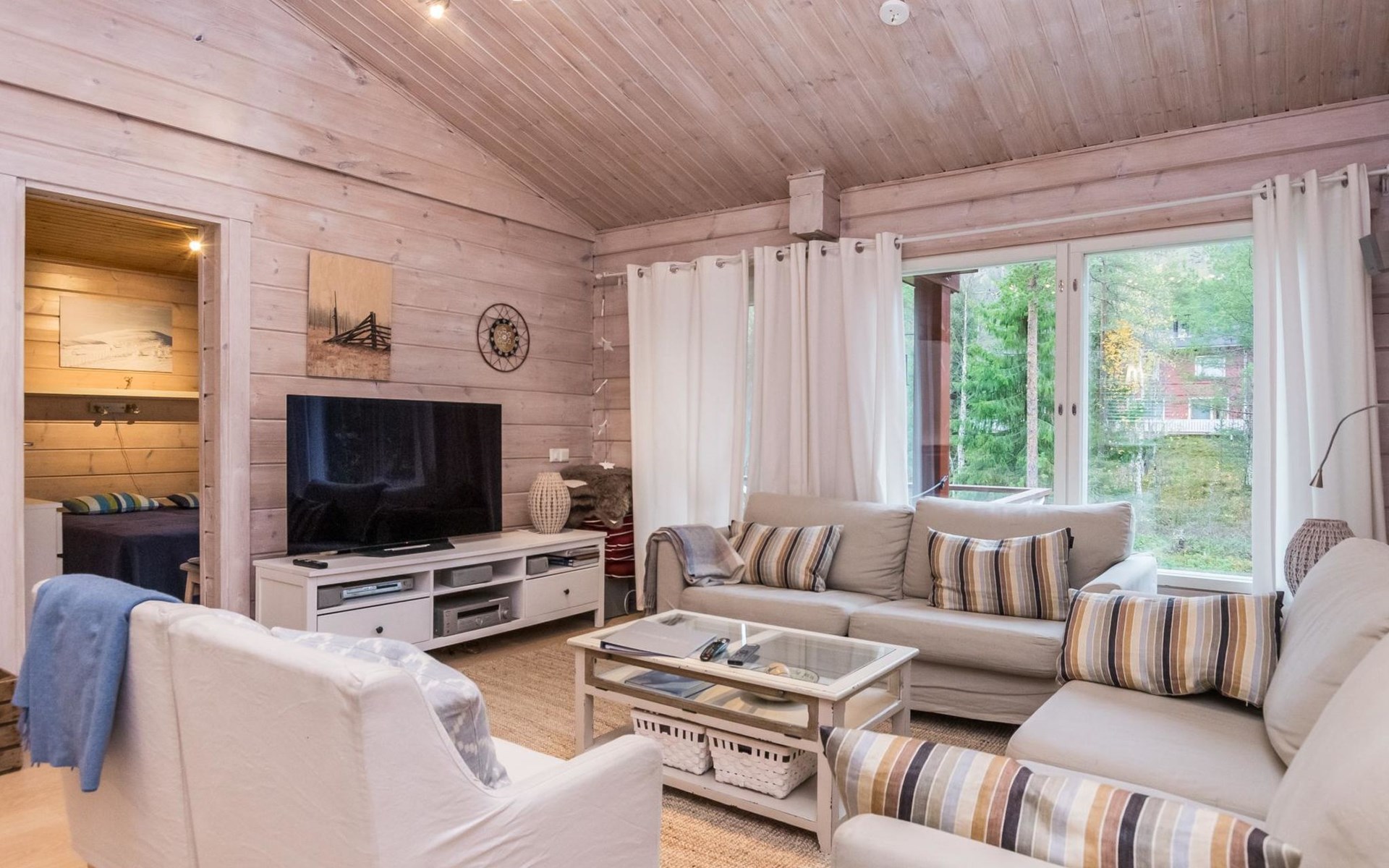 Living room, big kitchen, 4 bedrooms with two separate beds (80*200cm) in each. One bedroom has its own toilet. There is another toilet in the entry. Utility room, bathroom with two showers, sauna with electric and wooden stove, big terrace with outdoor furniture. There are also two extra beds in the cabin.