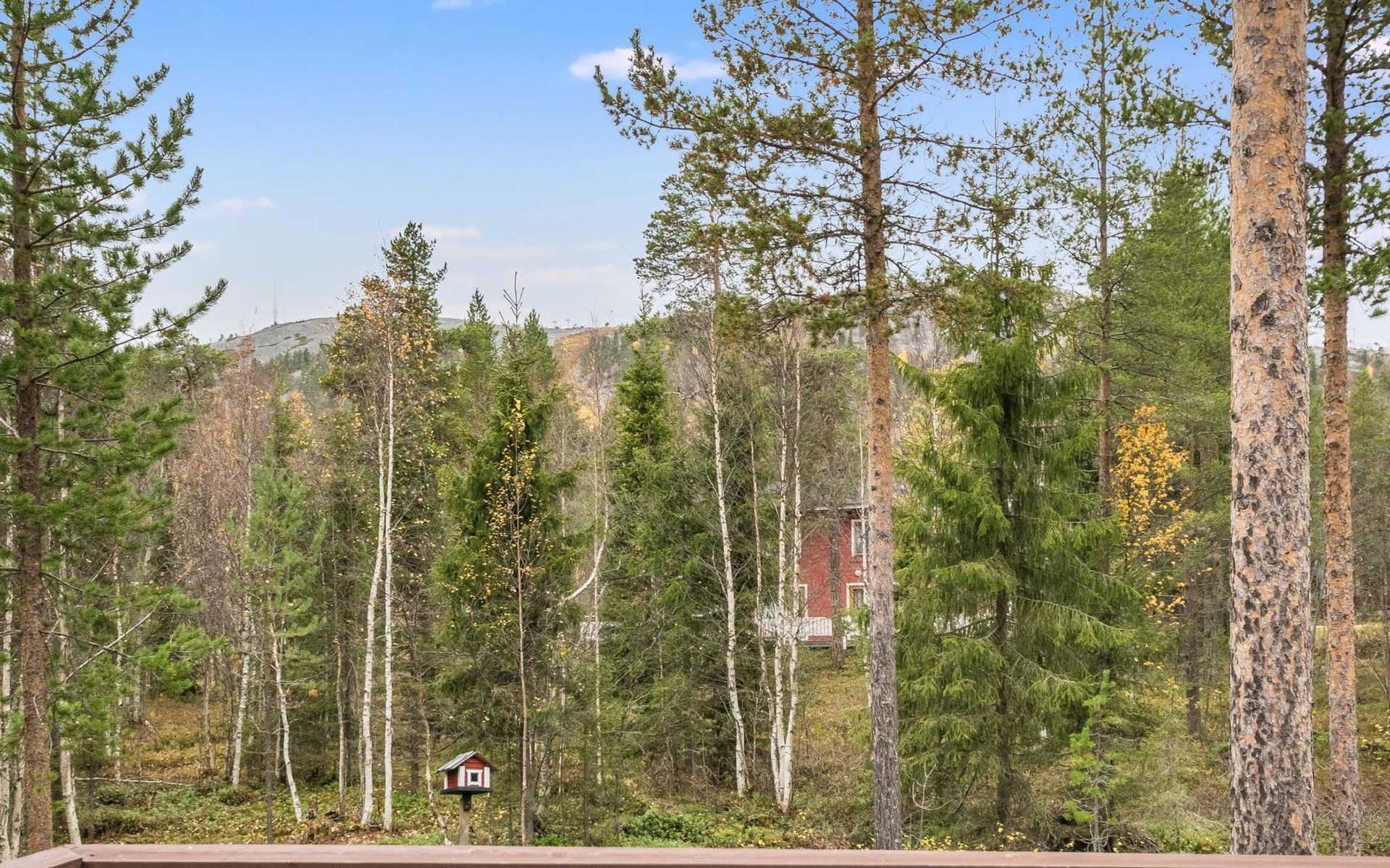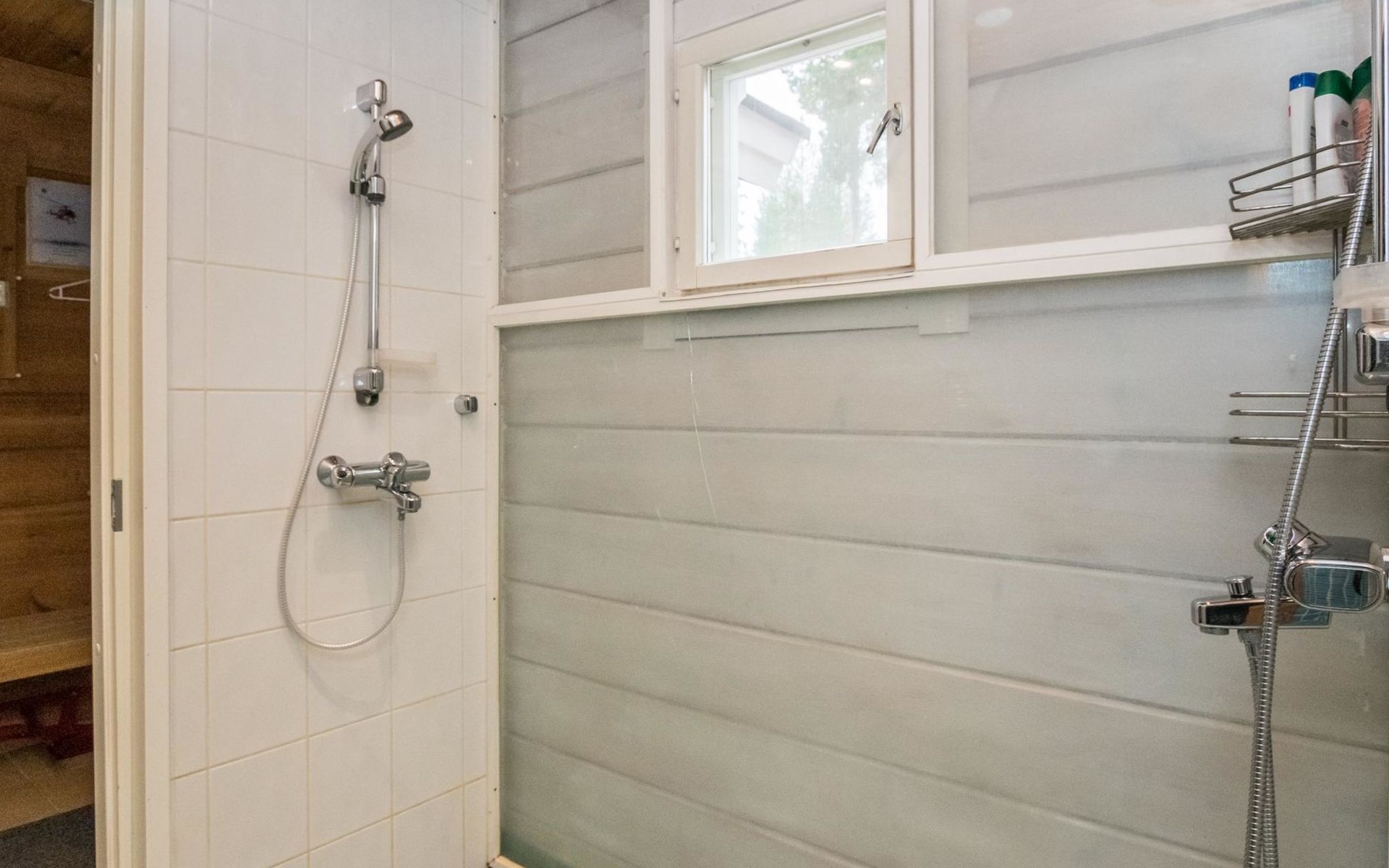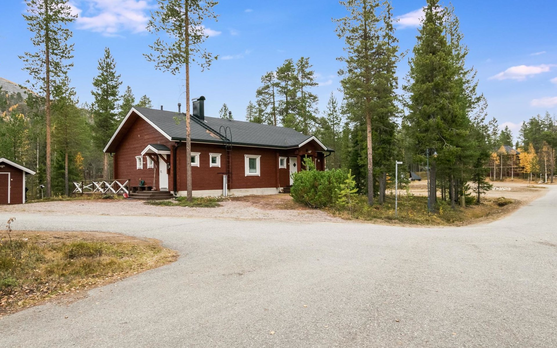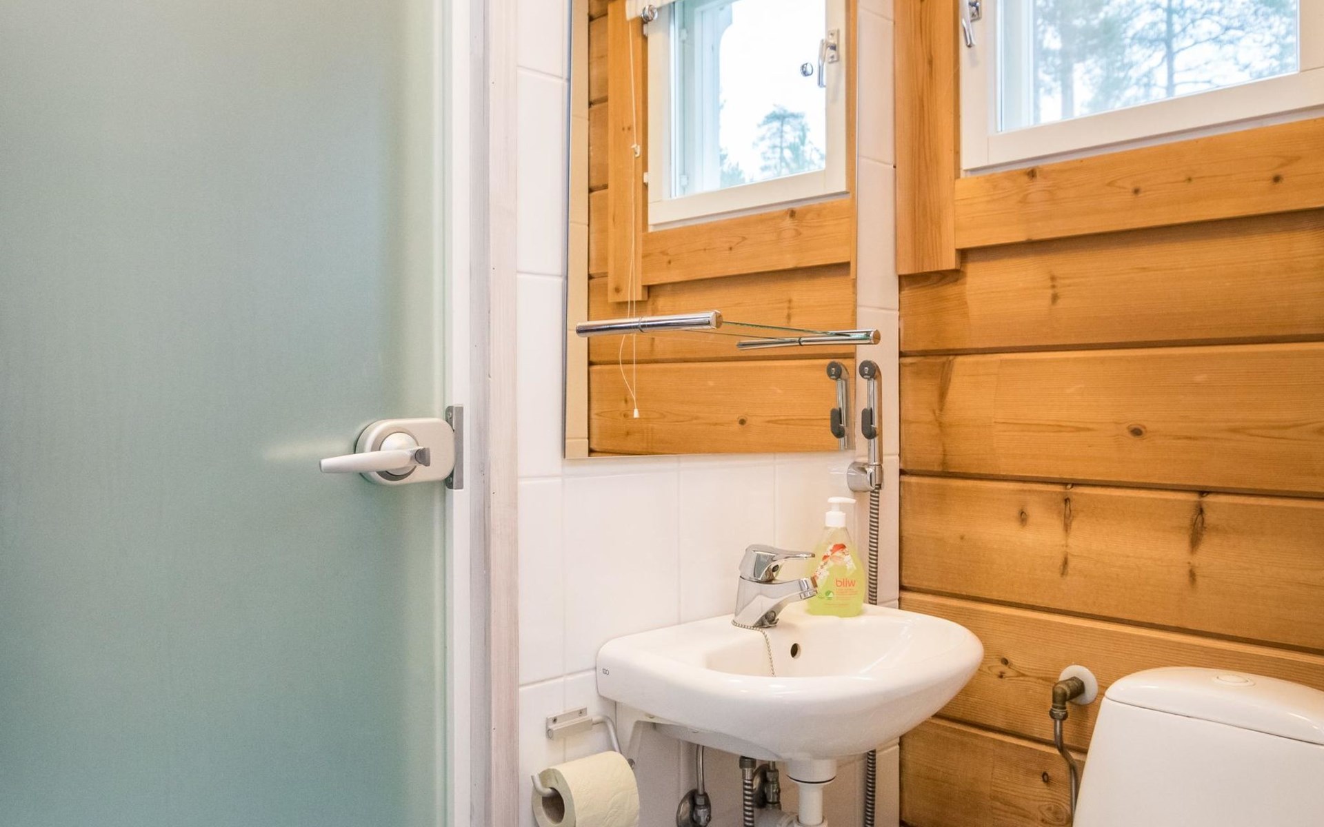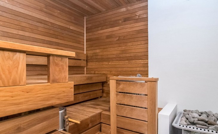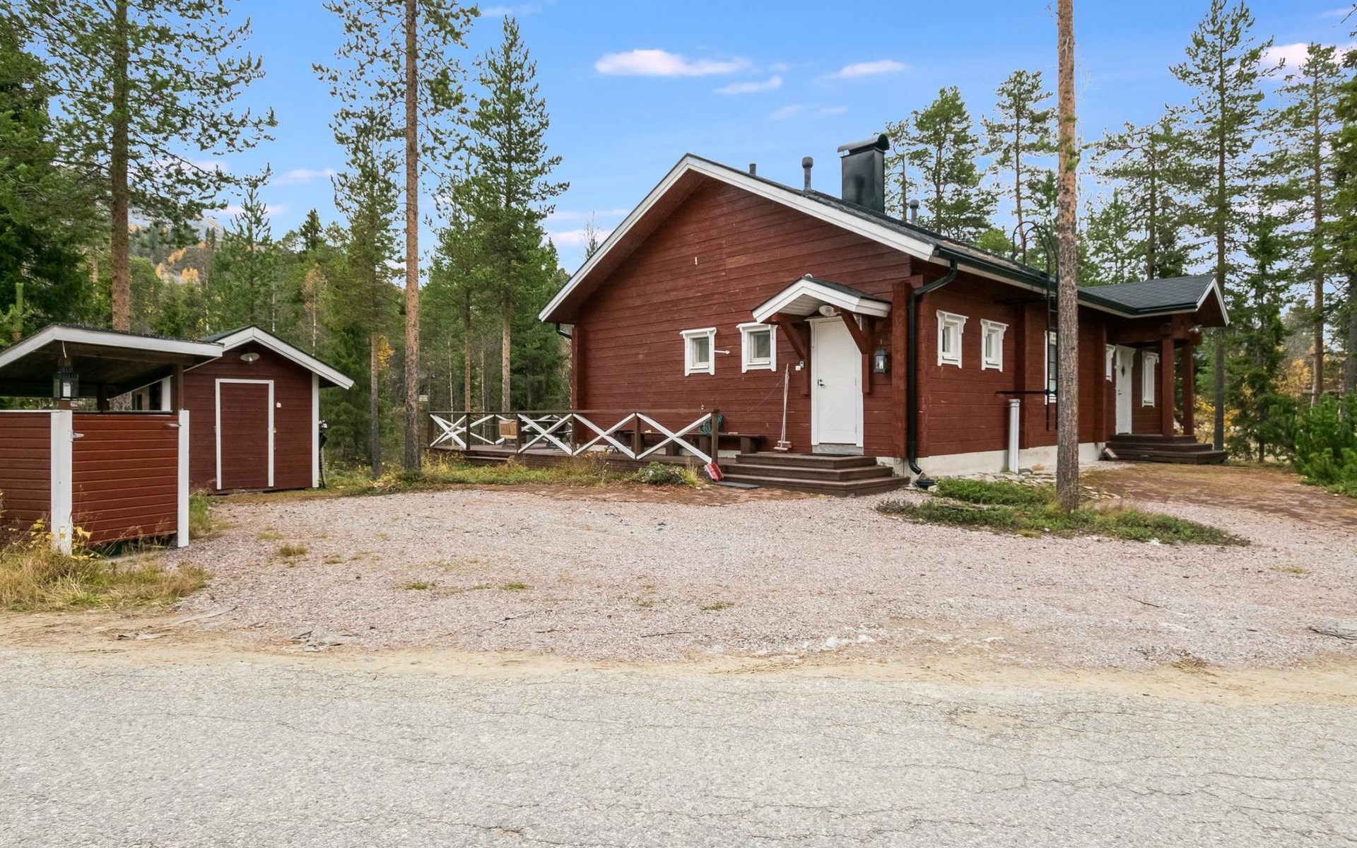 Living room, big kitchen, 4 bedrooms with two separate beds (80*200cm) in each. One bedroom has its own toilet. There is another toilet in the entry. Utility room, bathroom with two showers, sauna with electric and wooden stove, big terrace with outdoor furniture. There are also two extra beds in the cabin.