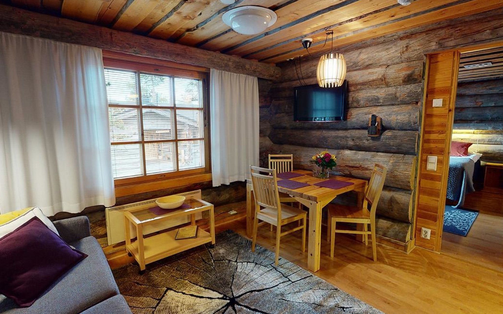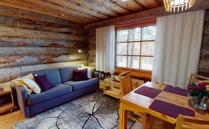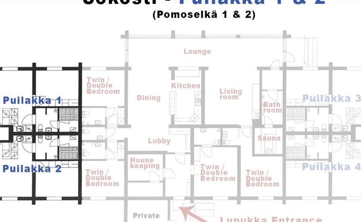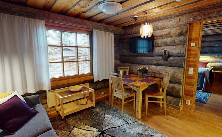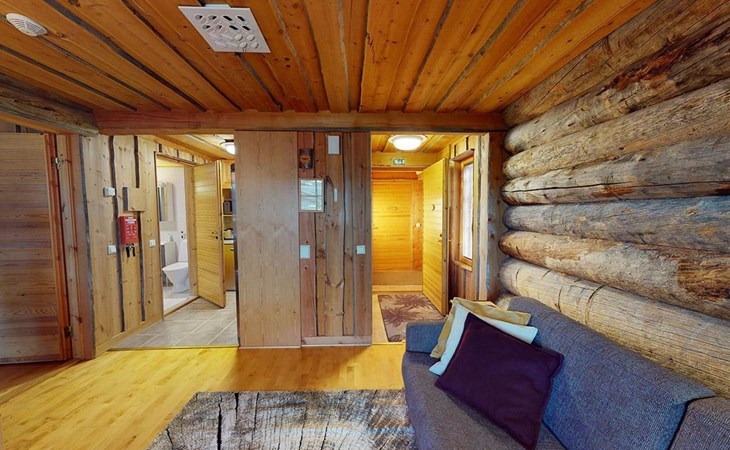 The 44-square-meter apartment has a kitchen/living room, a bedroom, a washroom/toilet and a sauna. In the courtyard building, a shared ski maintenance room for the apartments, with a lubrication iron and a table.