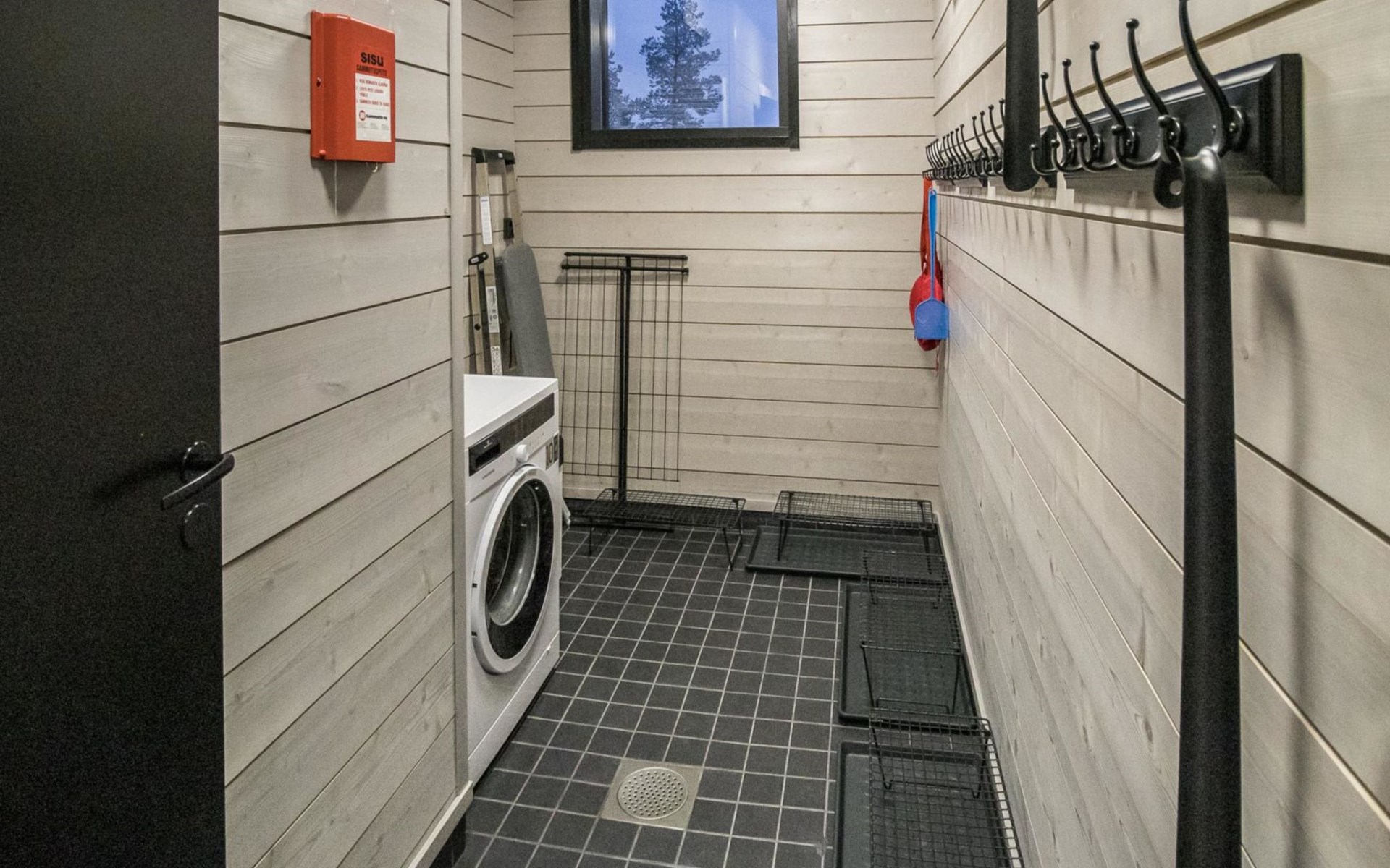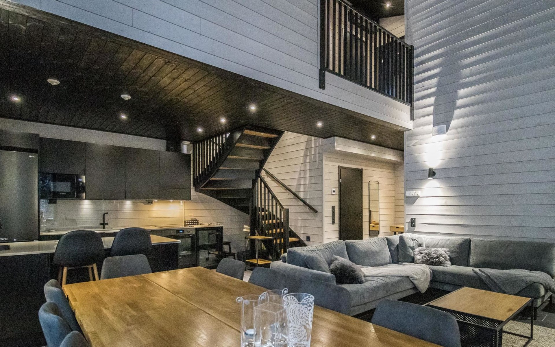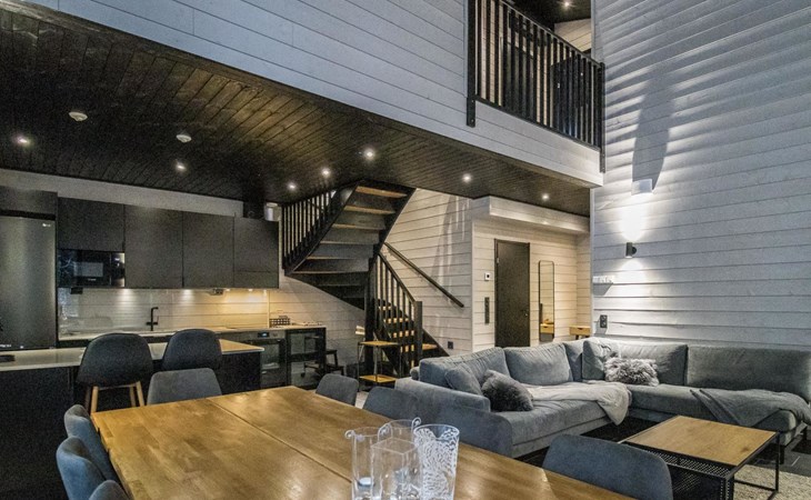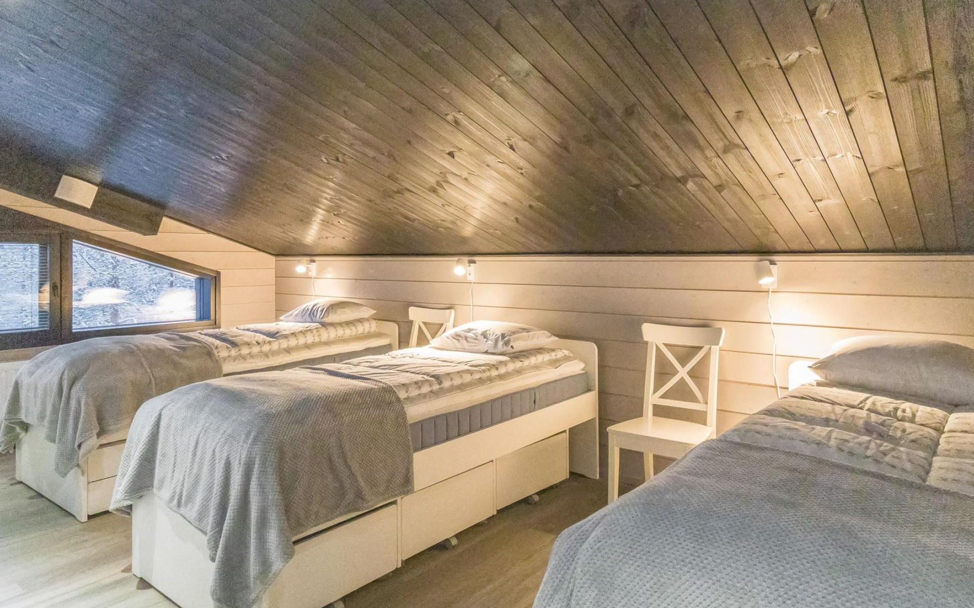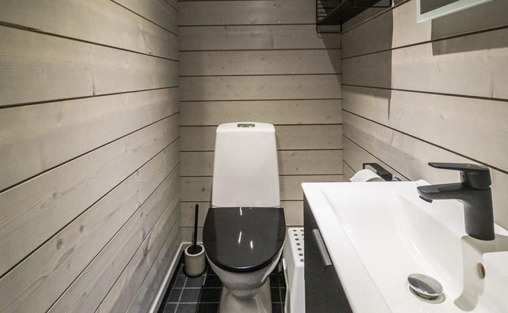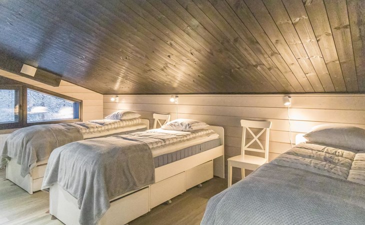 Large living room/kitchen with fireplace. 4 bedrooms, three of them have two box spring beds and the fourth has three box spring beds. Space for 9 people. The third bedroom has two additional beds suitable for children. The extra beds are pulled out from under the box spring beds. 2 WCs, sauna, washroom with two showers and dressing room. Large room for drying and storing clothes and sport equipment. Large 3 0m² terrace with terrace furniture. Air source heat pumps in both floors.