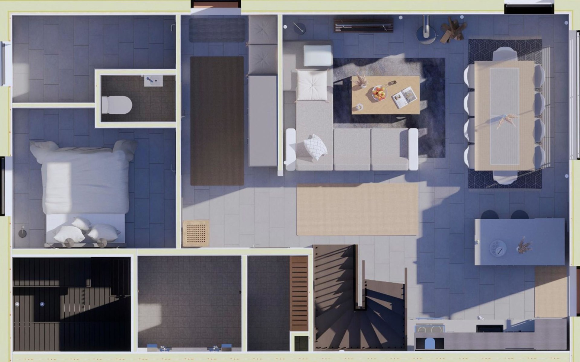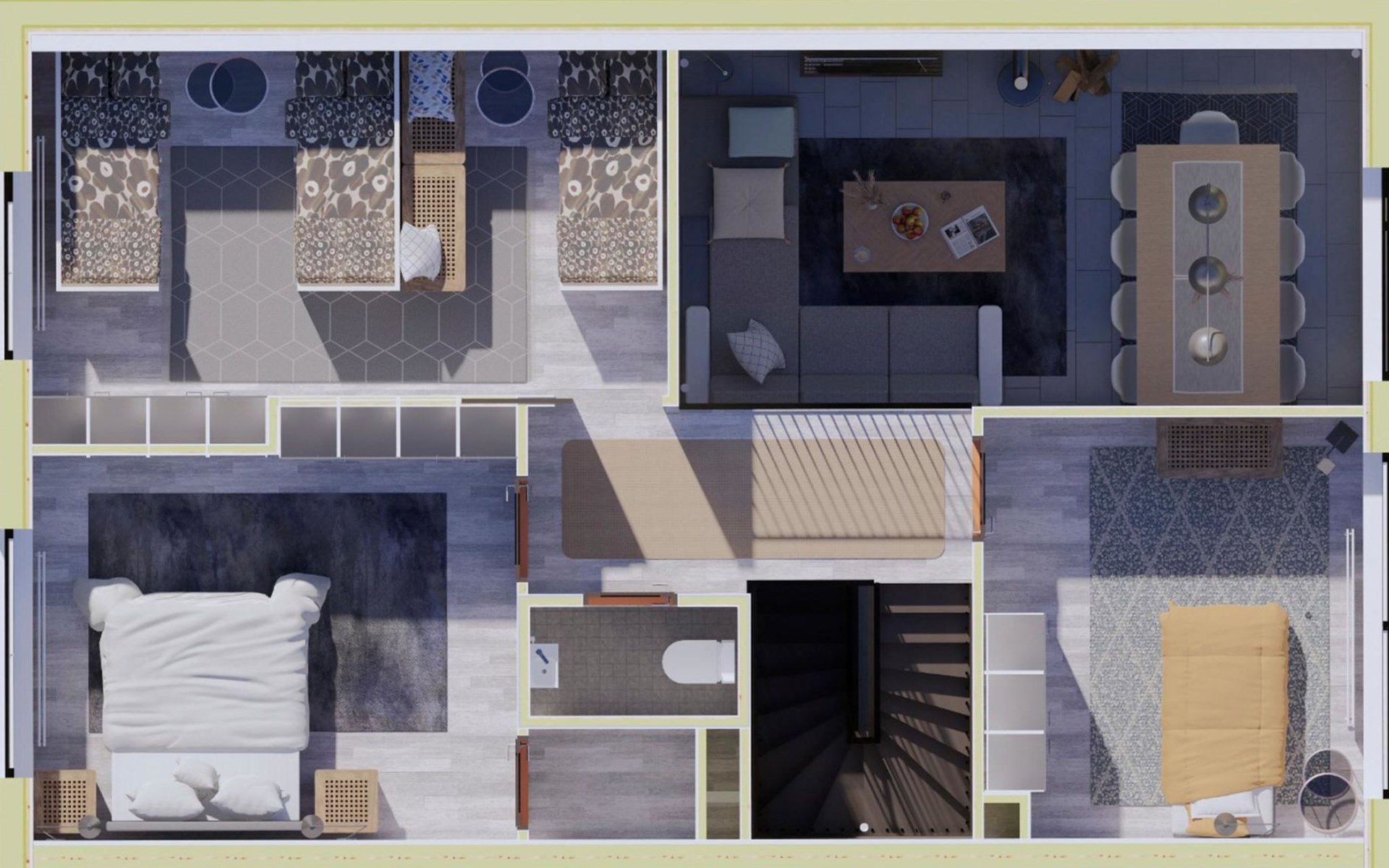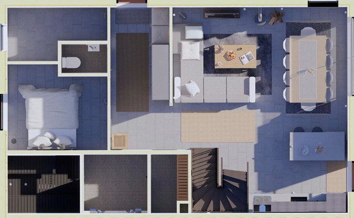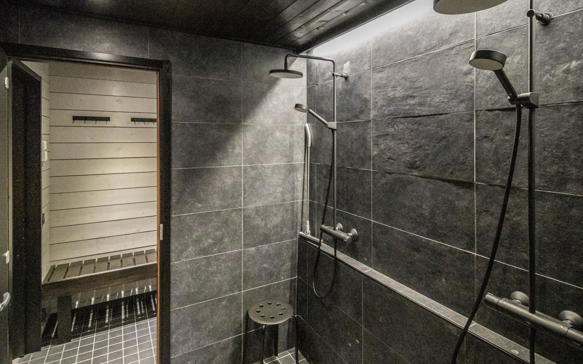 Large living room/kitchen with fireplace. 4 bedrooms, three of them have two box spring beds and the fourth has three box spring beds. Space for 9 people. The third bedroom has two additional beds suitable for children. The extra beds are pulled out from under the box spring beds. 2 WCs, sauna, washroom with two showers and dressing room. Large room for drying and storing clothes and sport equipment. Large 3 0m² terrace with terrace furniture. Air source heat pumps in both floors.
