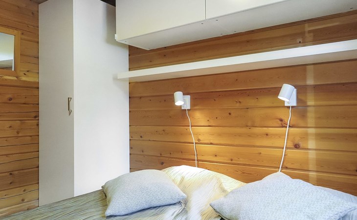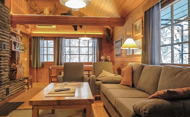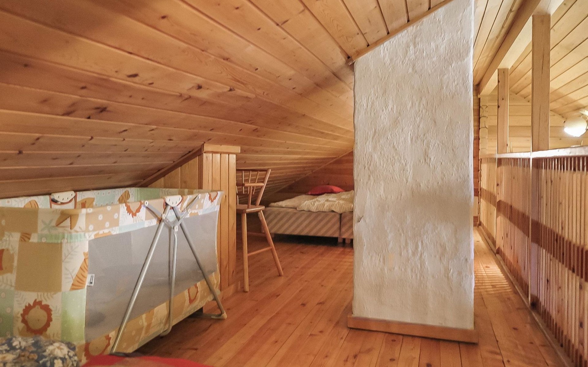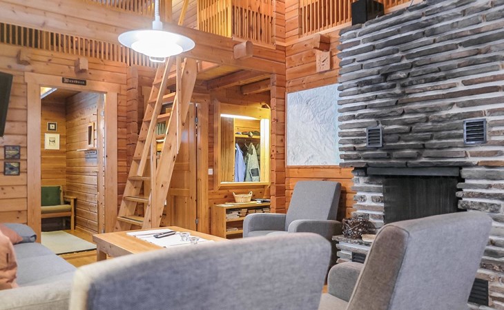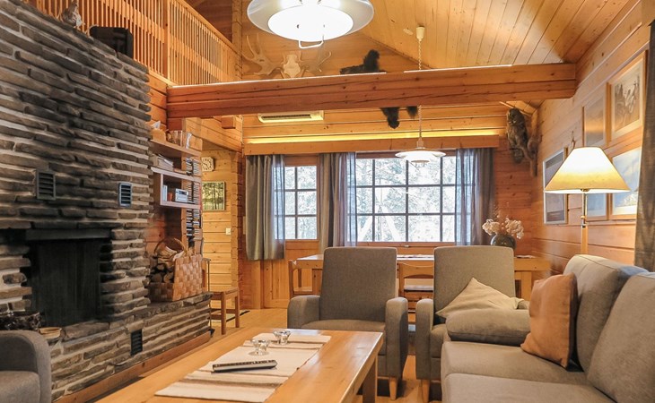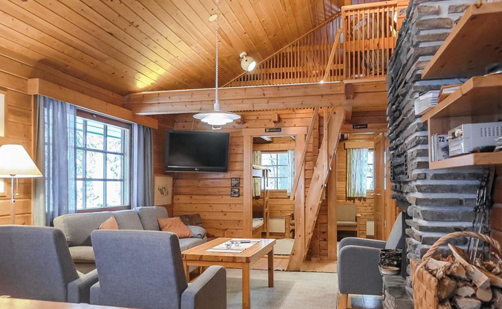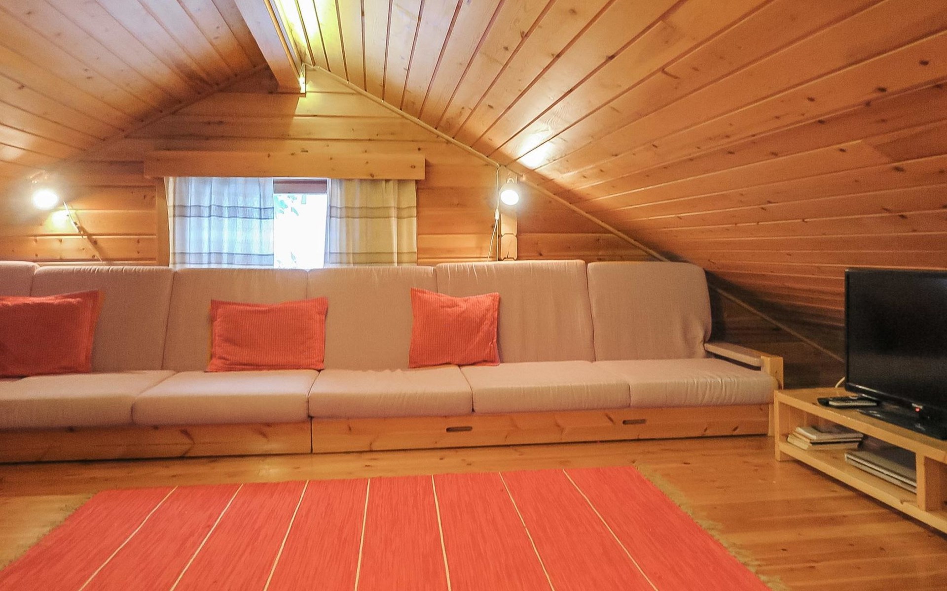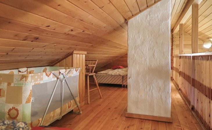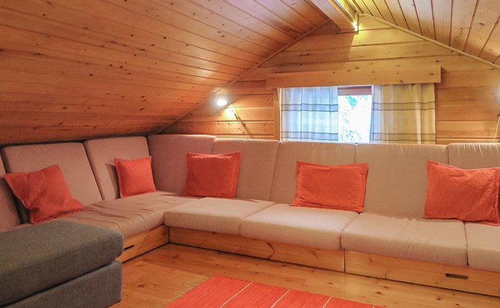 A living room, spacious kitchenette, three bedrooms all with 2 beds, spacious loft with 3 beds and a large corner sofa, steep stairs to the loft, sauna, washroom, dressing room, separate WC and covered terrace on southern/western side of the cabin.