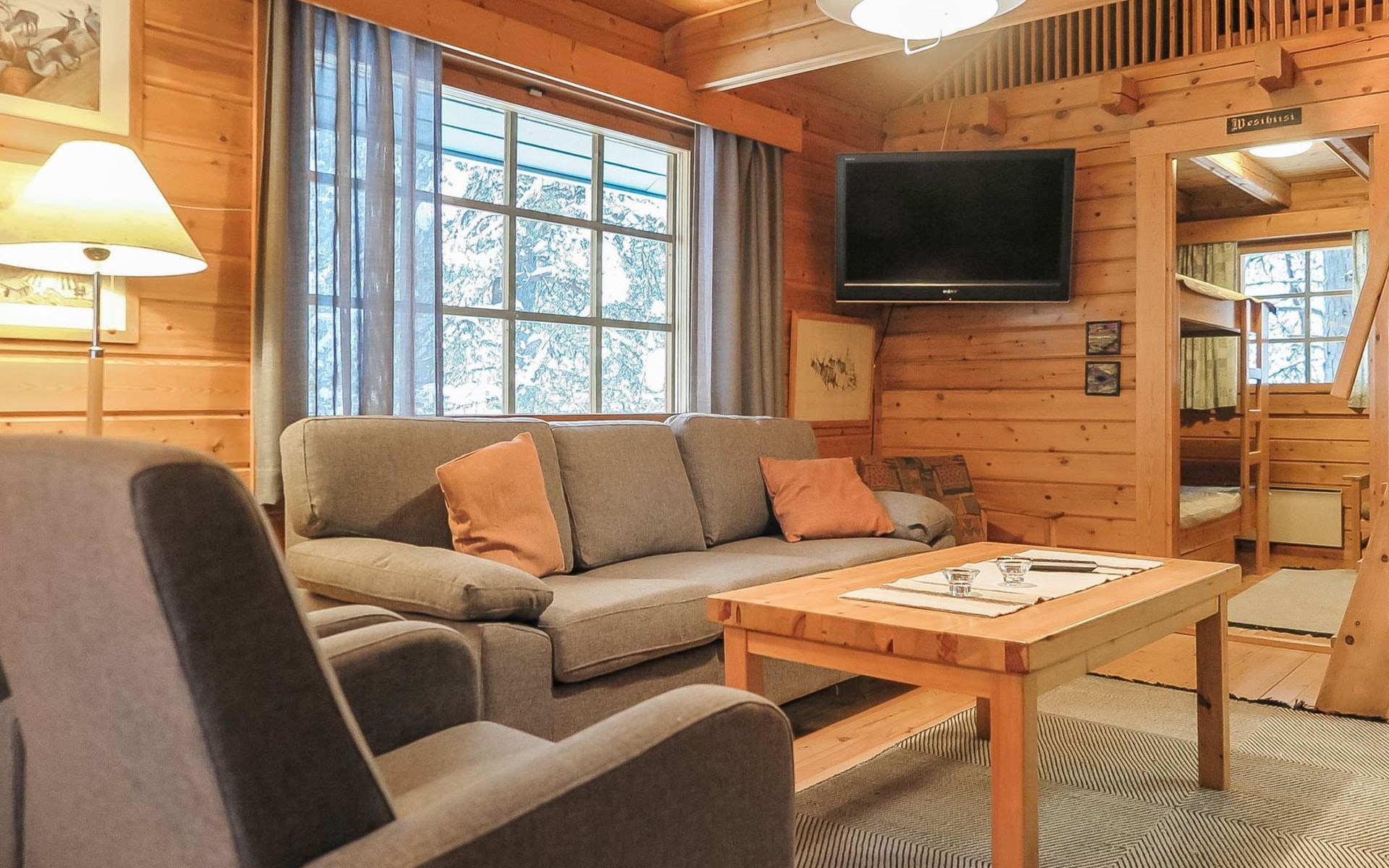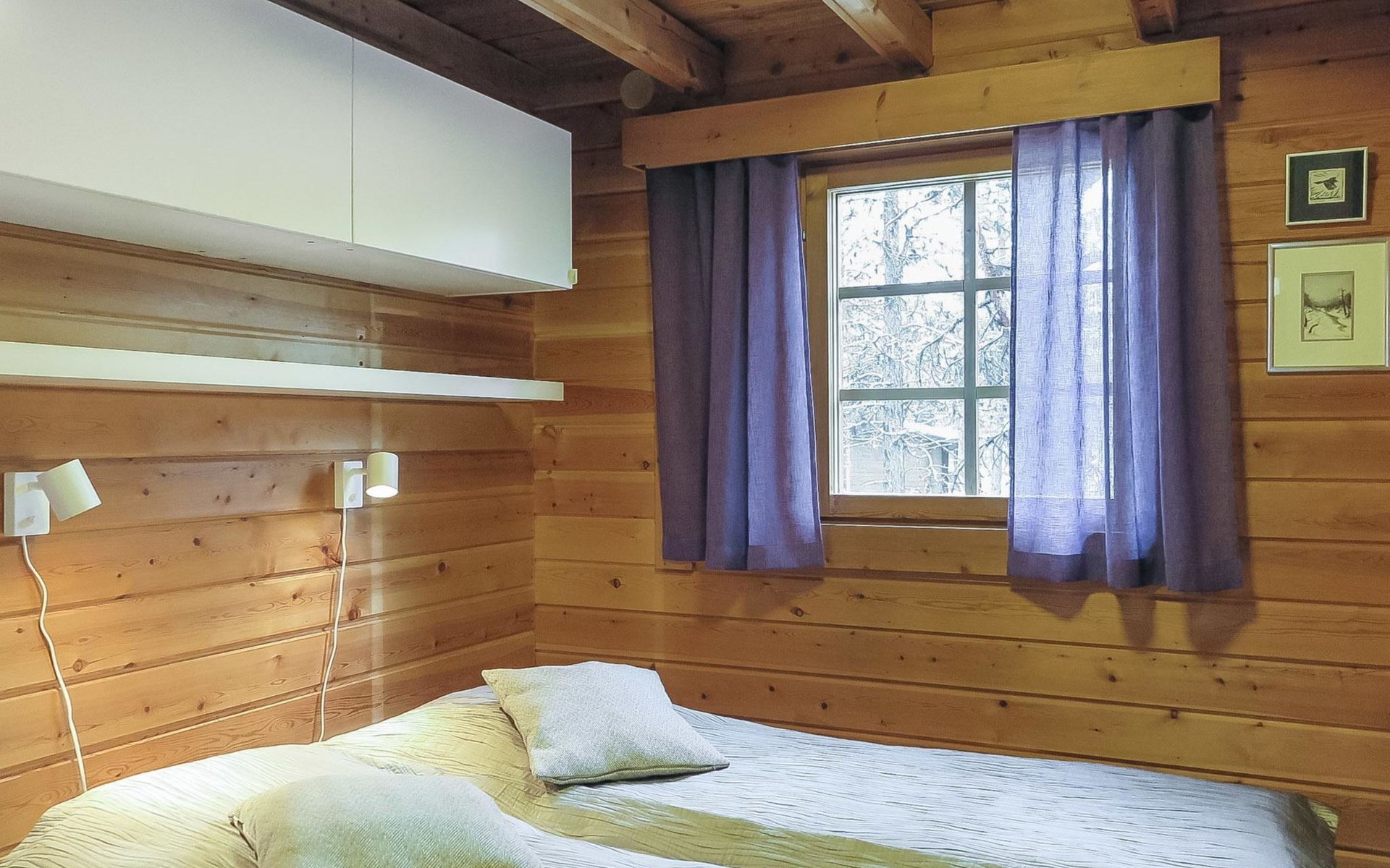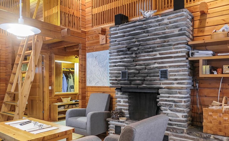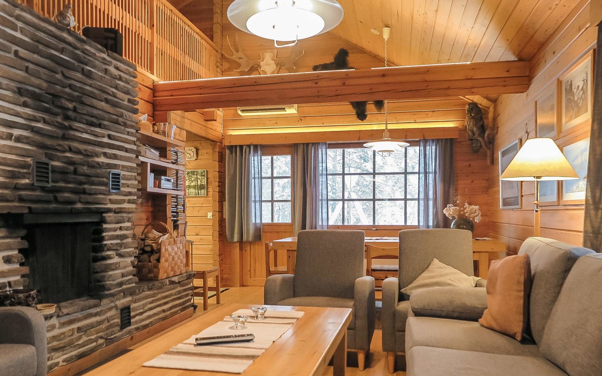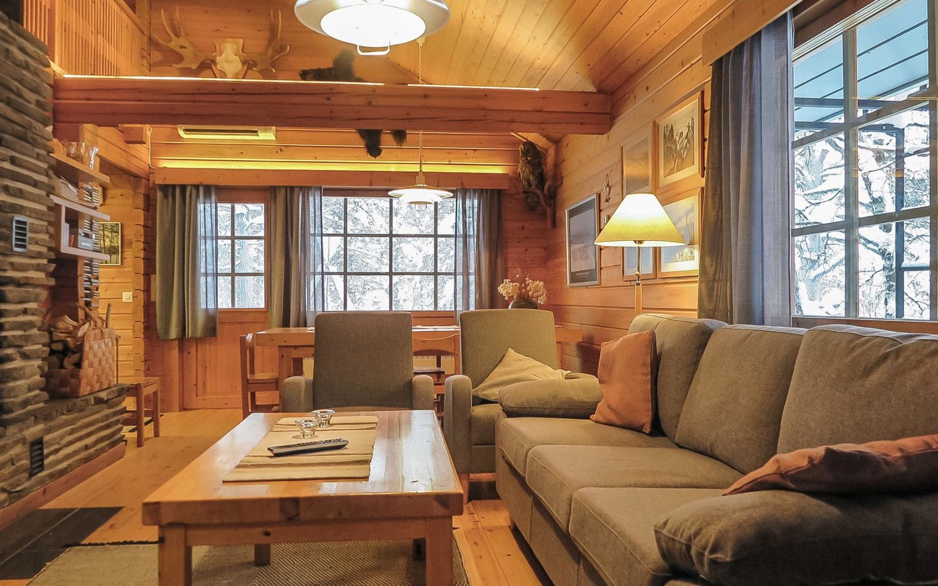 A living room, spacious kitchenette, three bedrooms all with 2 beds, spacious loft with 3 beds and a large corner sofa, steep stairs to the loft, sauna, washroom, dressing room, separate WC and covered terrace on southern/western side of the cabin.