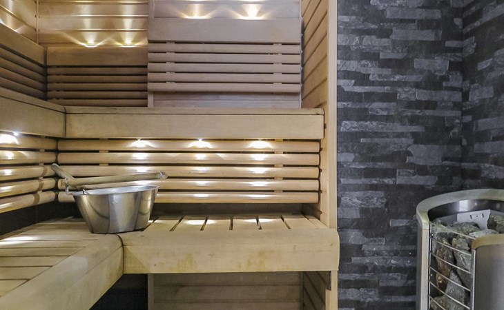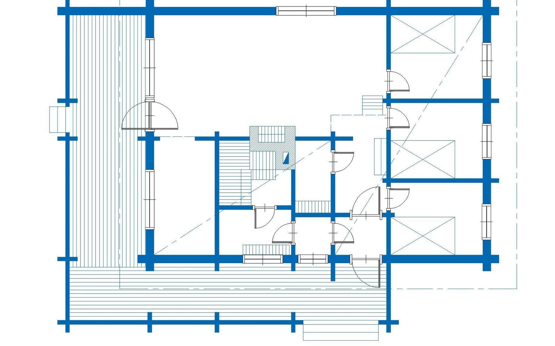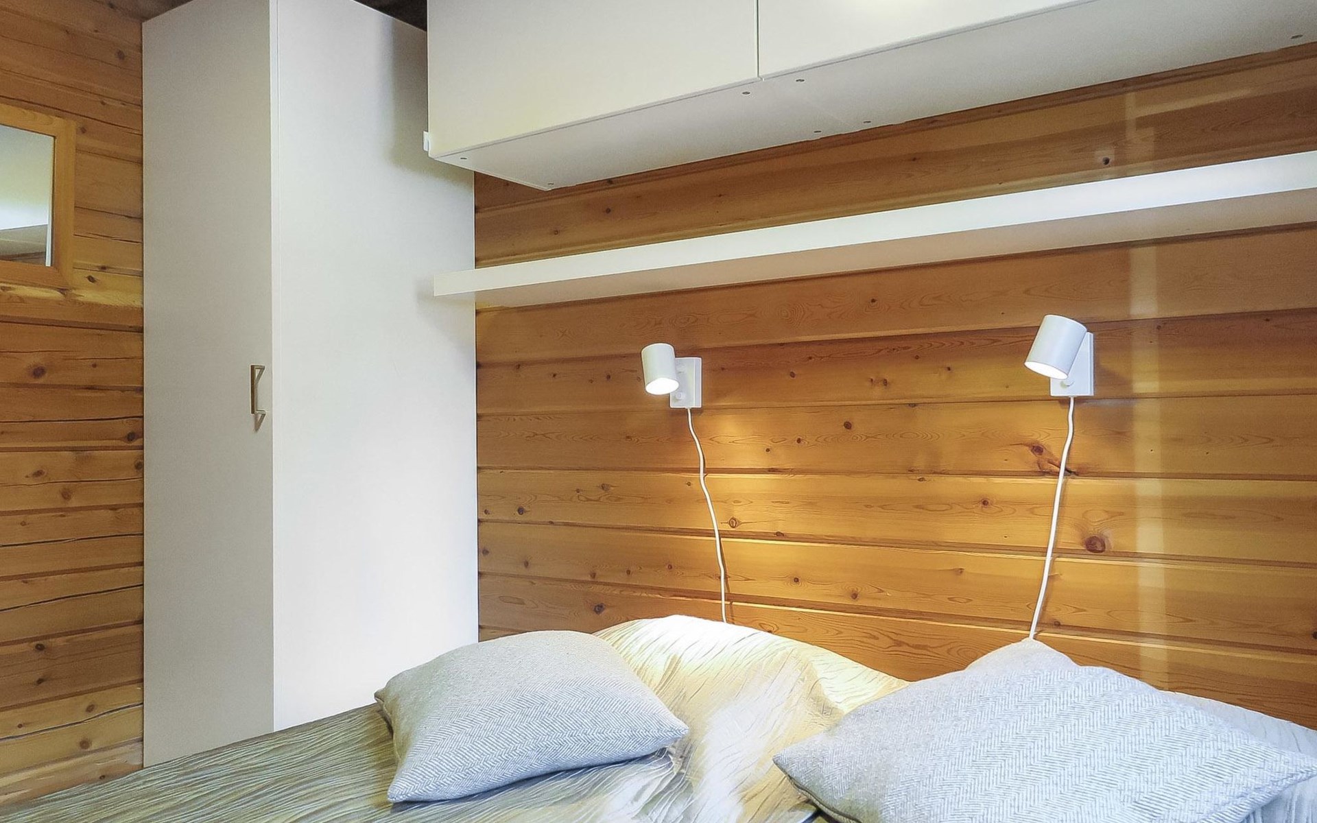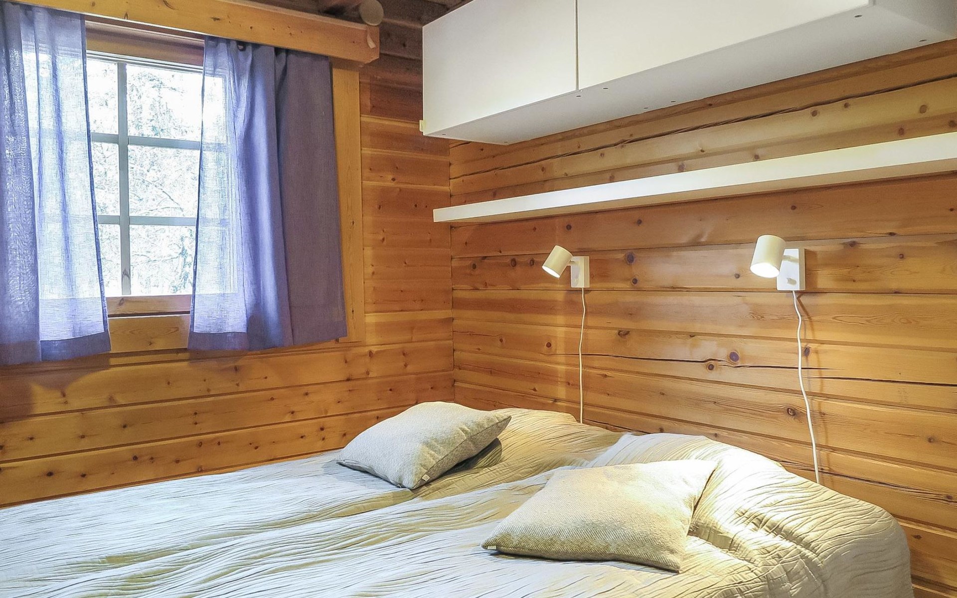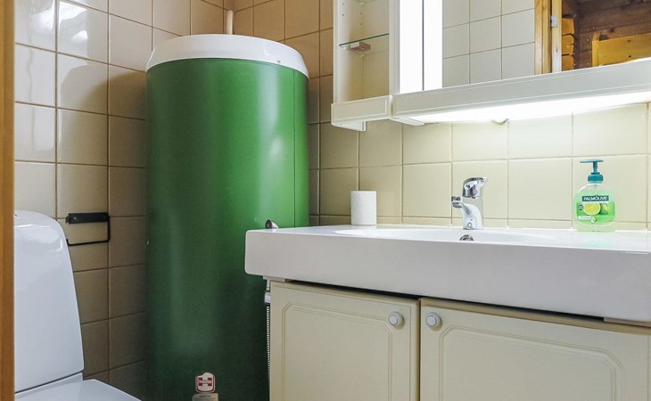 A living room, spacious kitchenette, three bedrooms all with 2 beds, spacious loft with 3 beds and a large corner sofa, steep stairs to the loft, sauna, washroom, dressing room, separate WC and covered terrace on southern/western side of the cabin.