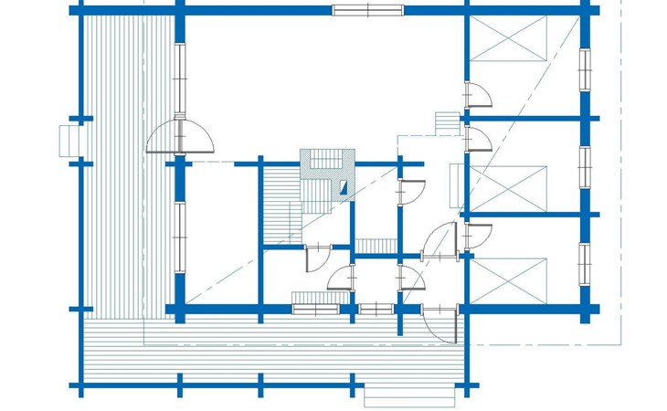 Massive square log cabin, inner walls are paneled, built in 1982, renovated later on.