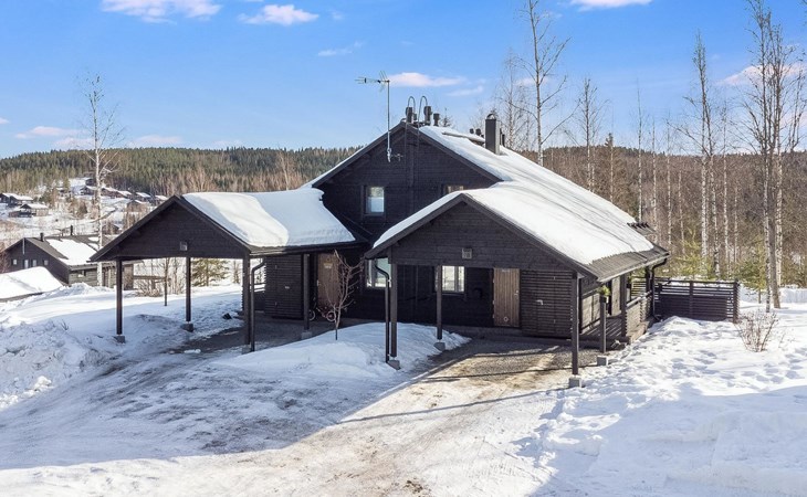 The apartment also includes an outdoor storage room for storing firewood, suitcases, and skis. The spacious plot receives sunlight all day long. There is ample space for two cars in the yard.