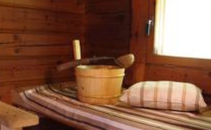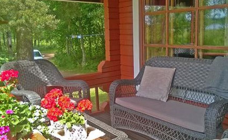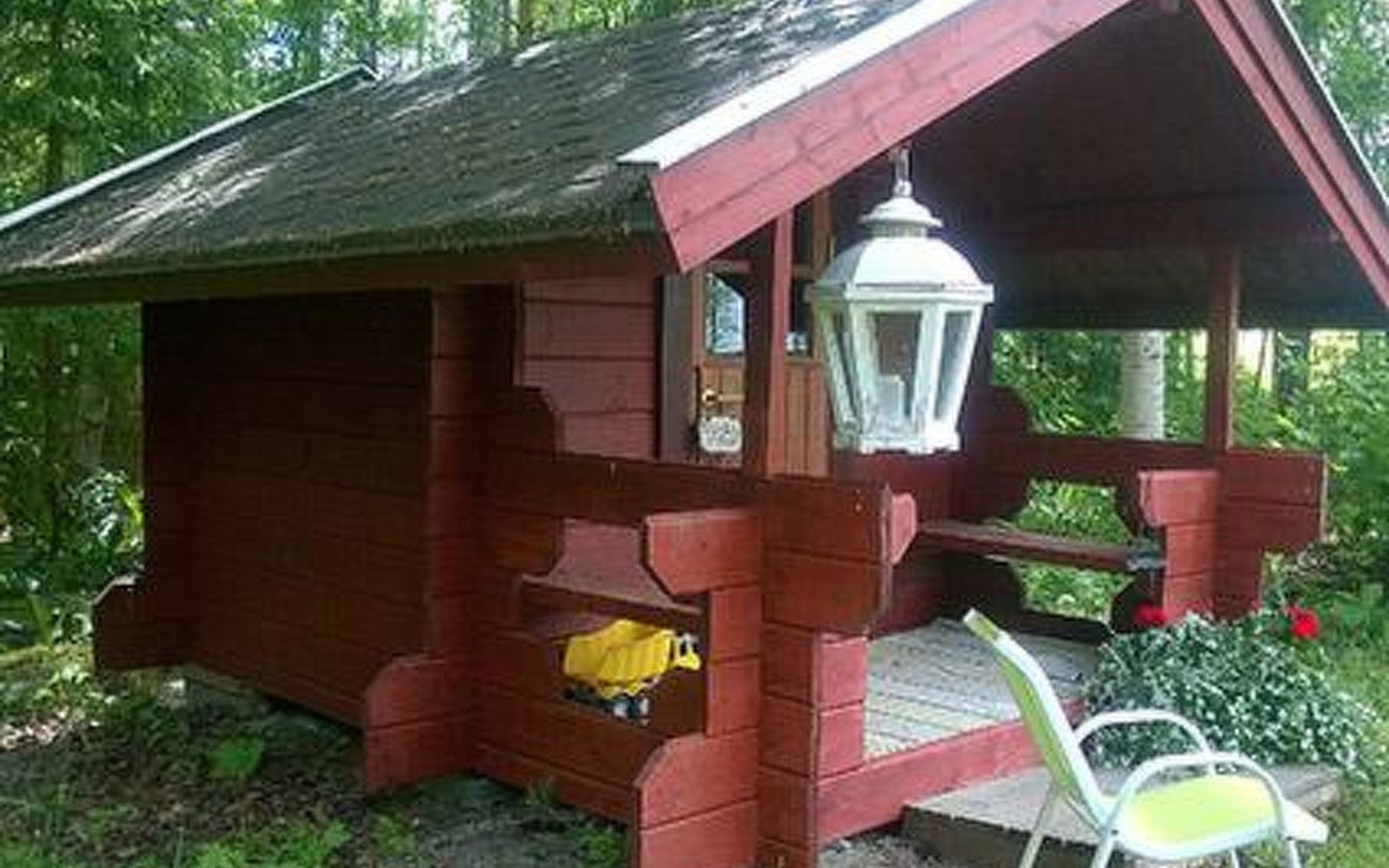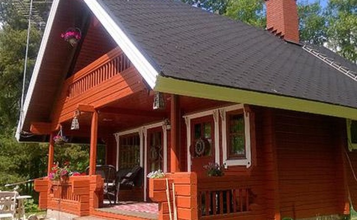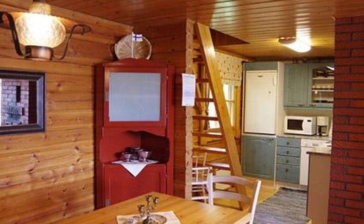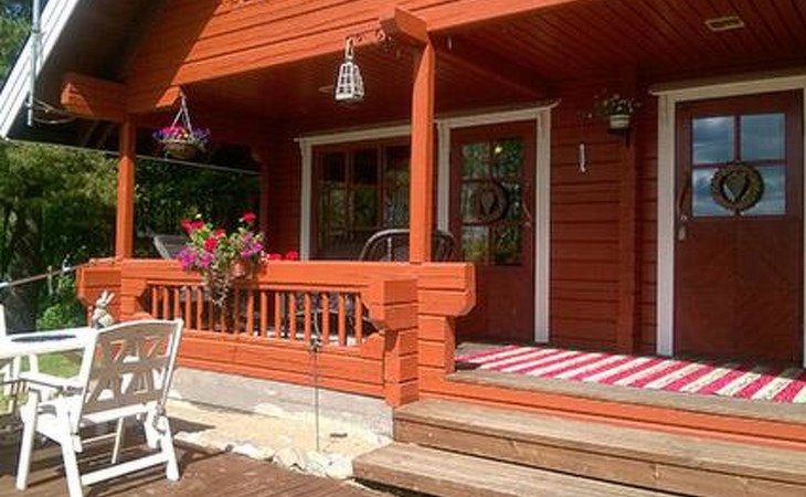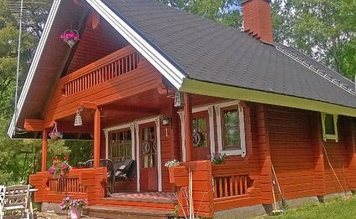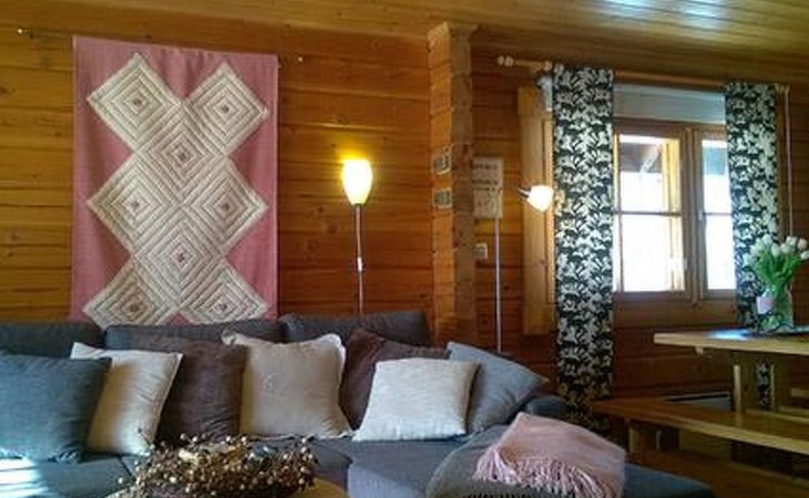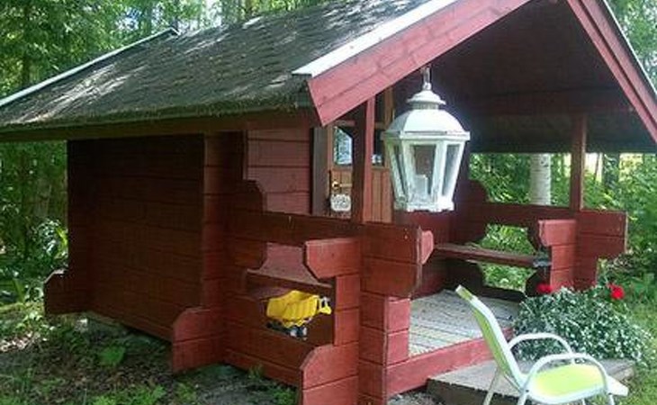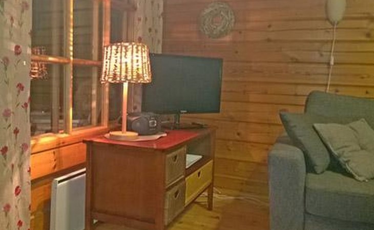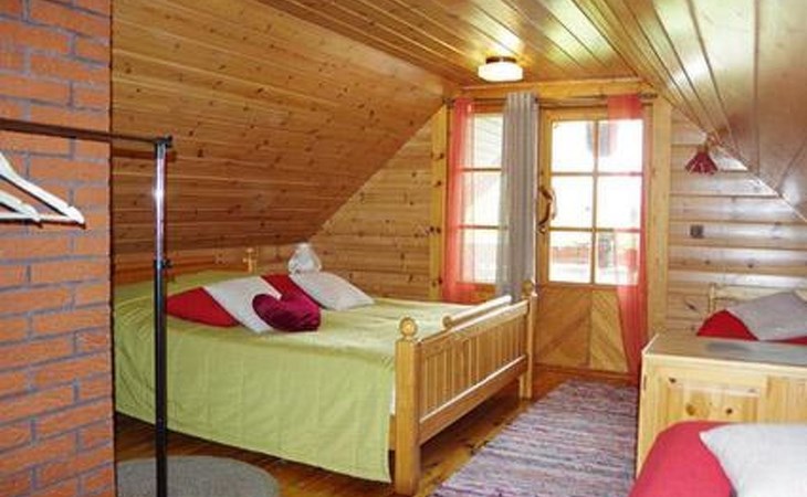 Log cabin 1987, living room/kitchen with convertible sofa, loft with double bed + 3 beds, sauna (shower inside sauna), open veranda. Total area 50 m² of which 15 m² on the loft.
