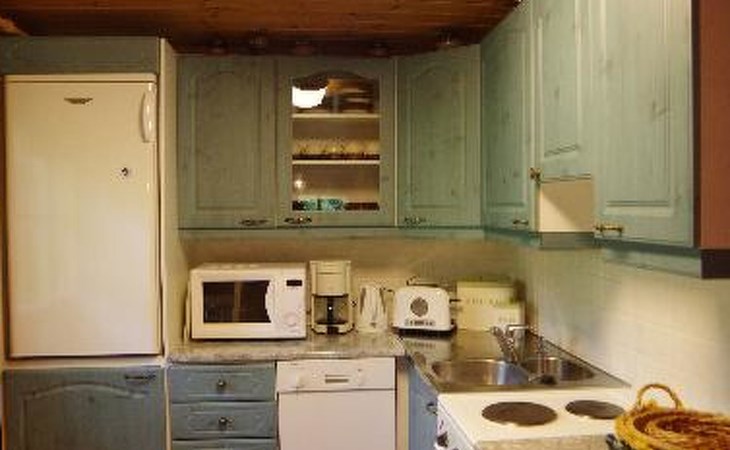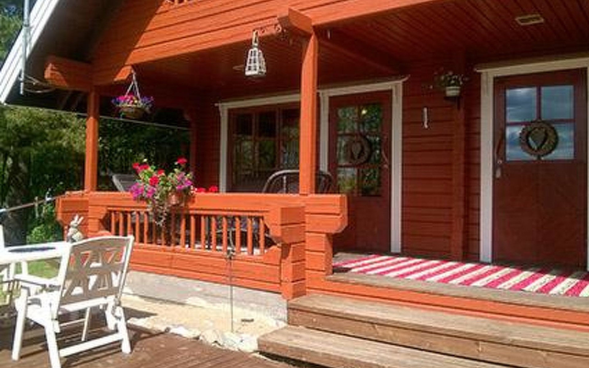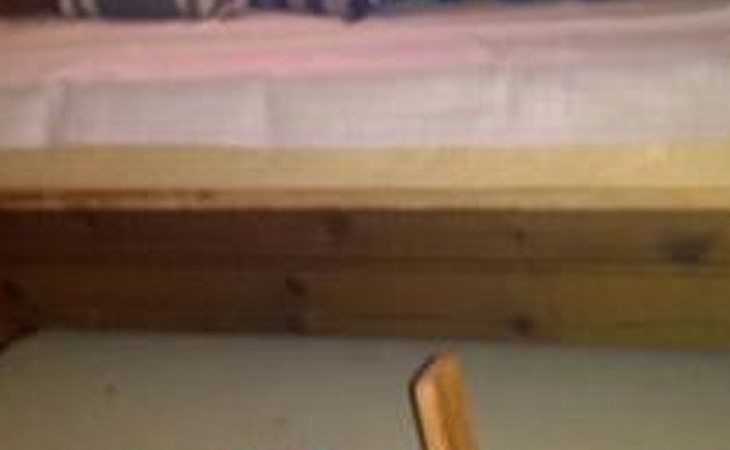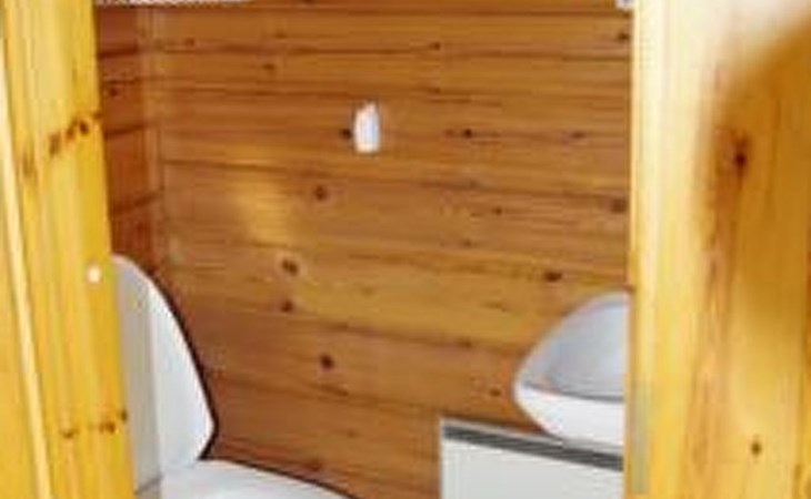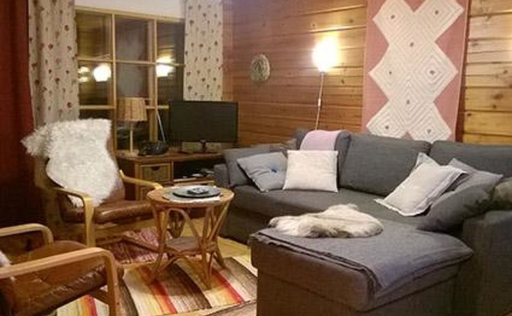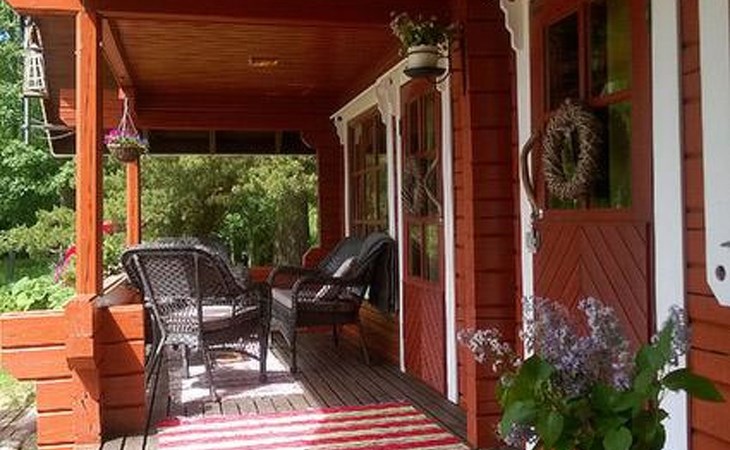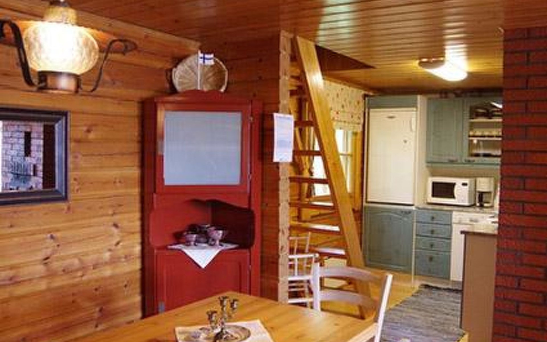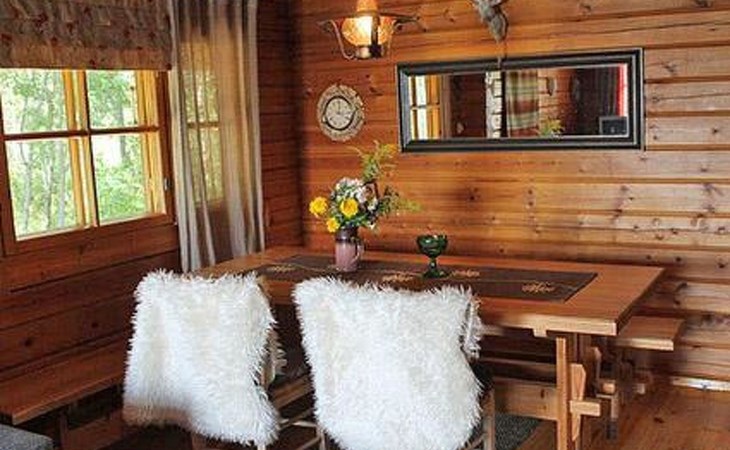 Log cabin 1987, living room/kitchen with convertible sofa, loft with double bed + 3 beds, sauna (shower inside sauna), open veranda. Total area 50 m² of which 15 m² on the loft.