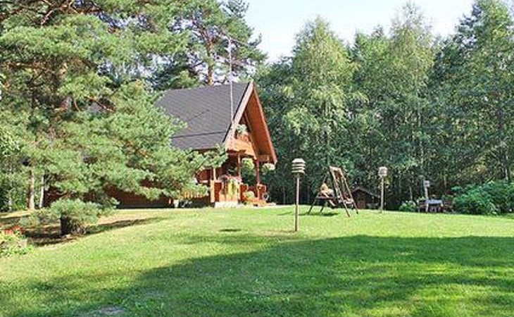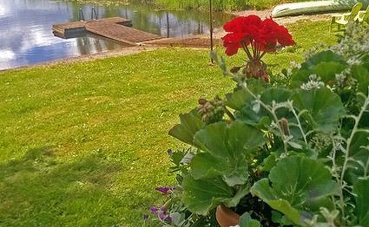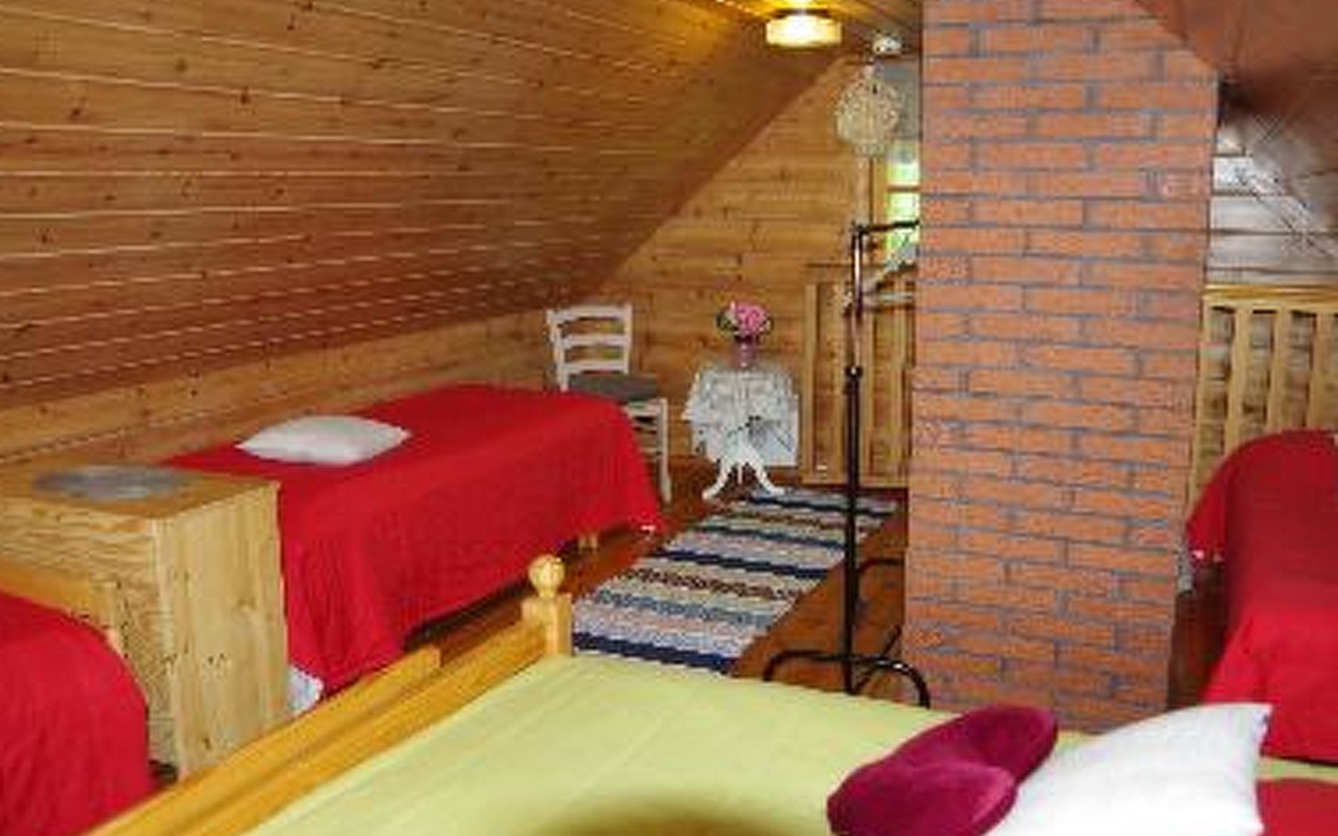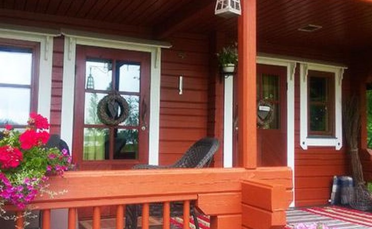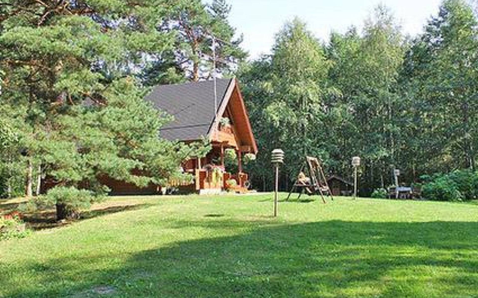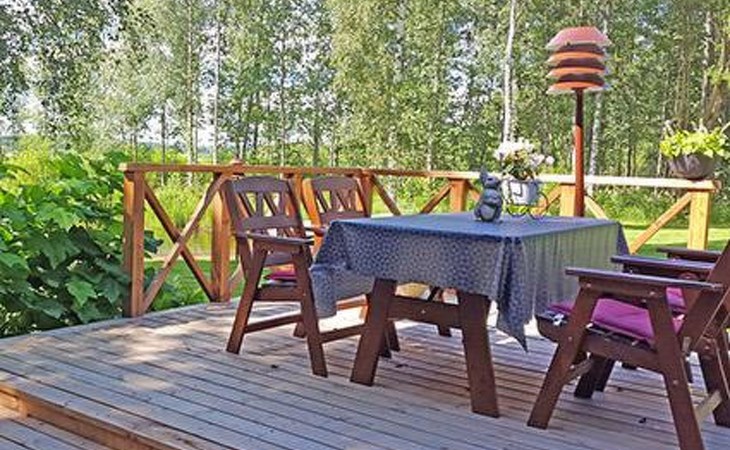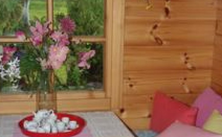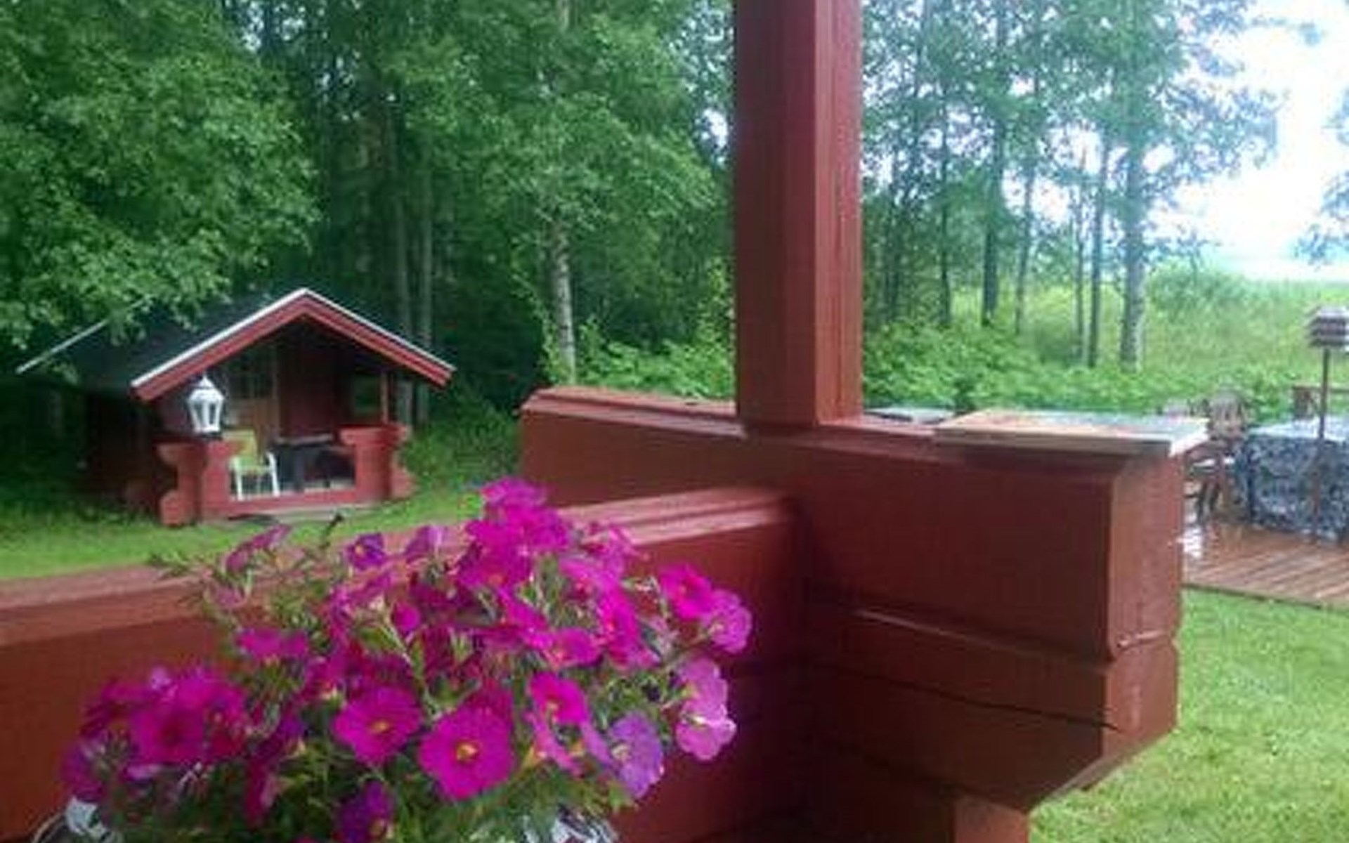 Log cabin 1987, living room/kitchen with convertible sofa, loft with double bed + 3 beds, sauna (shower inside sauna), open veranda. Total area 50 m² of which 15 m² on the loft.