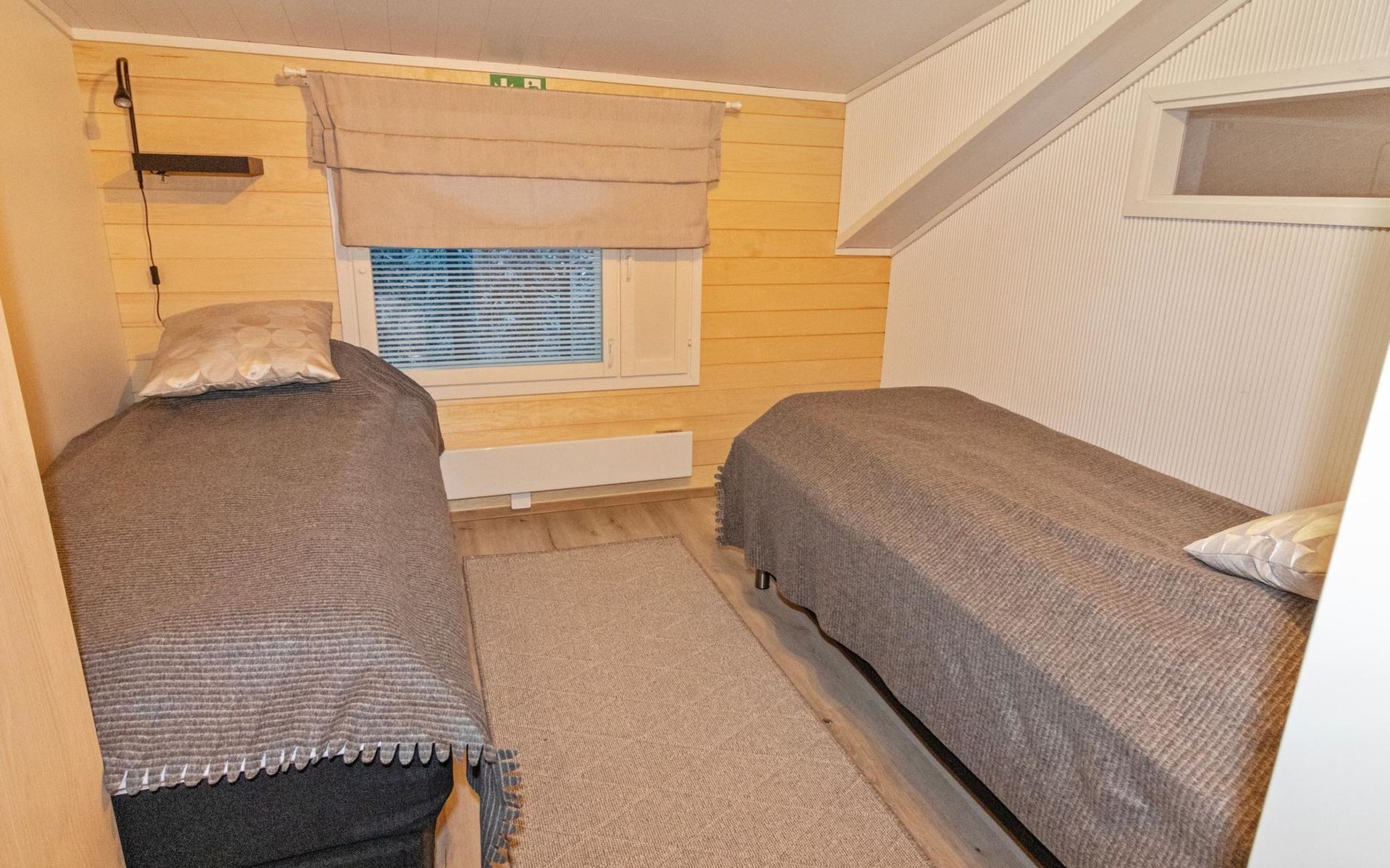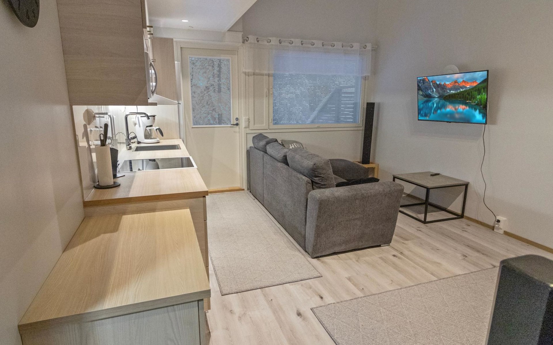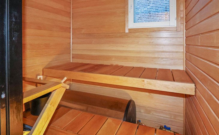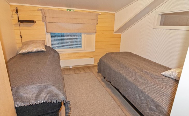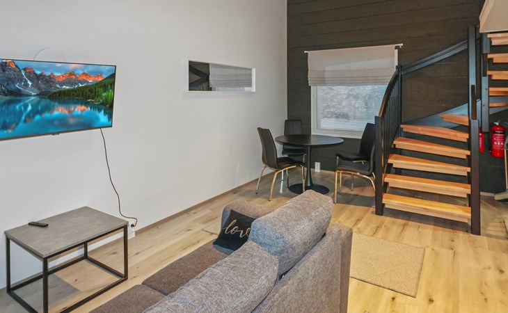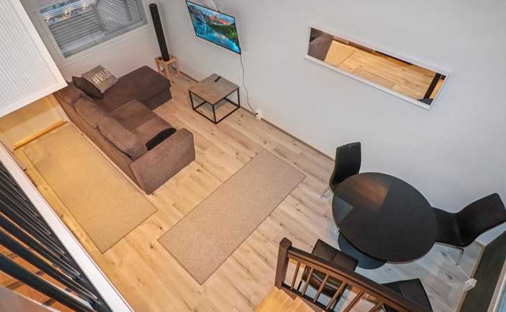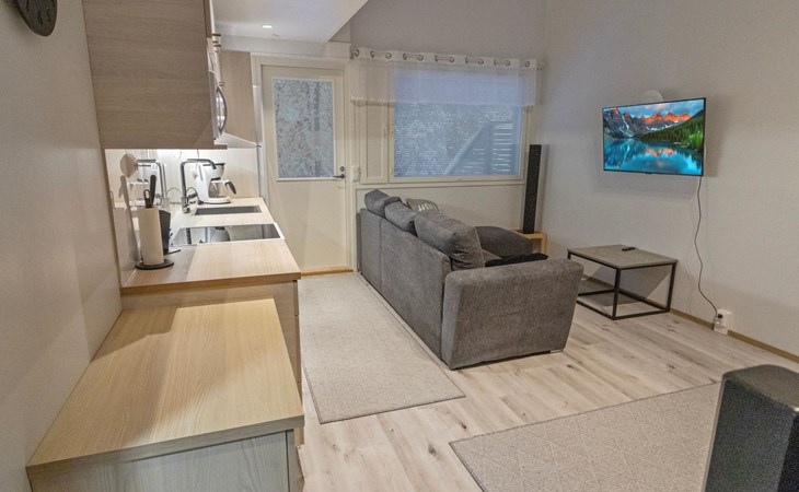 This apartment is completed in 2024. The apartment is on two floors, the ground floor is small and compact living room/kitchen, where additional accommodation can be obtained from a sofa bed (145 cm wide) that can be used as an extra bed for two people. Dining area for 4. Toilet/shower and a sauna heated by an electric heater. Upstairs there is one bedroom with two separate beds. From the living room there is access to terrace of the backyard. Storage.