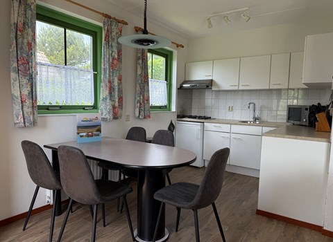 De woonkamer bevindt zich op de begane grond en is ingericht met een zithoek en een smart-tv. De villa heeft een open keuken met een eethoek. De keuken is voorzien van onder andere een koelkast, combimagnetron, een filterkoffiezetapparaat, een vaatwasser en een aparte vriezer.