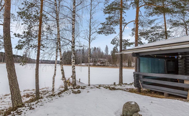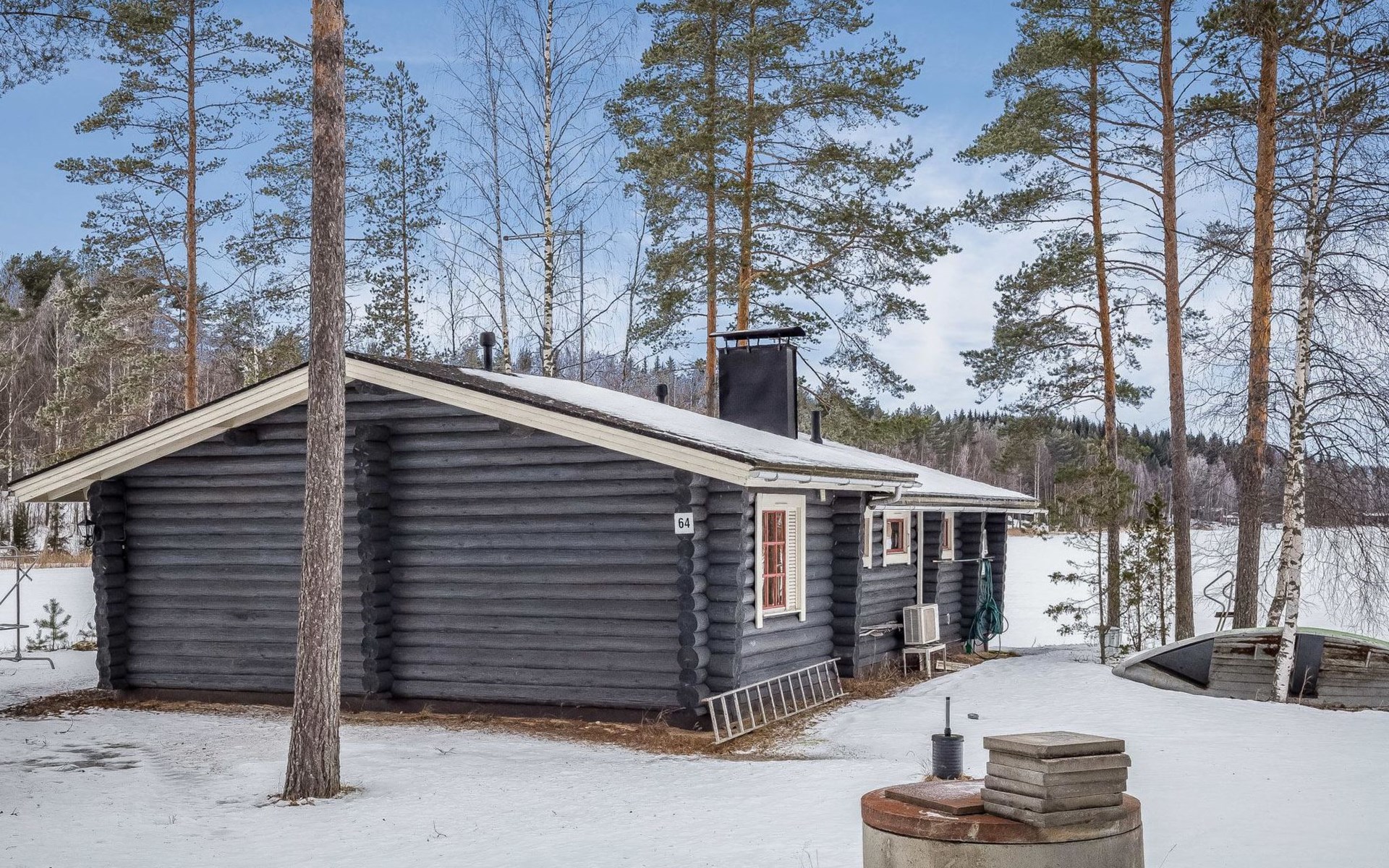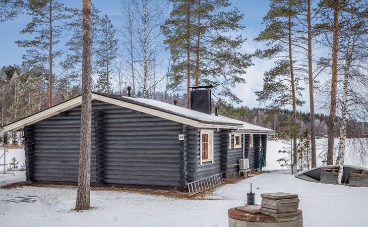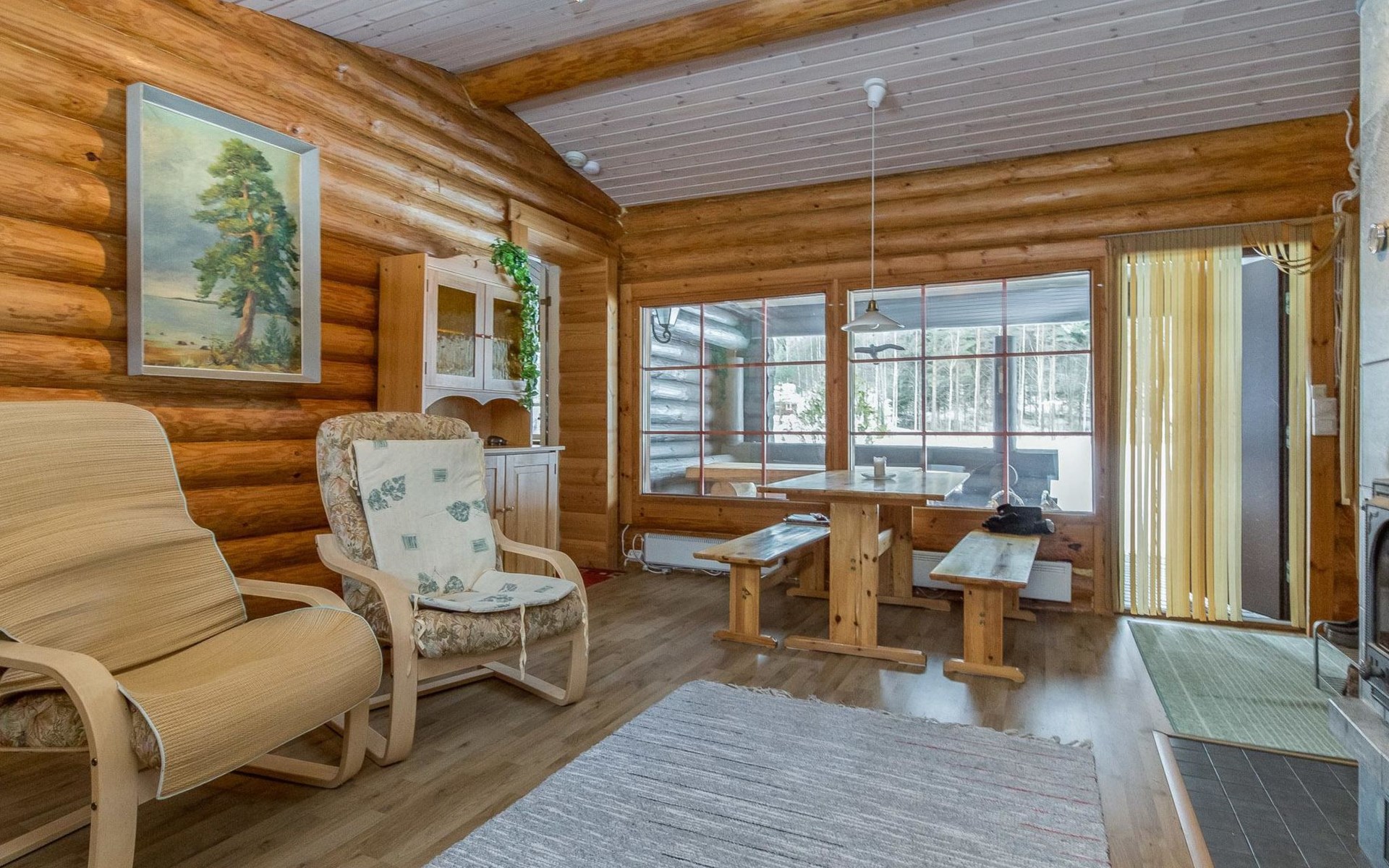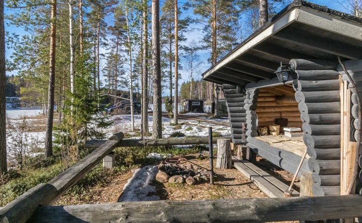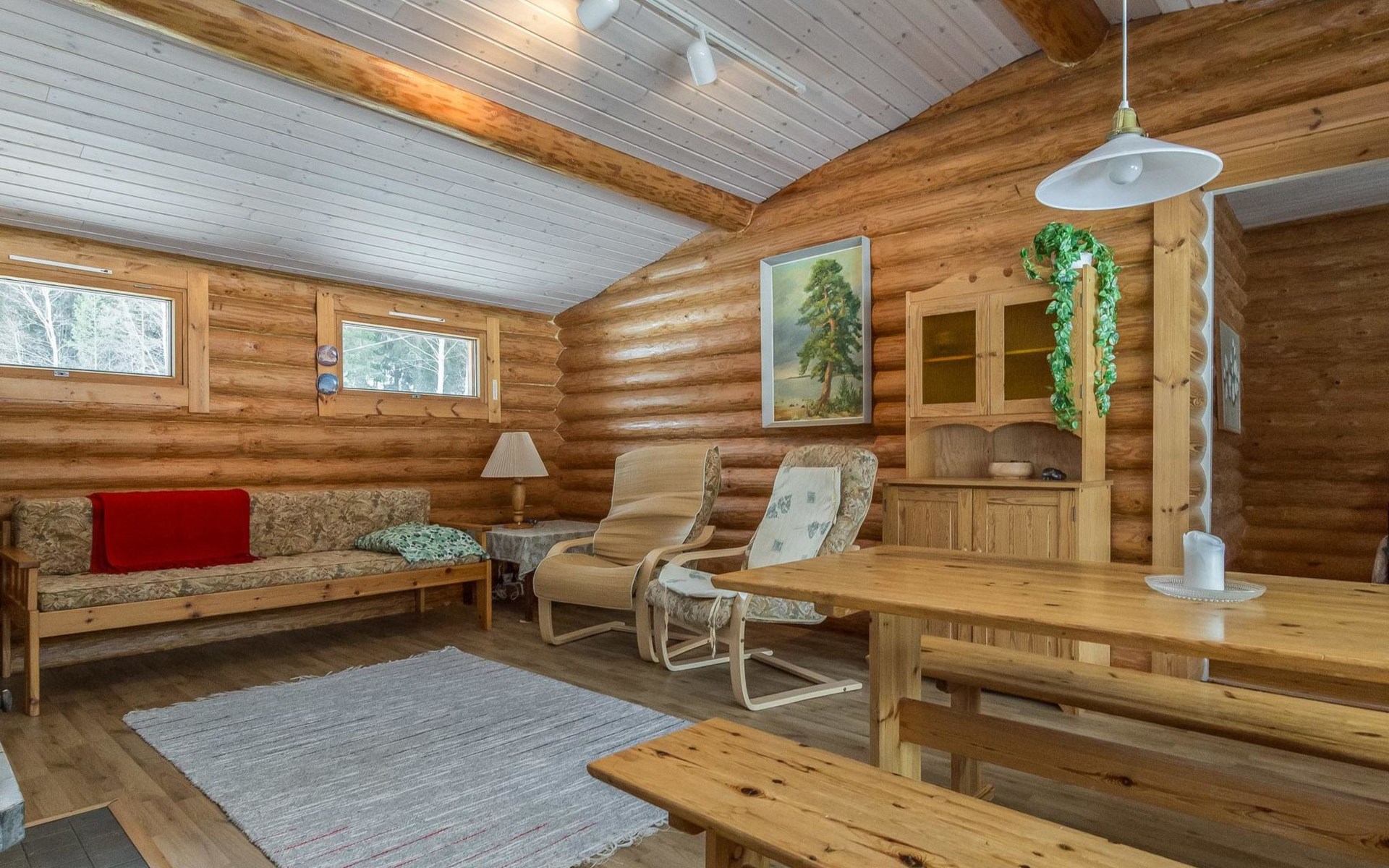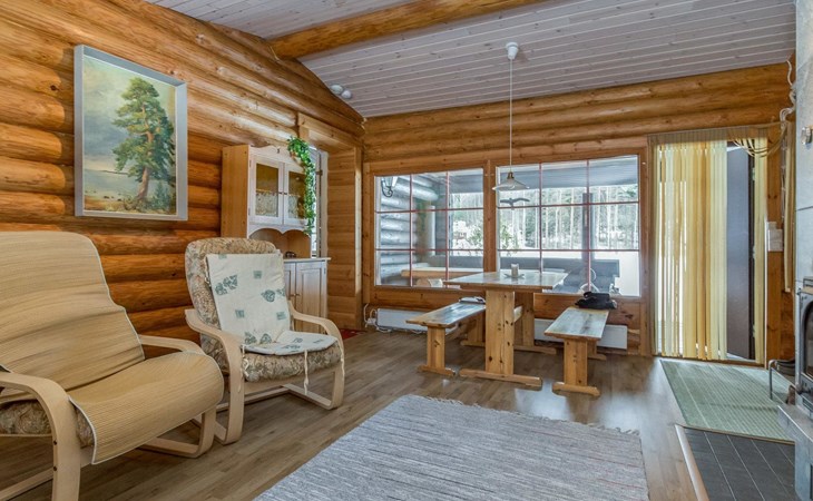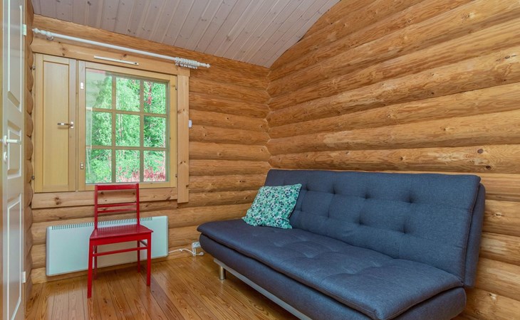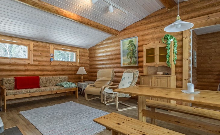 Log cabin 1977, extended 1993, renovated 2013, kitchenette, living room with 130 cm wide spreadable bed (while spread, there is space for two), bedroom (12.5 m²) with double bed, another bedroom (10 m²) with spreadable sofa (while spread, there space for two), washroom with shower and WC, covered terrace. Another entrance to the bedroom and washroom is through the first bedroom.