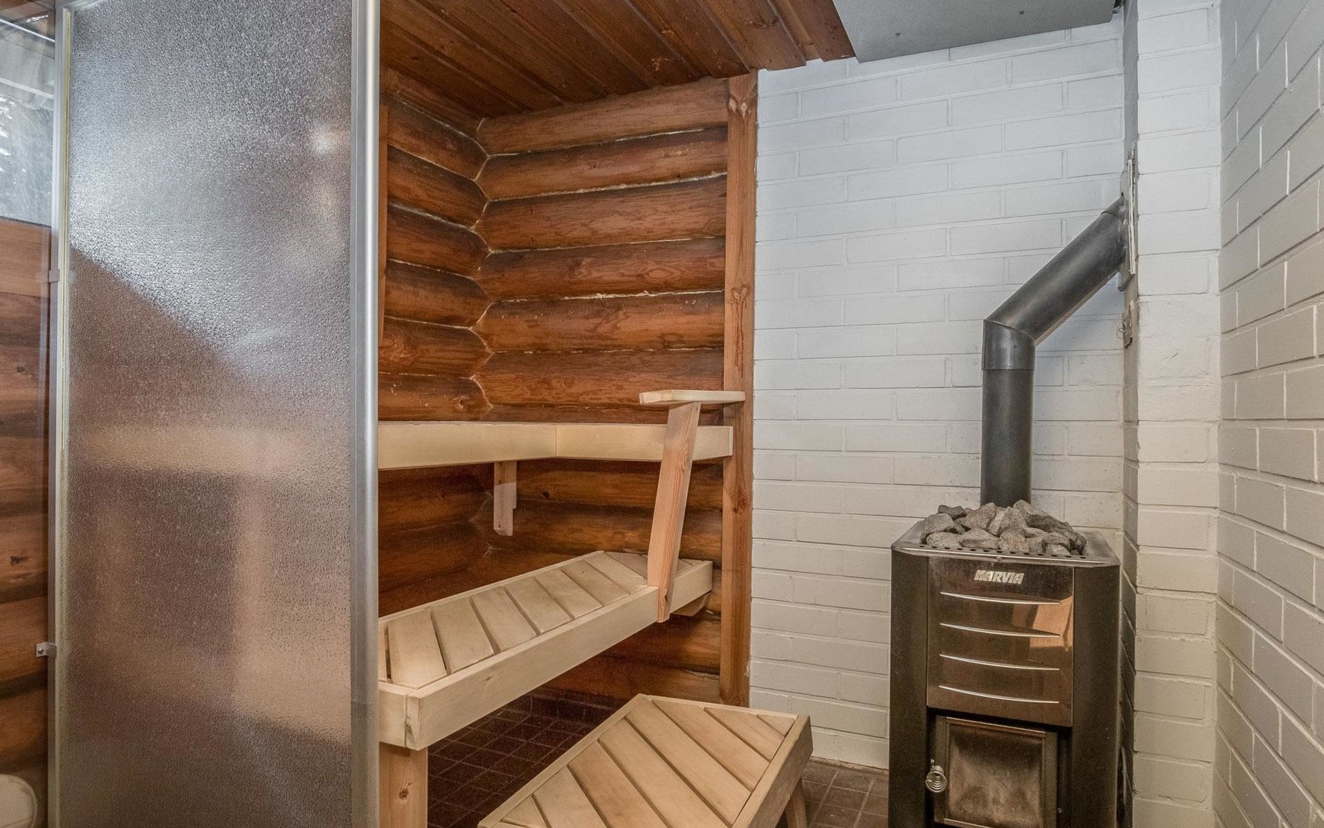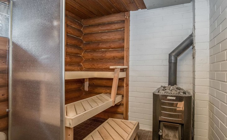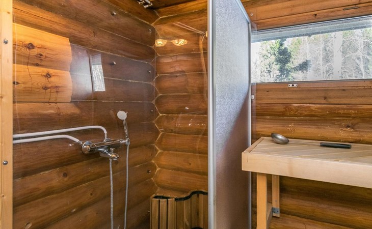 Sauna and dressing room, wood-burning sauna stove as well as shower in the sauna. Entrance to the sauna is from the terrace. Distance to the water is 5 m from the sauna’s terrace.