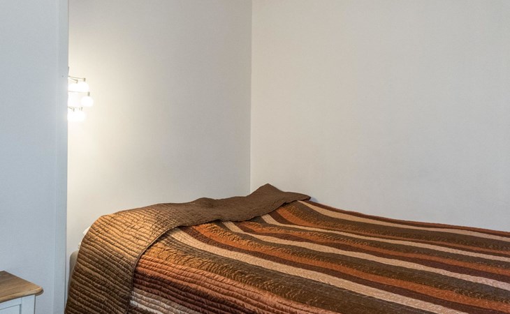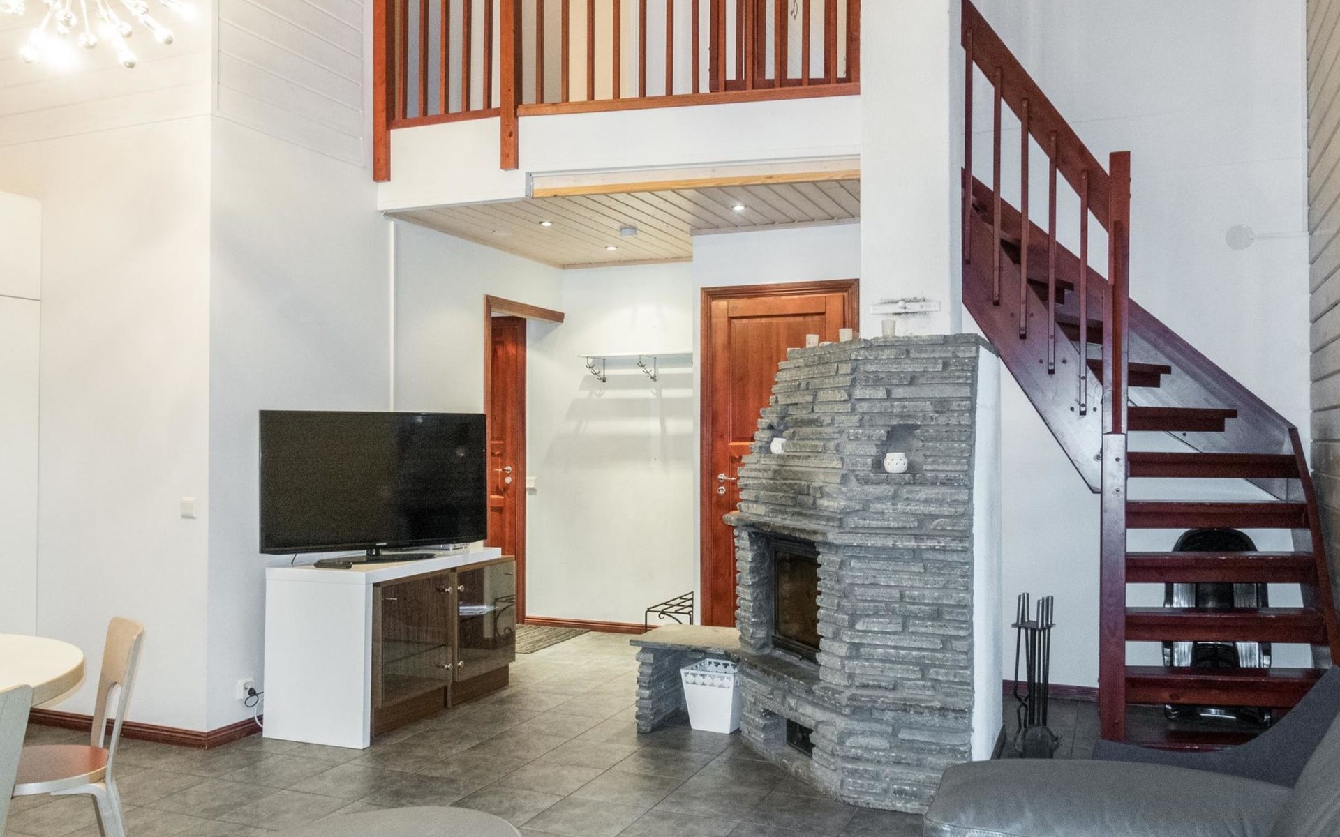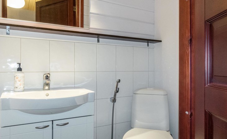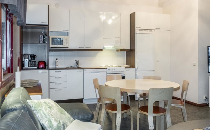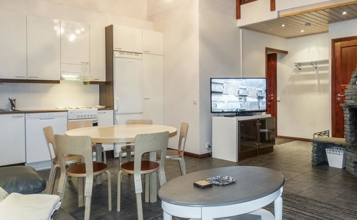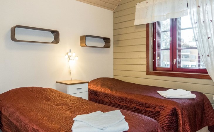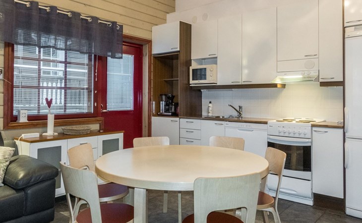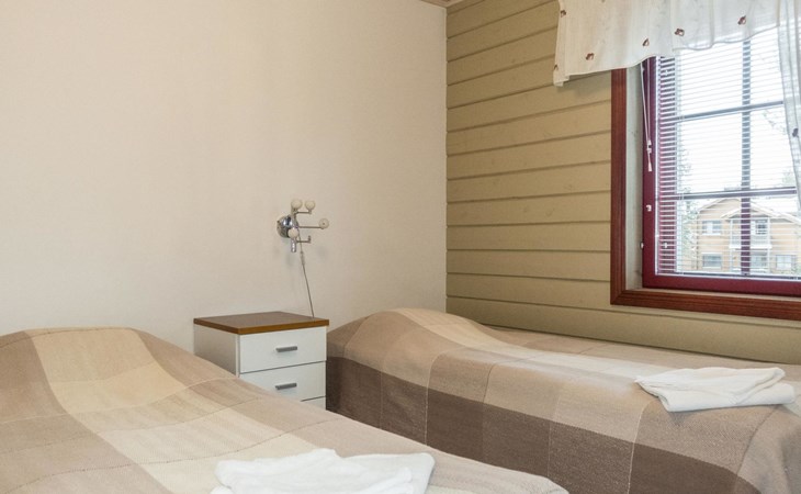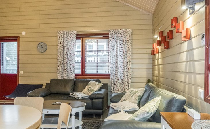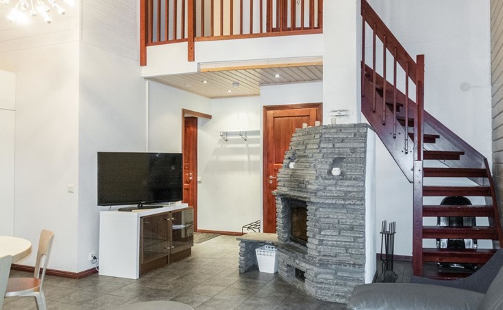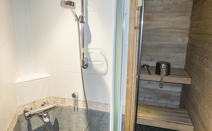 On the ground floor, living room/kitchen, bedroom with two beds, sauna, washroom, separate WC and balcony.