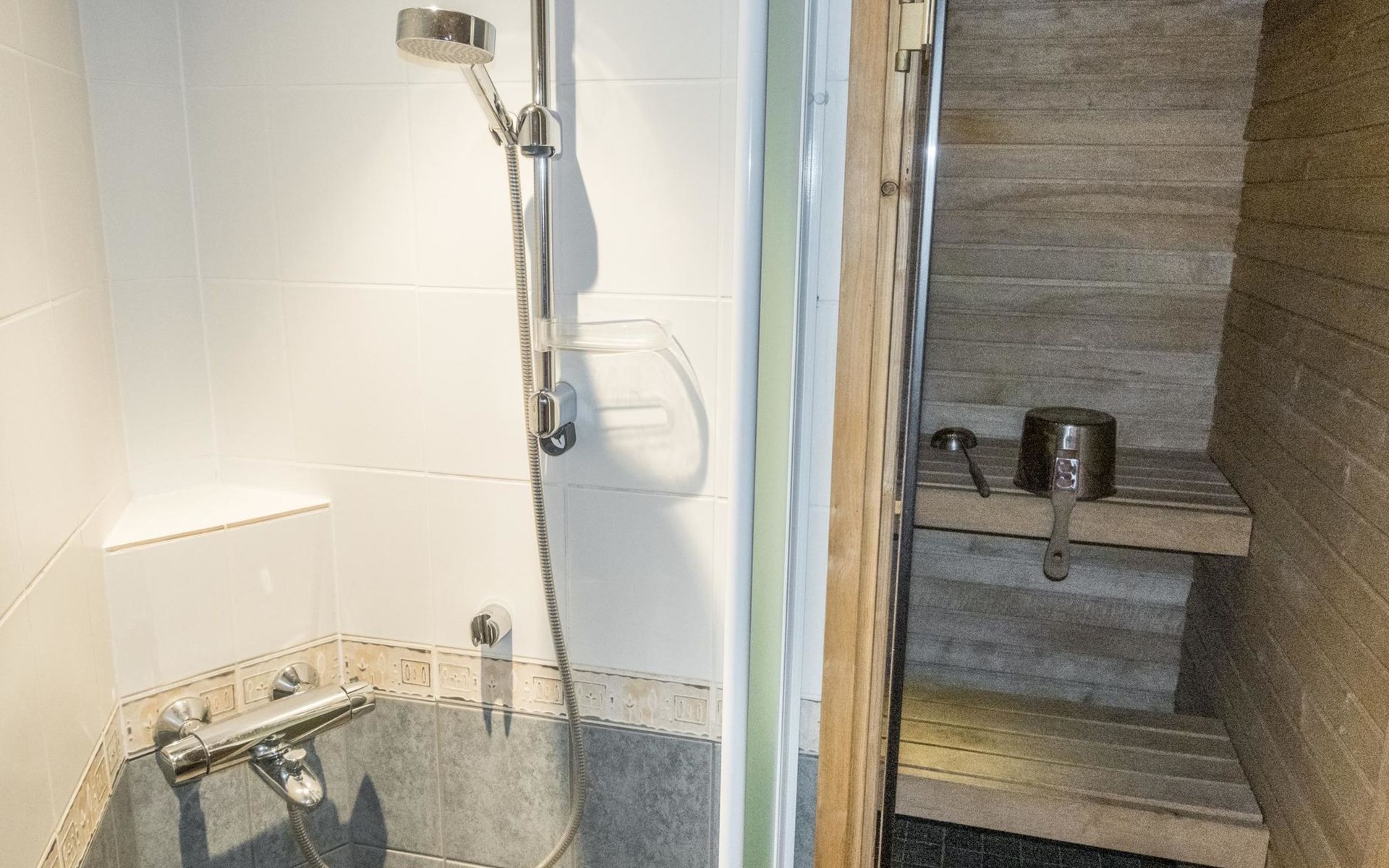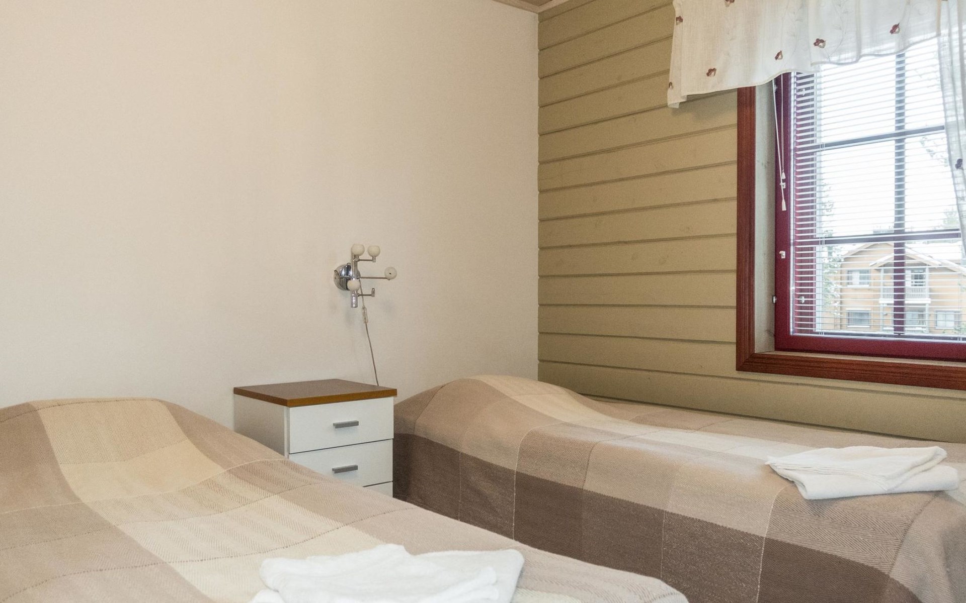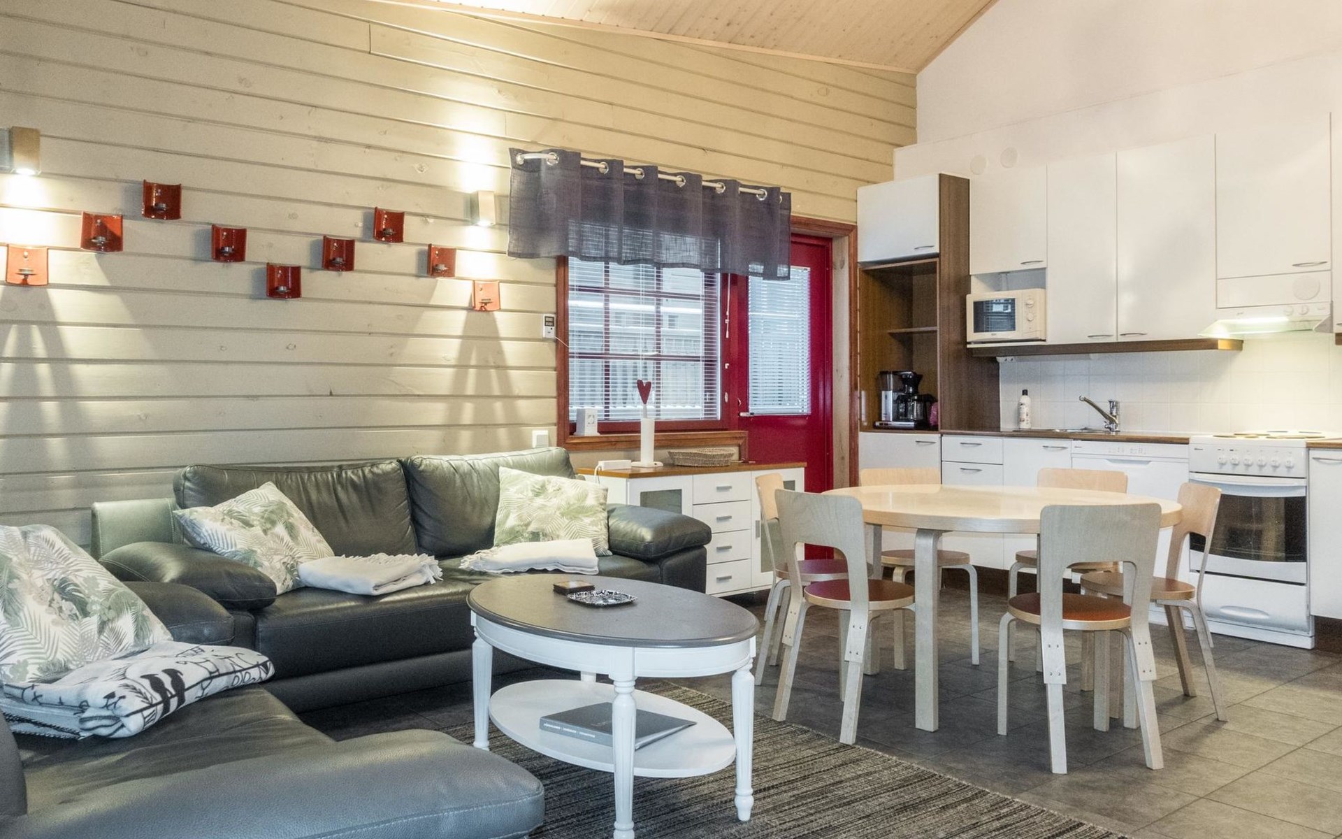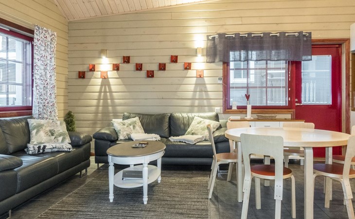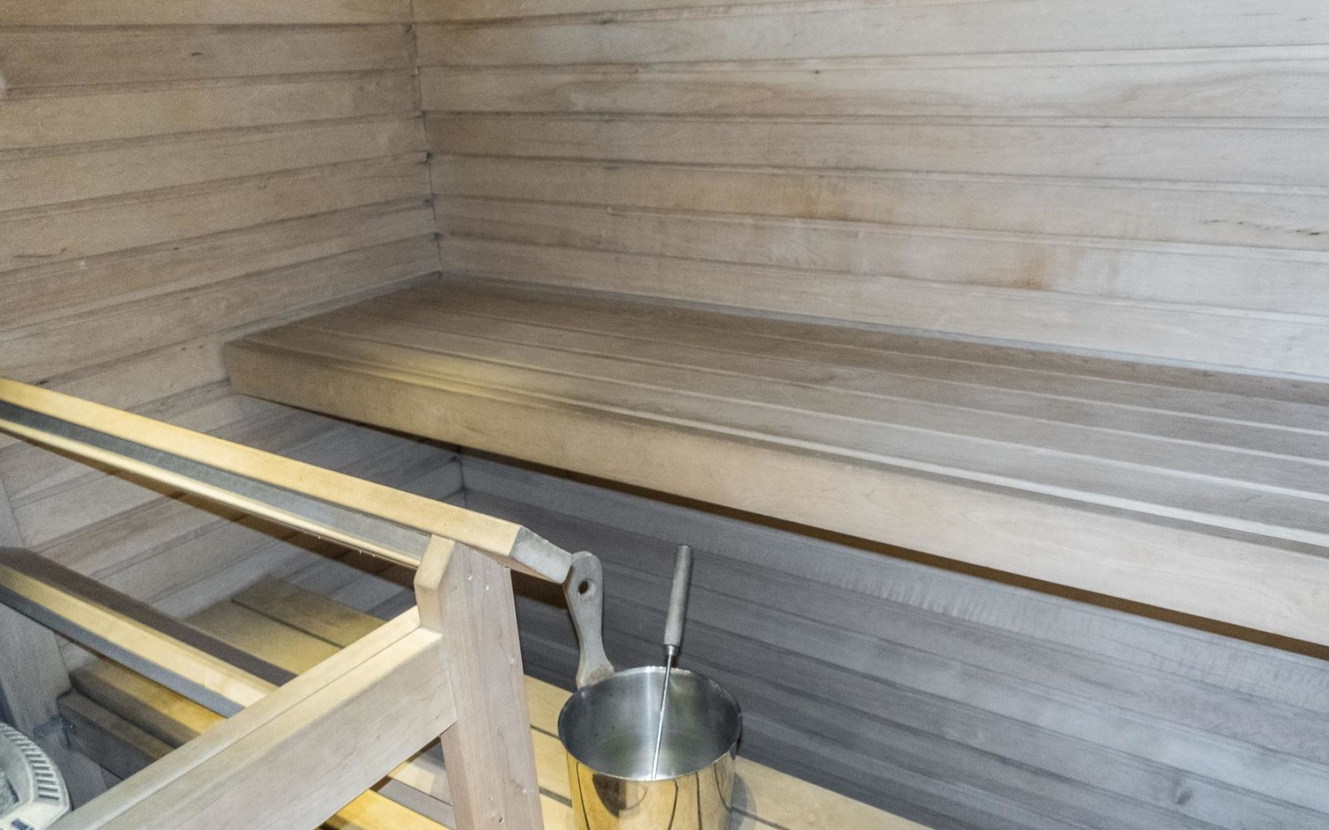 On the ground floor, living room/kitchen, bedroom with two beds, sauna, washroom, separate WC and balcony.