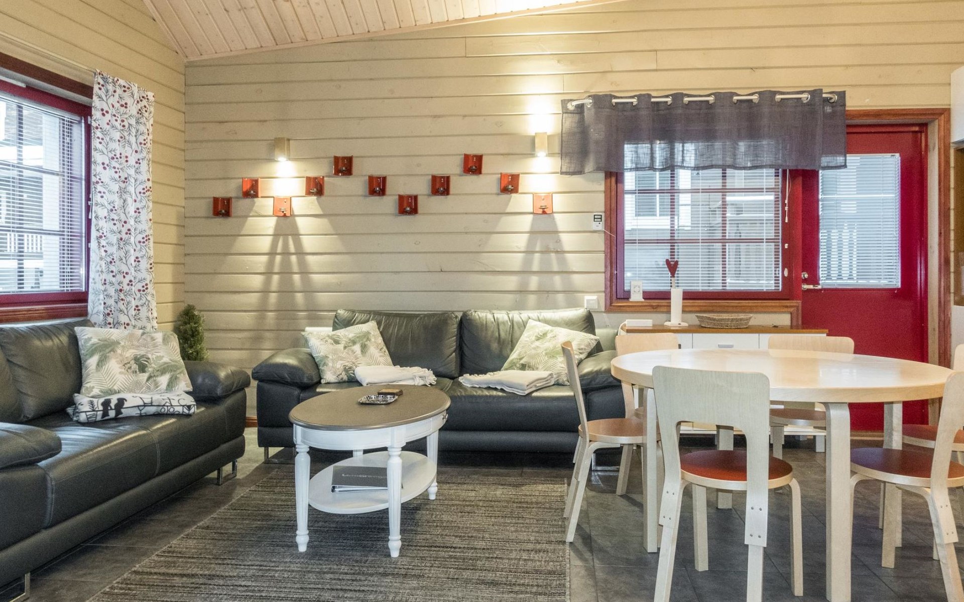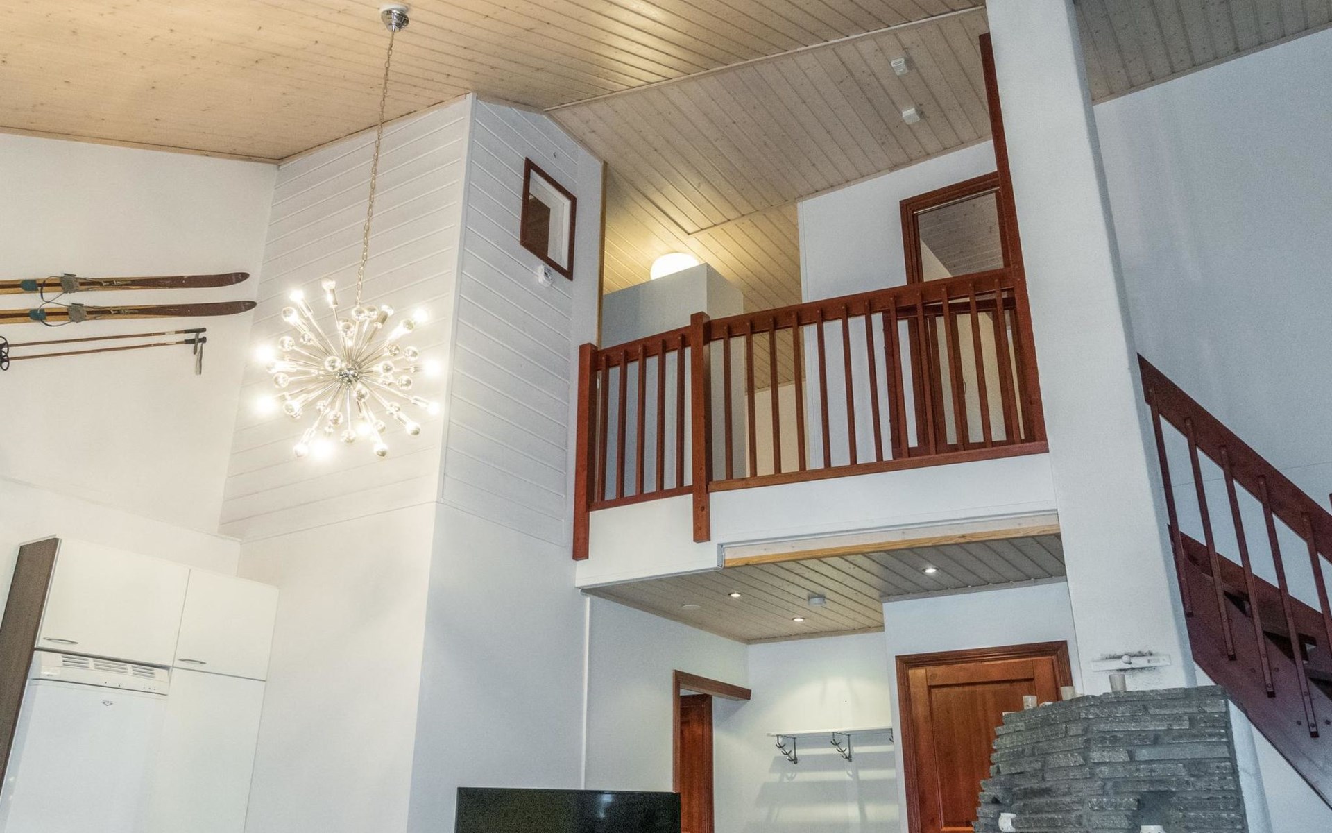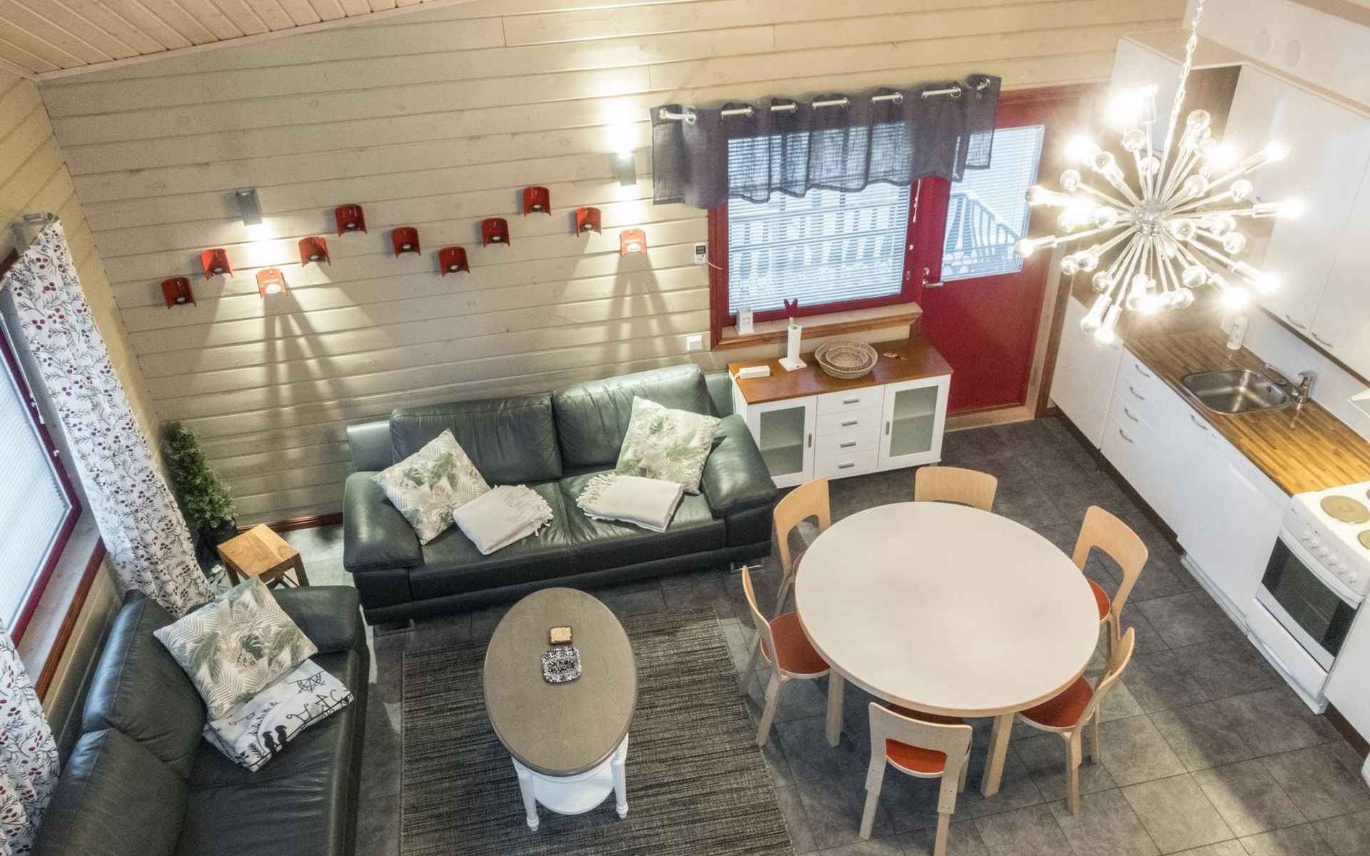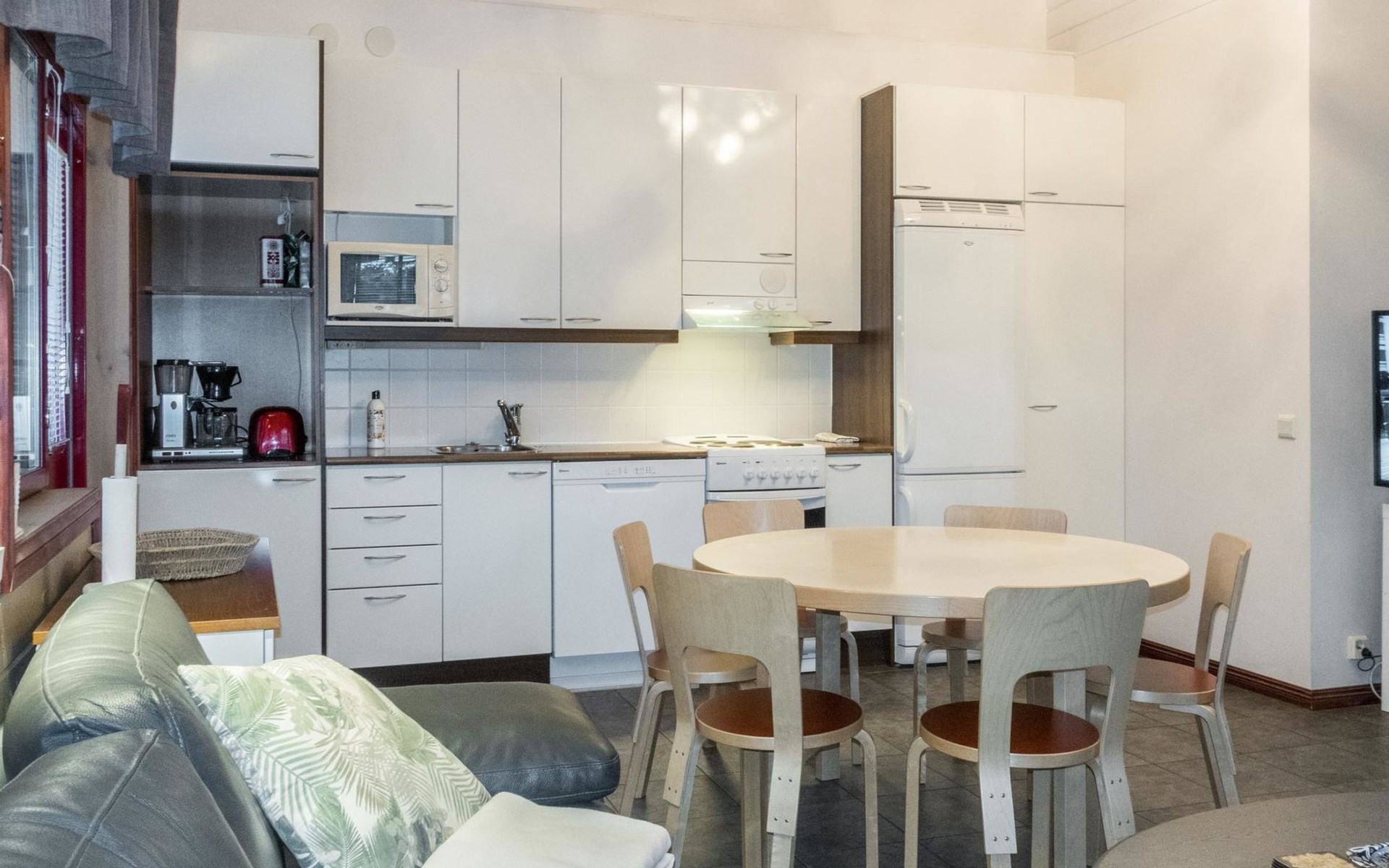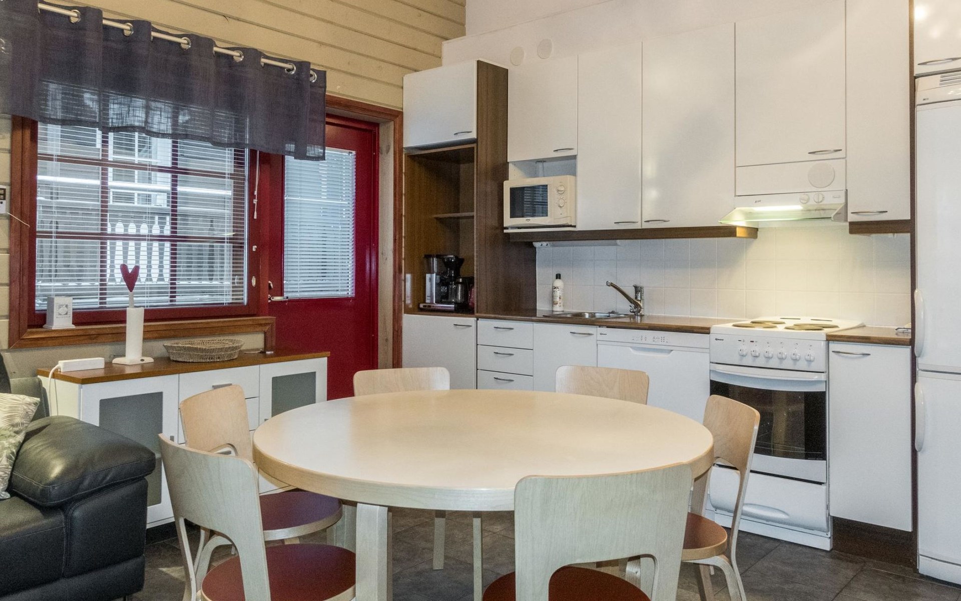 On the ground floor, living room/kitchen, bedroom with two beds, sauna, washroom, separate WC and balcony.