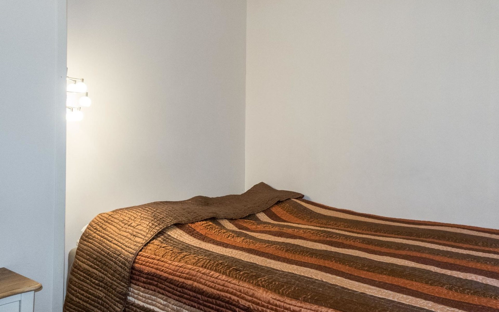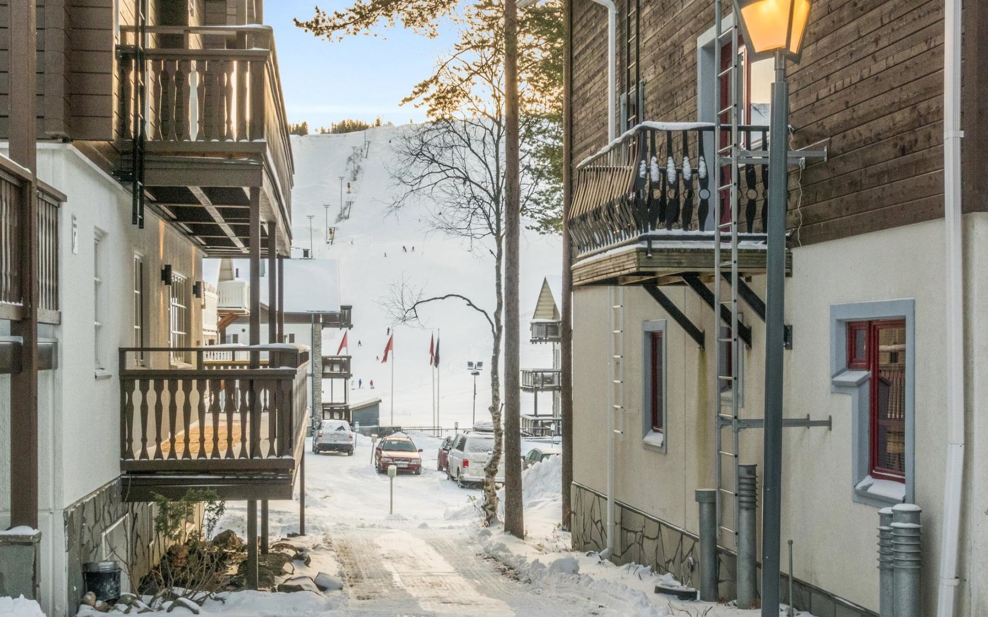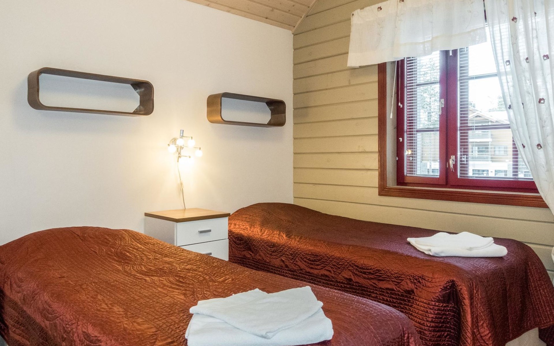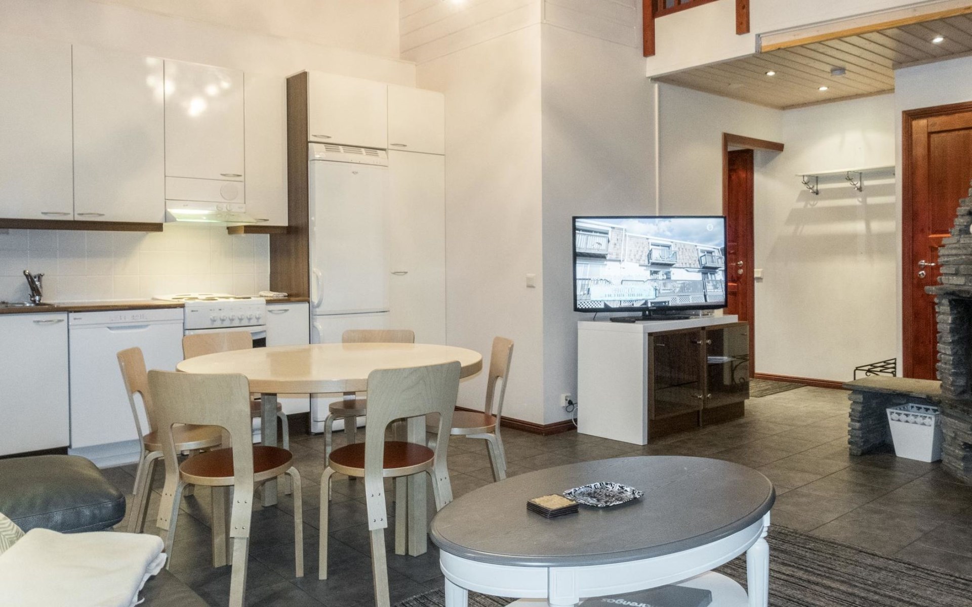 On the ground floor, living room/kitchen, bedroom with two beds, sauna, washroom, separate WC and balcony.