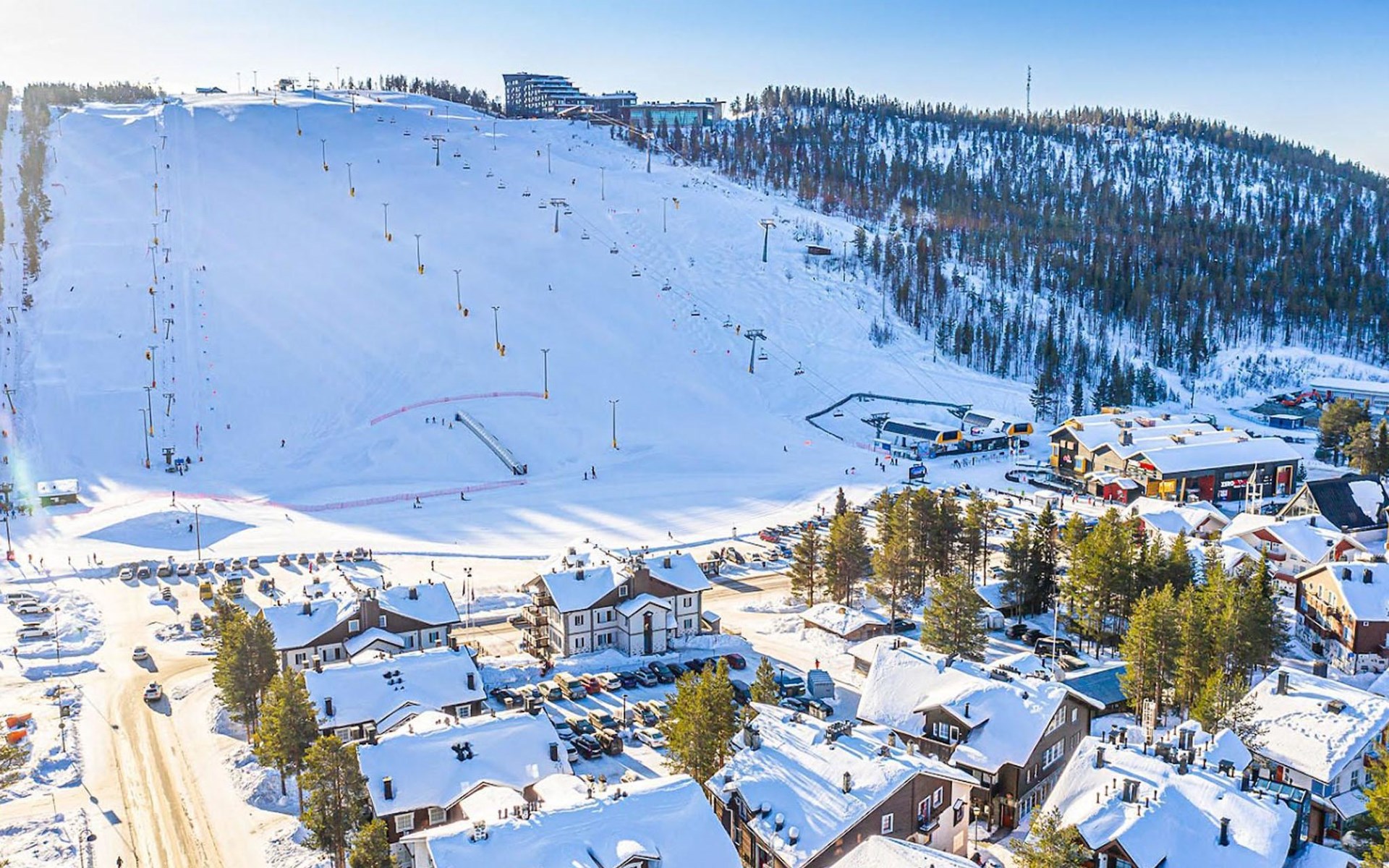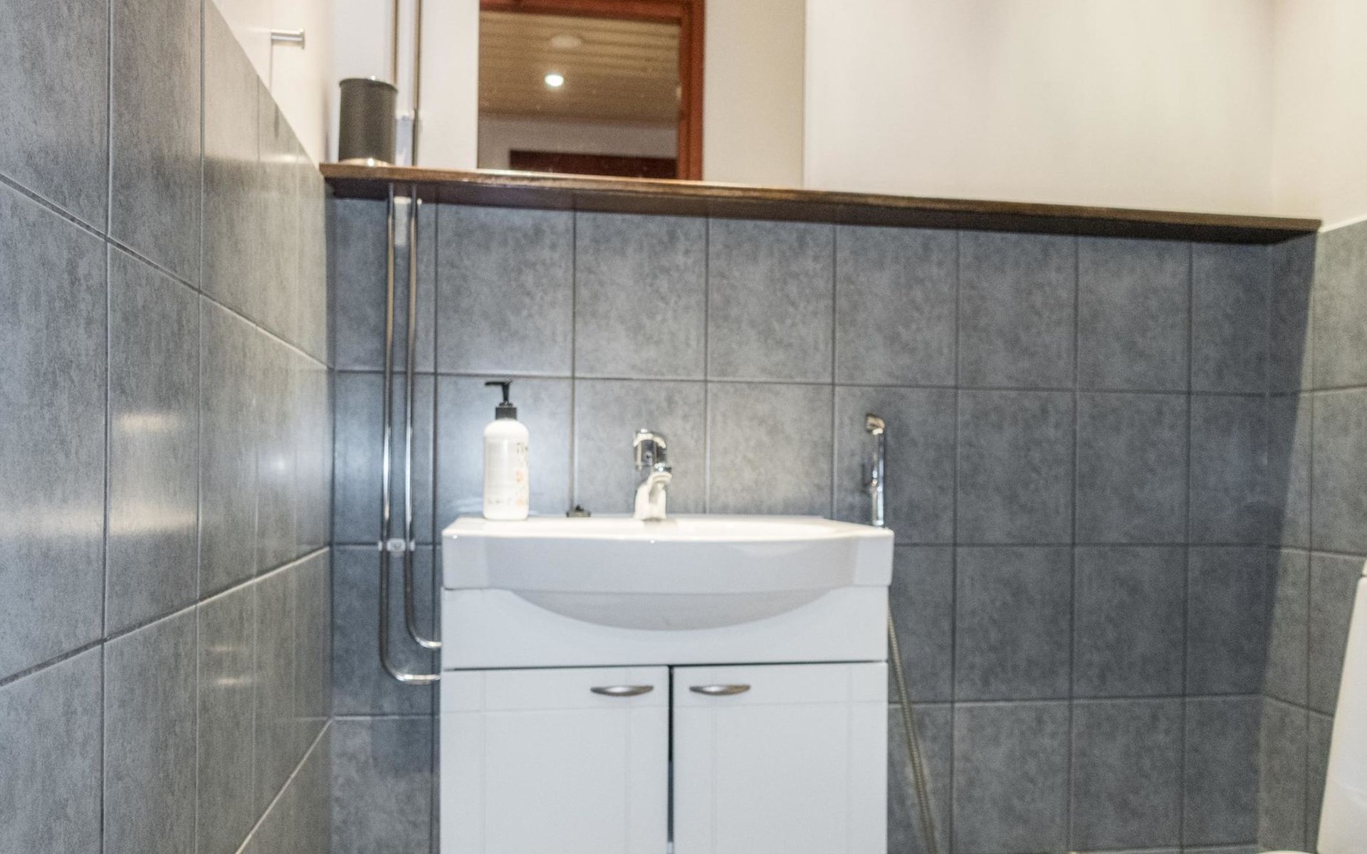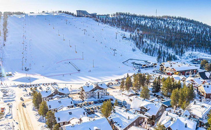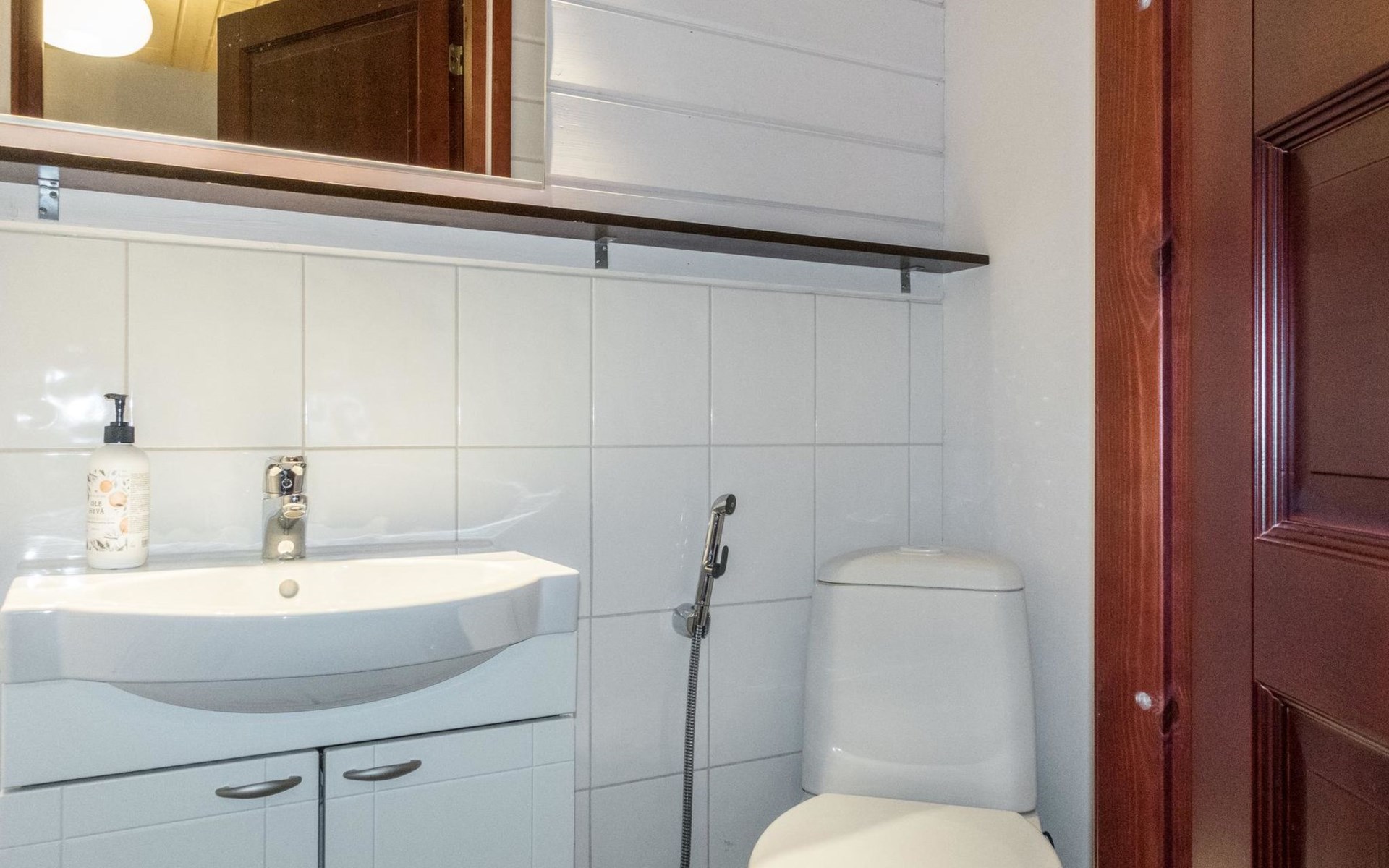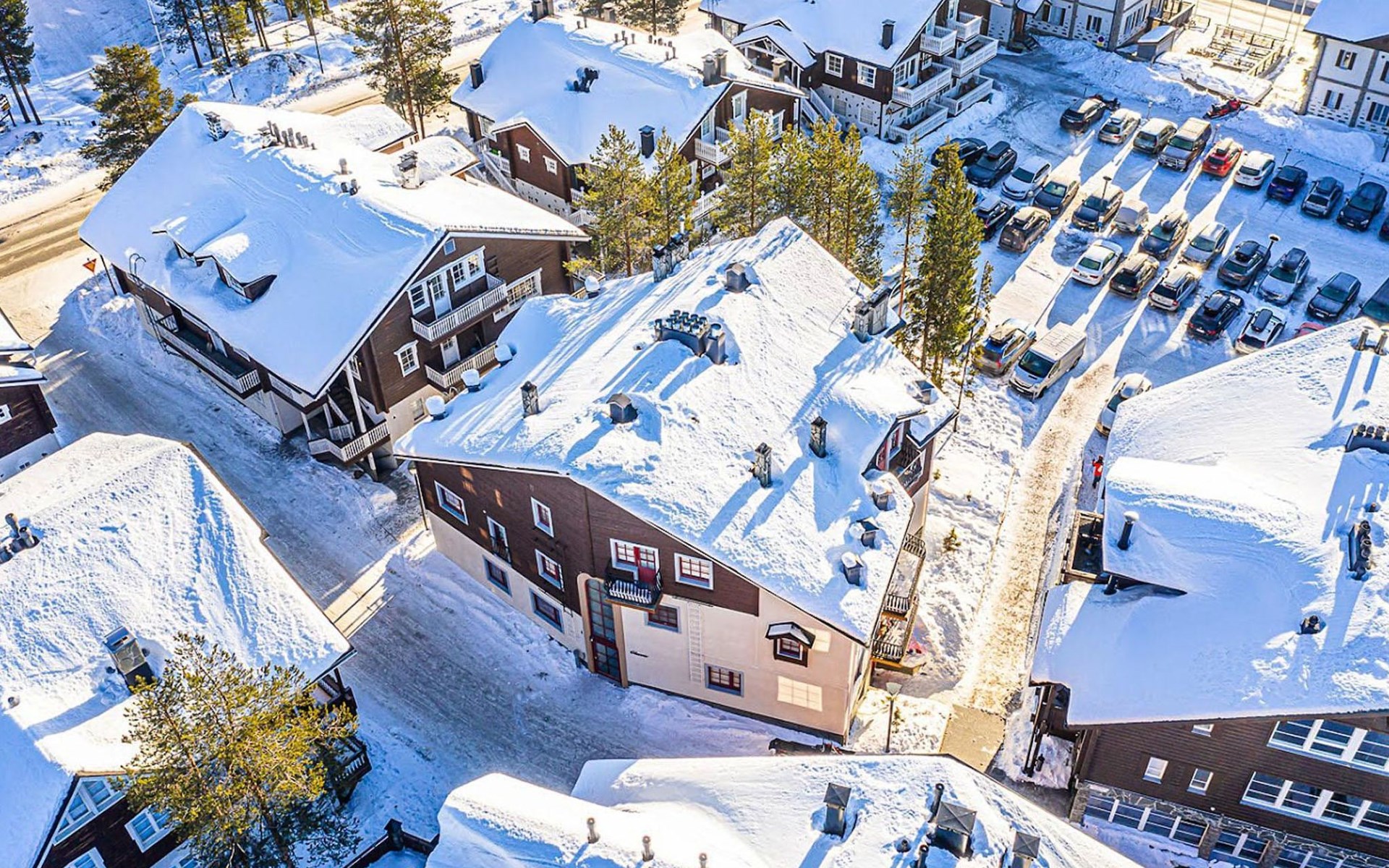 On the ground floor, living room/kitchen, bedroom with two beds, sauna, washroom, separate WC and balcony.