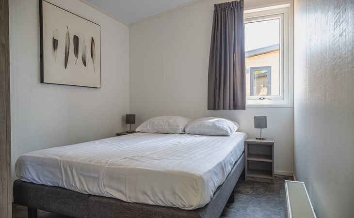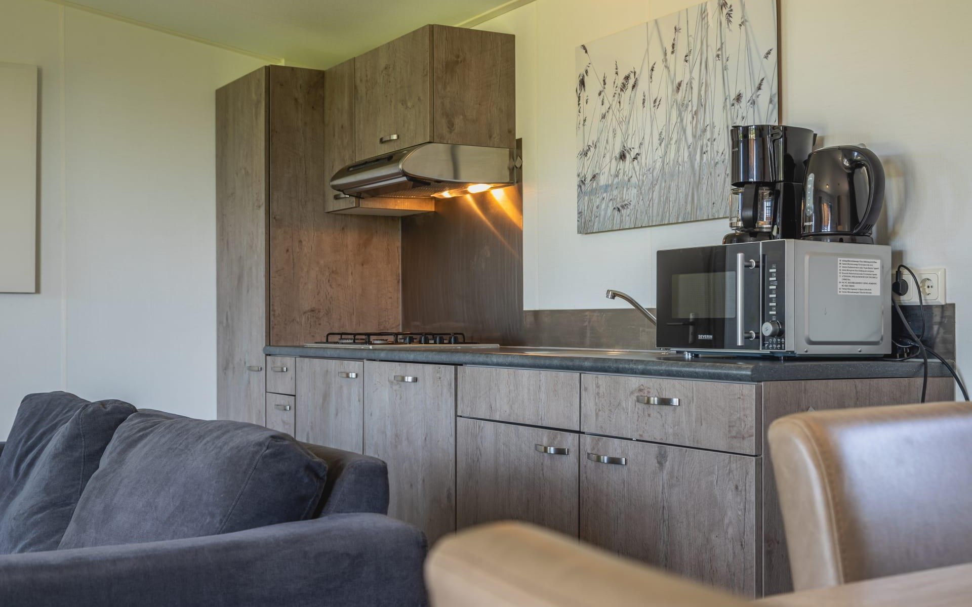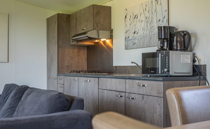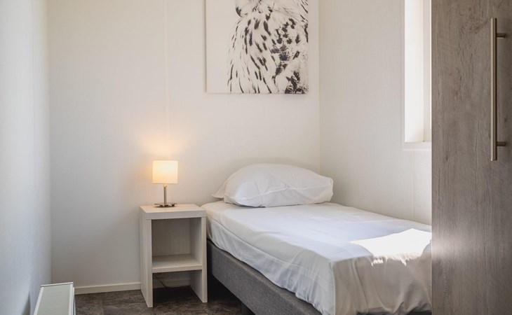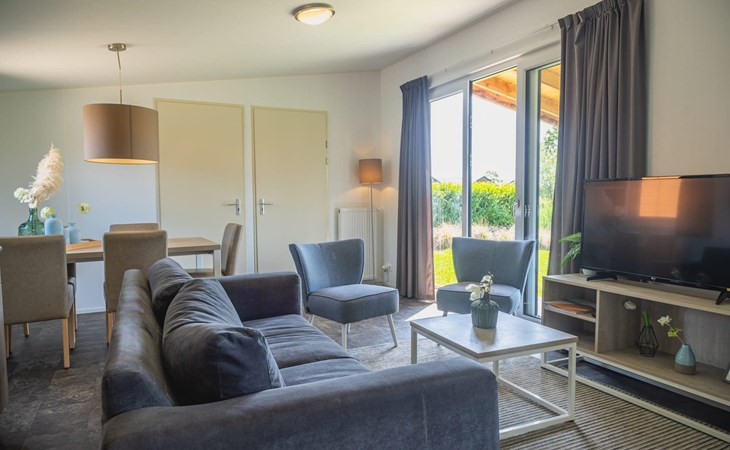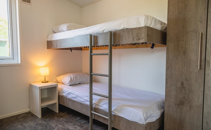 De Pavilion 5 is een gelijkvloers, vrijstaand chalet geschikt voor 5 personen. In de gezellige woonkamer vind je een zithoek en televisie. De keuken is uitgerust met onder andere een vaatwasser, waterkoker, combimagnetron en een koelkast zonder vriesvak. In de vakantiewoning vind je 3 slaapkamers, waarvan 1 met een tweepersoonsbed, 1 slaapkamer met 1 eenpersoonsbed en een slaapkamer met een stapelbed. Daarnaast is de woning voorzien van een badkamer met douche en toilet. Via de schuifpui in de woonkamer stap je op het overdekte terras met tuinmeubilair.
