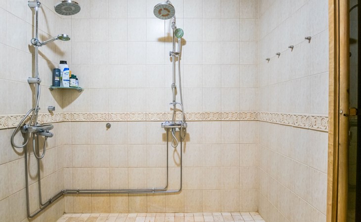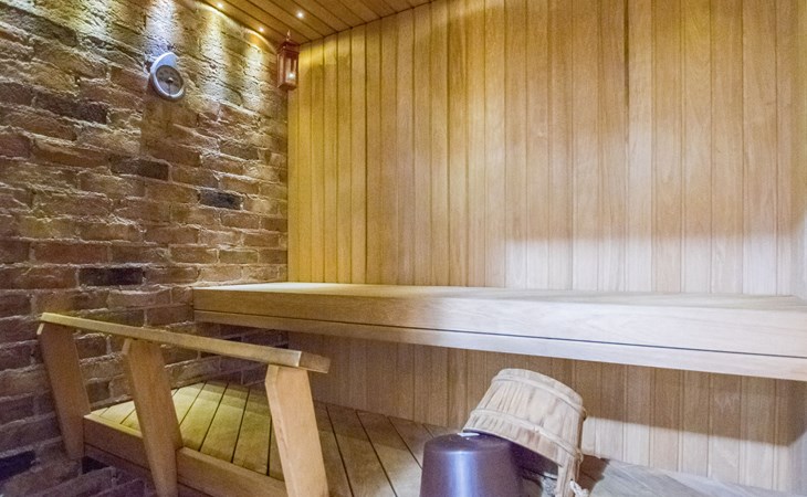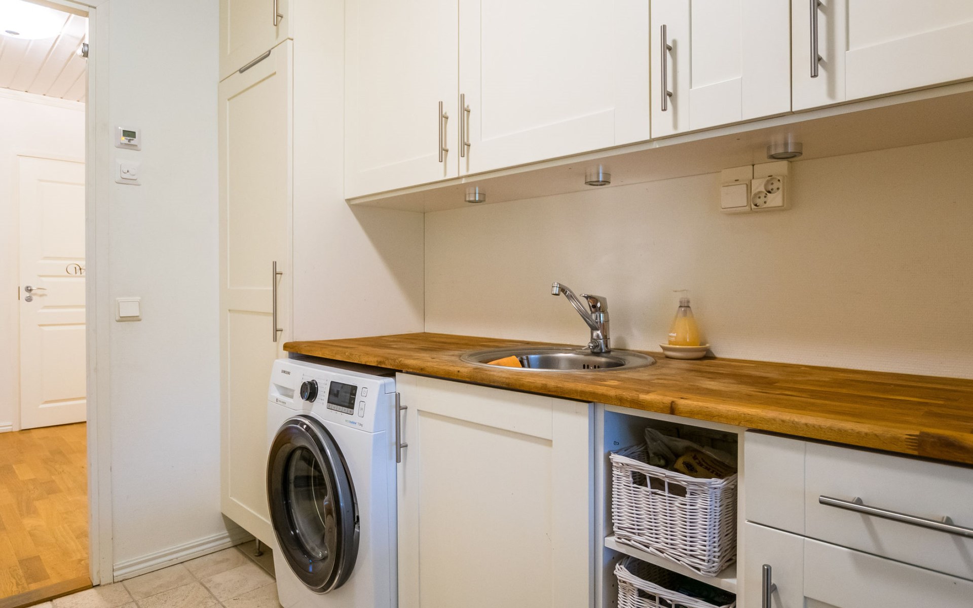 The villa includes a separate WC, a utility room with a washing machine, and a sauna (with an electric stove). The washroom features two showers.