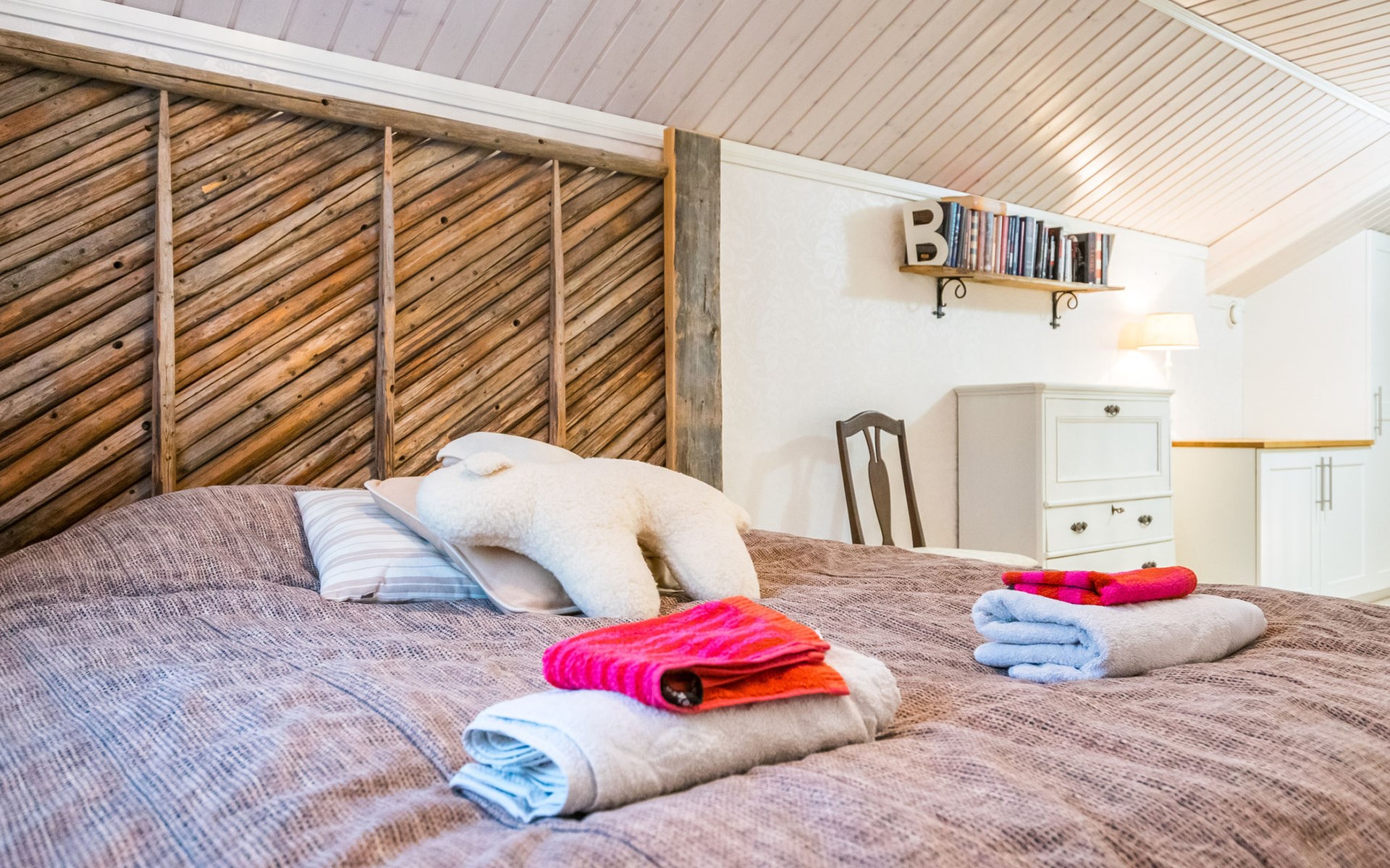 There are two bedrooms: one with two beds 120 x 200 cm and 80 x 200 cm, and the other with two 80 x 200 cm beds plus one high bed 90 x 200 cm. On the upper floor, there is a sleeping area with a 180 x 200 cm double bed and a separate 80 x 200 cm bed, along with two high-quality foldable beds (80 x 200 cm) with thick mattresses.