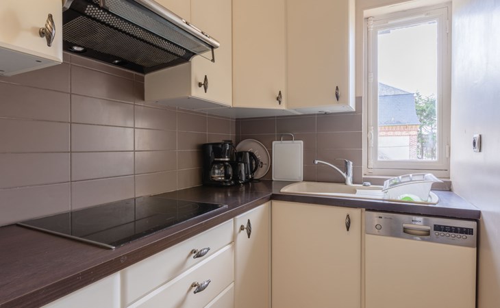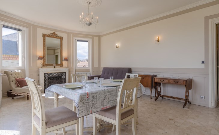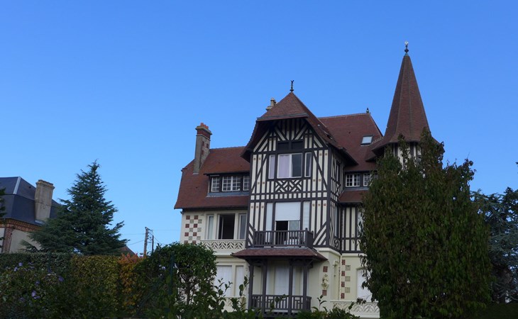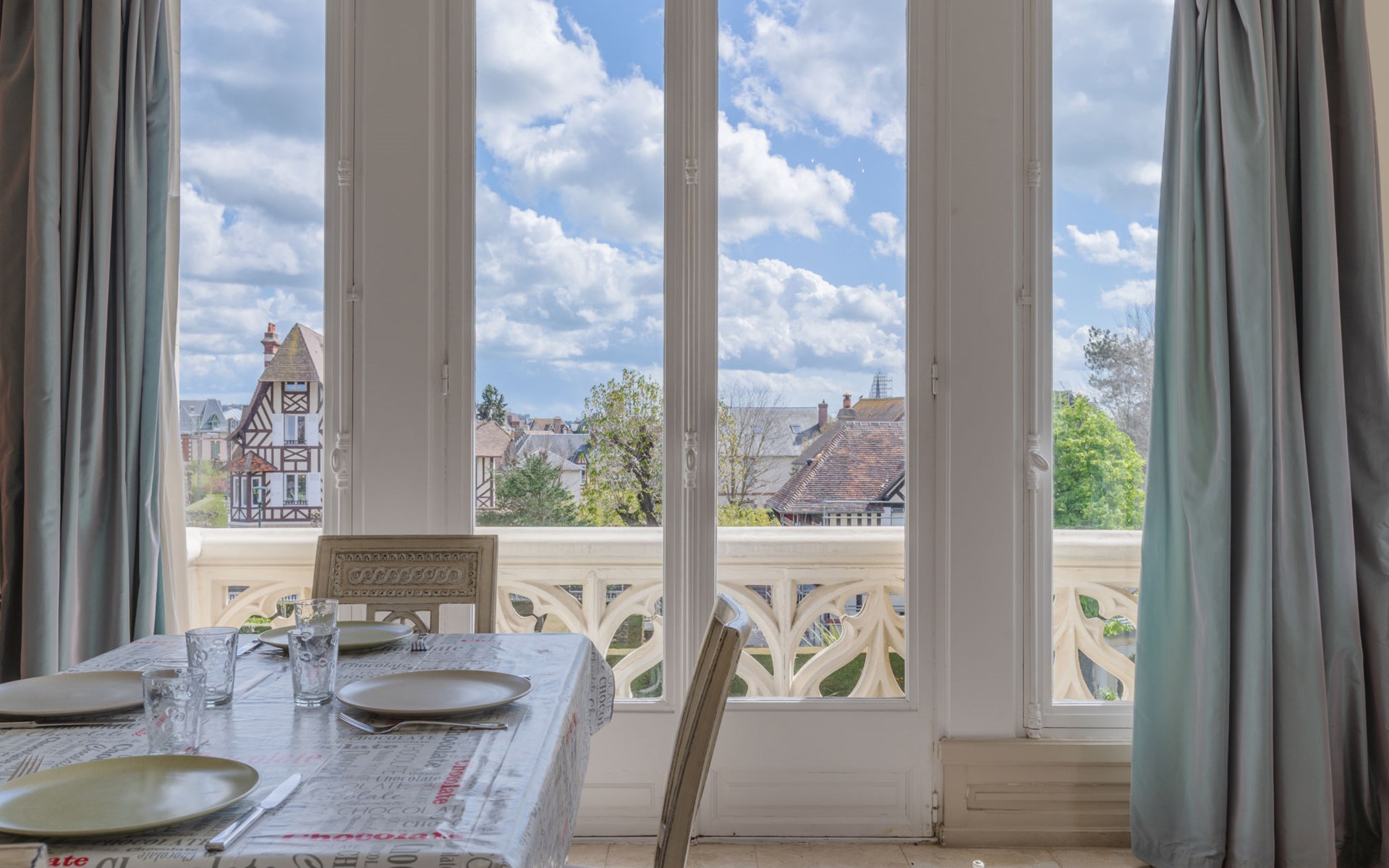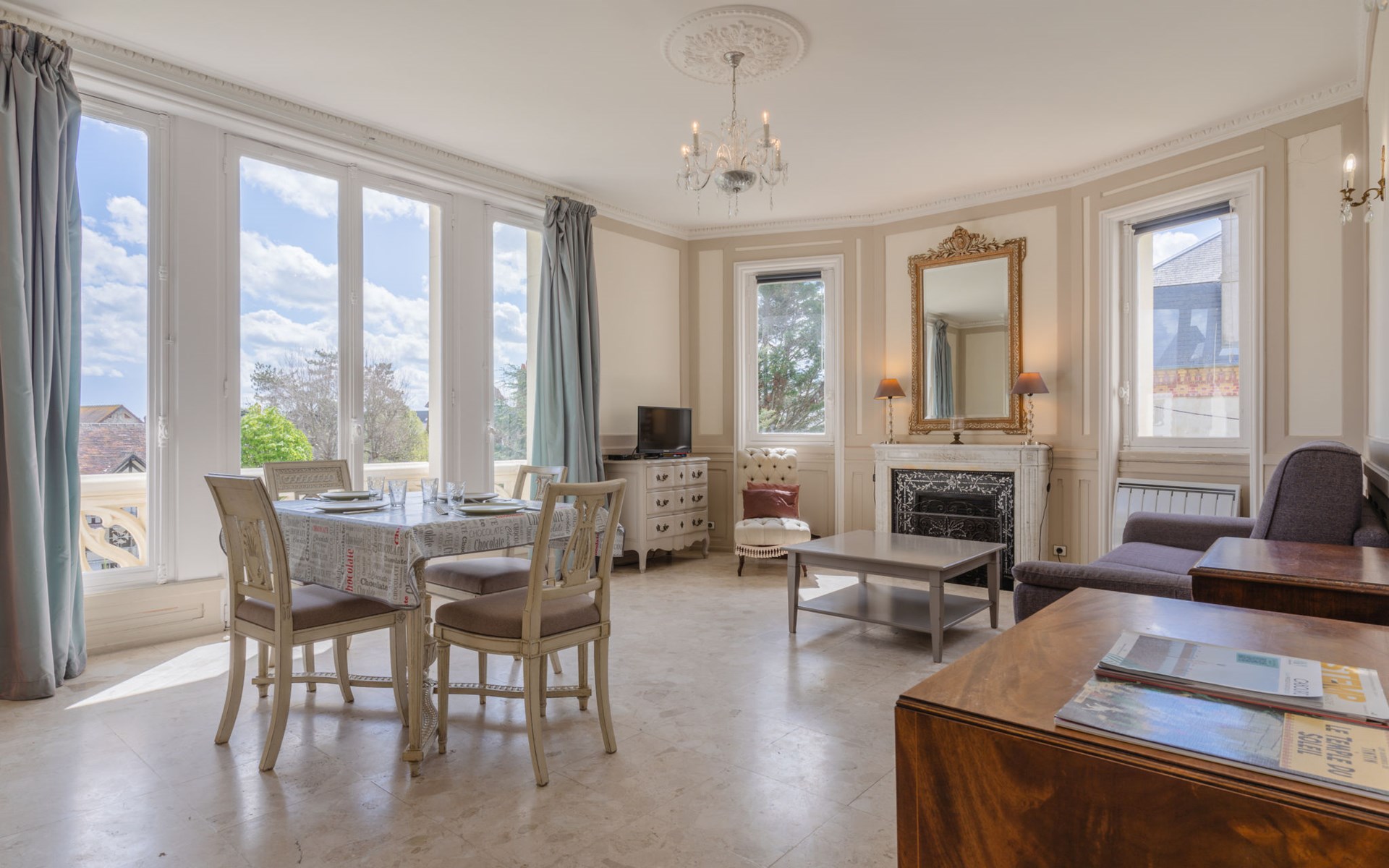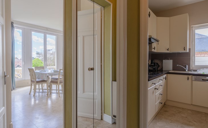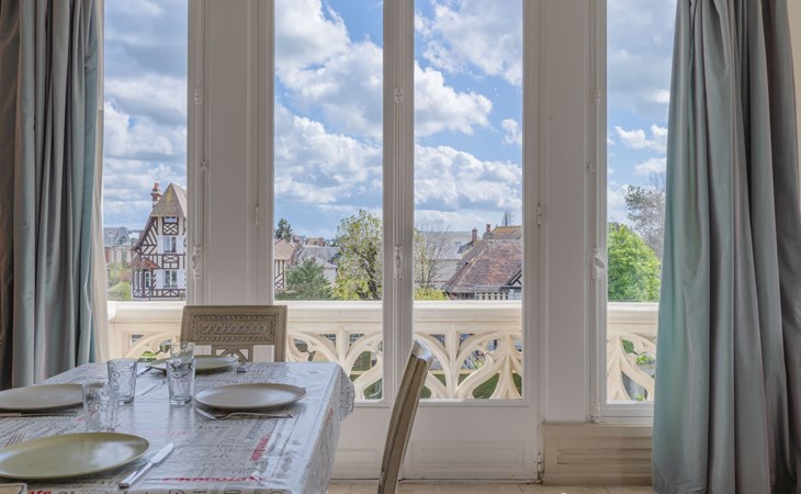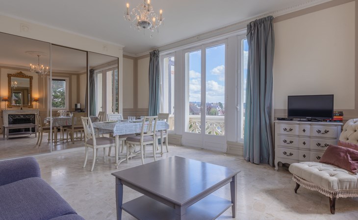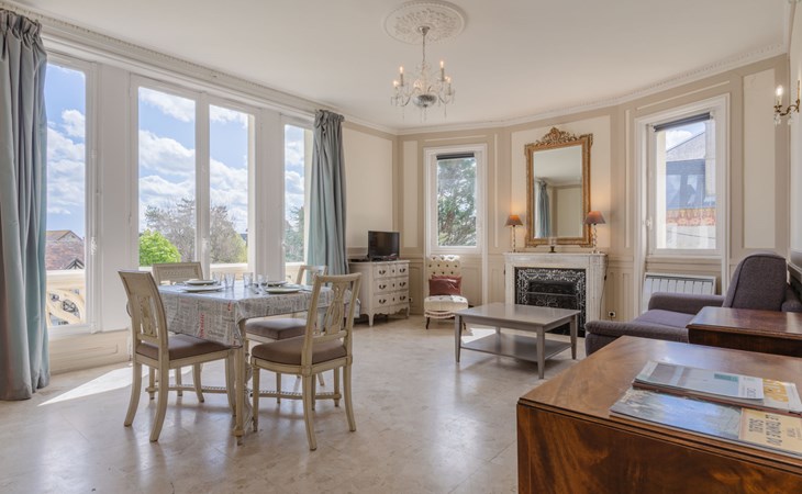 Residentie "Marie Antoinette", van 2 verdiepingen. In het centrum van Cabourg, in de plaats, 200 m van zee, 200 m van het strand. Openbare parkeerplaatsen in de straat. Winkel 200 m, supermarkt 1.7 km, restaurant 200 m, bushalte "Hôtel de Ville" 900 m, thermaalbad "Thalazur" 900 m. Golfterrein (9 holes) 1.8 km. Geen lift.