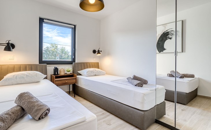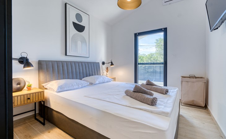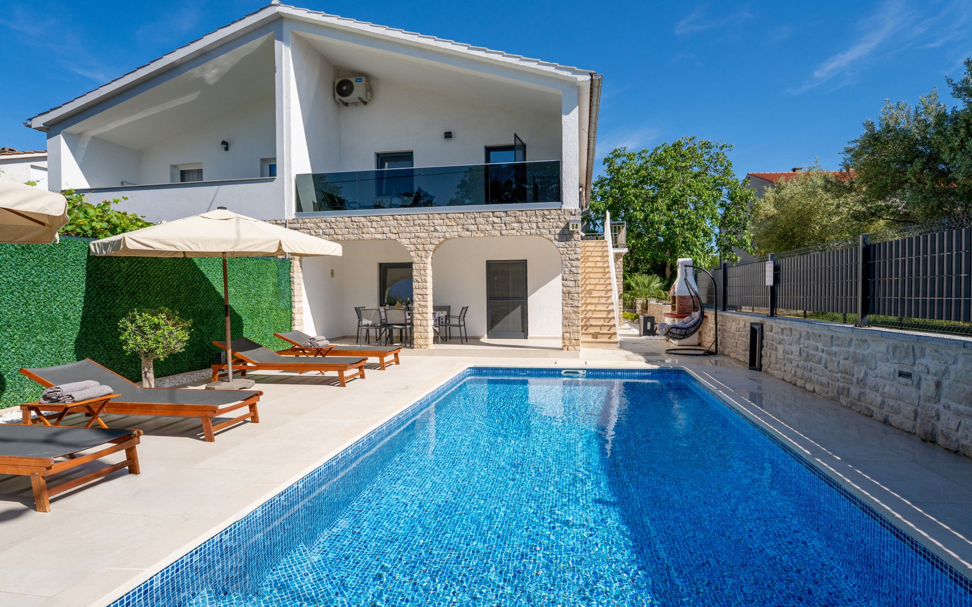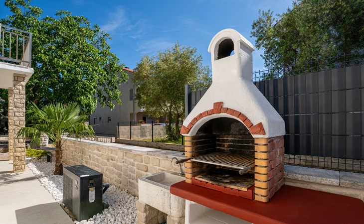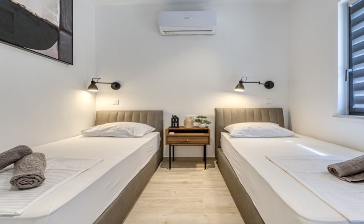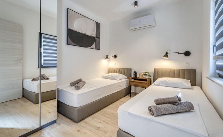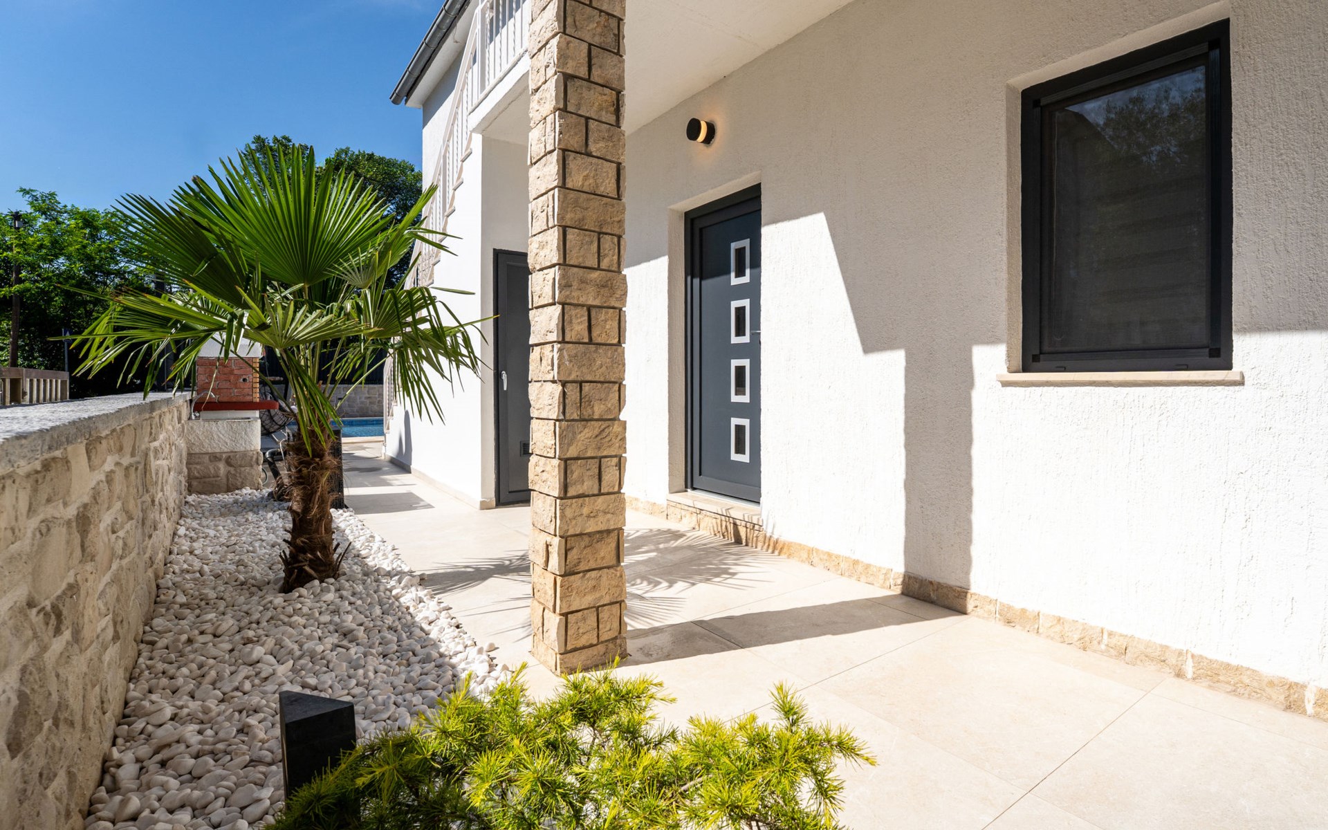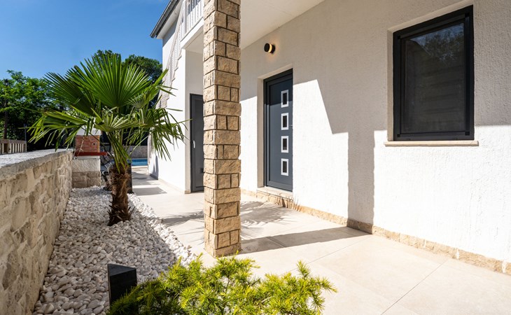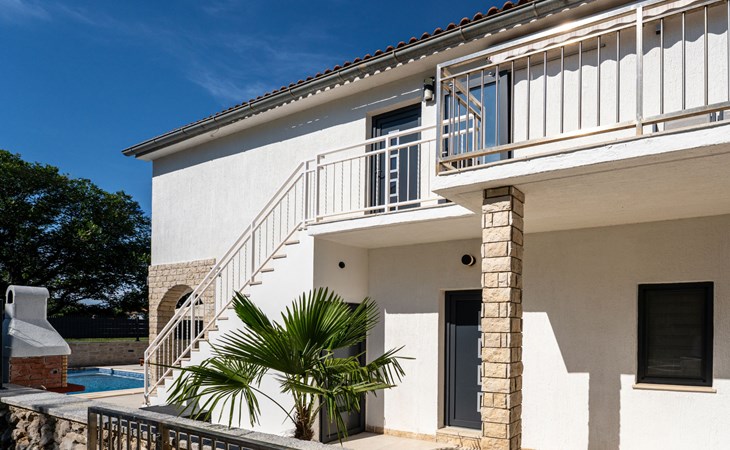 Twee onder één kap woning "Domagoj". In het gehucht Sveti Anton, 2.5 km van het centrum van Malinska, 11 km van het centrum van Krk, 20.5 km van het centrum van Vrbnik, 1.8 km van zee. Voor alleengebruik: terrein 200 m2 (omheind) met bomen, openluchtzwembad verwarmd (7 x 3 m, 24 m2, 120 - 150 cm diepte, seizoensgebonden beschikbaarheid: 15.Mrt. - 15.Nov.) met zout-elektrolyse. Buitendouche, onderhoud zwembad door de eigenaar/tuinman. In het huis: wasmachine (voor medegebruik, extra). Parkeerplaats (voor 2 auto's) op het terrein. Winkel 1 km, bushalte 350 m, kiezelstrand 1.8 km. De eigenaar woont in hetzelfde huis. Vliegveld 17 km van het huis.