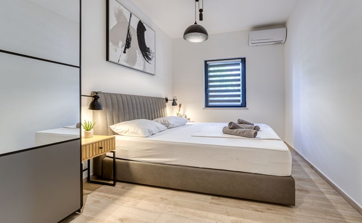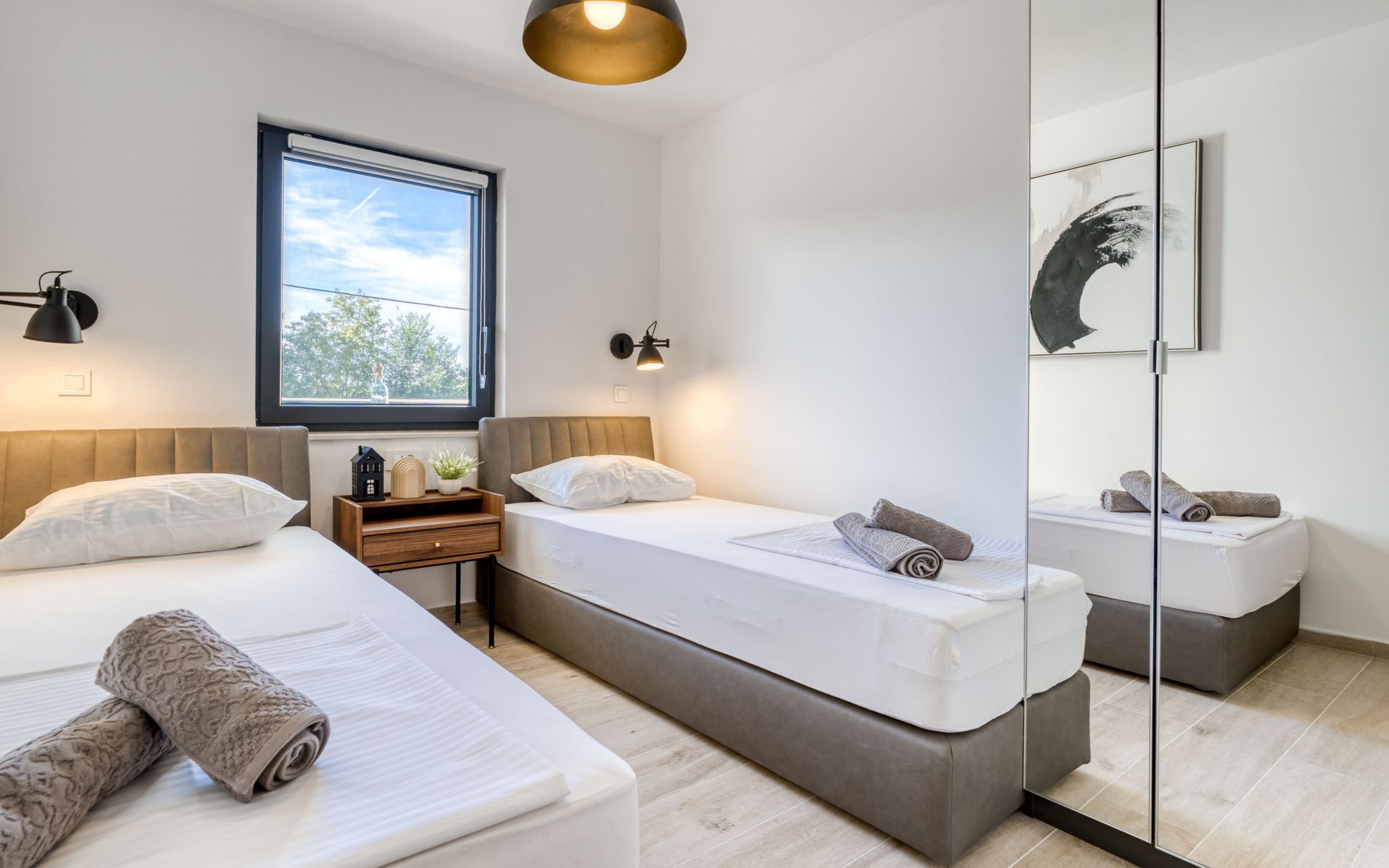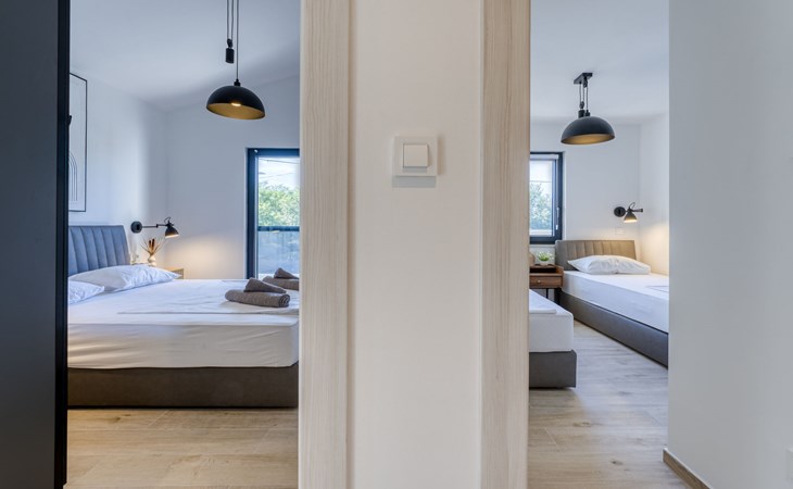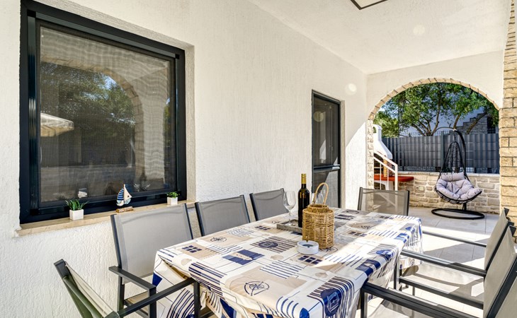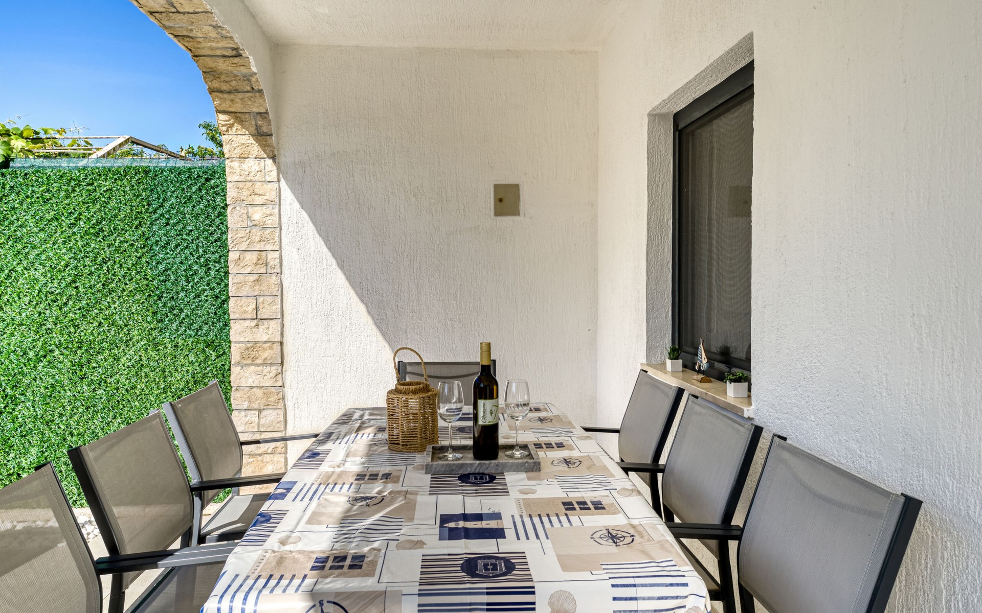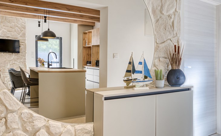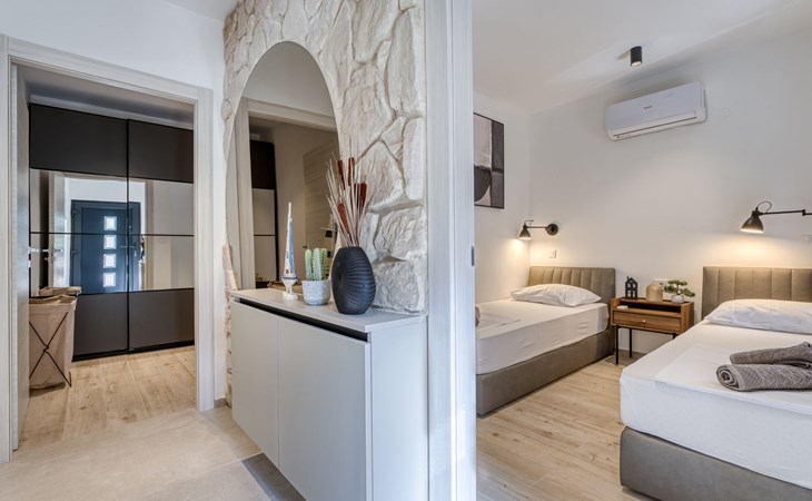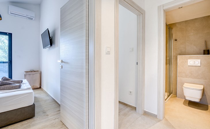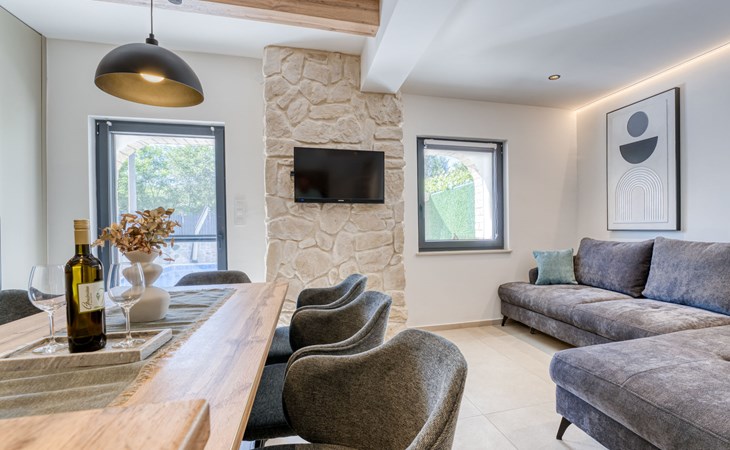 Twee onder één kap woning "Domagoj". In het gehucht Sveti Anton, 2.5 km van het centrum van Malinska, 11 km van het centrum van Krk, 20.5 km van het centrum van Vrbnik, 1.8 km van zee. Voor alleengebruik: terrein 200 m2 (omheind) met bomen, openluchtzwembad verwarmd (7 x 3 m, 24 m2, 120 - 150 cm diepte, seizoensgebonden beschikbaarheid: 15.Mrt. - 15.Nov.) met zout-elektrolyse. Buitendouche, onderhoud zwembad door de eigenaar/tuinman. In het huis: wasmachine (voor medegebruik, extra). Parkeerplaats (voor 2 auto's) op het terrein. Winkel 1 km, bushalte 350 m, kiezelstrand 1.8 km. De eigenaar woont in hetzelfde huis. Vliegveld 17 km van het huis.