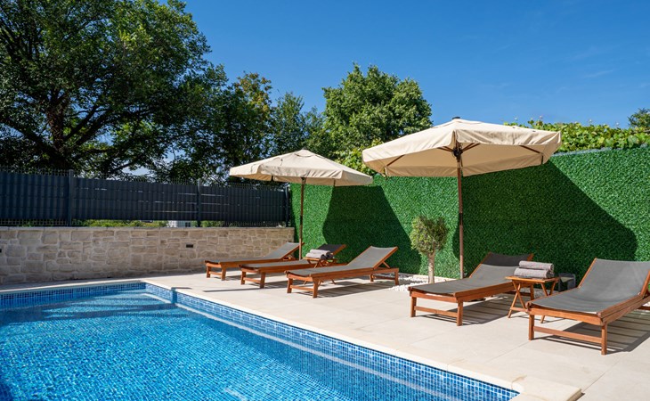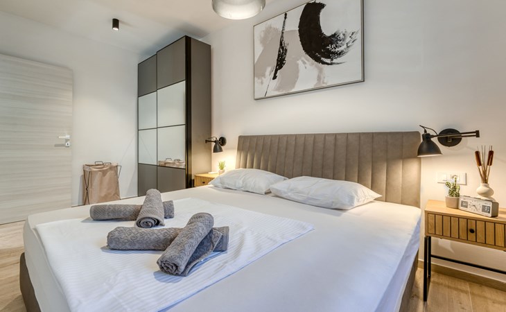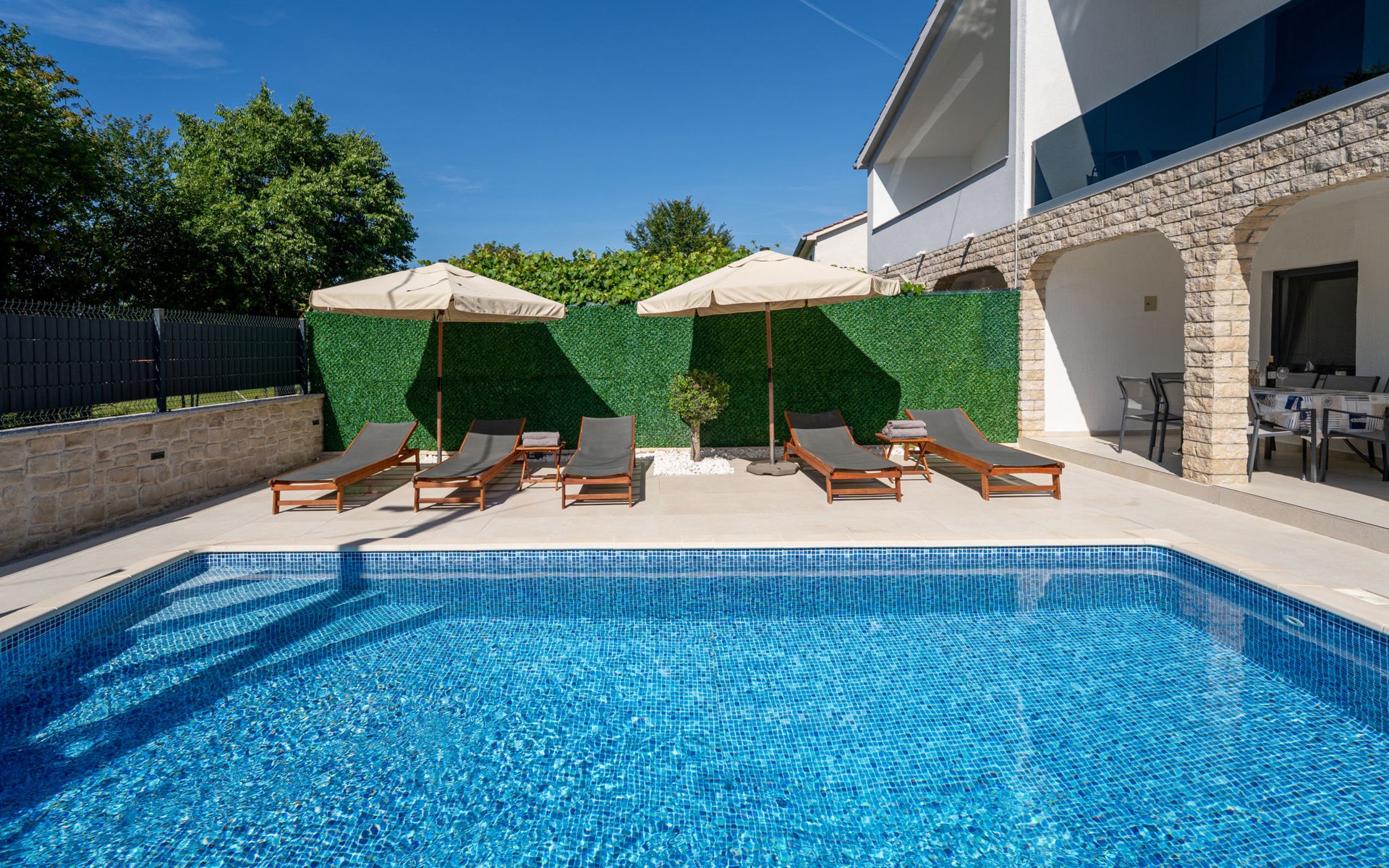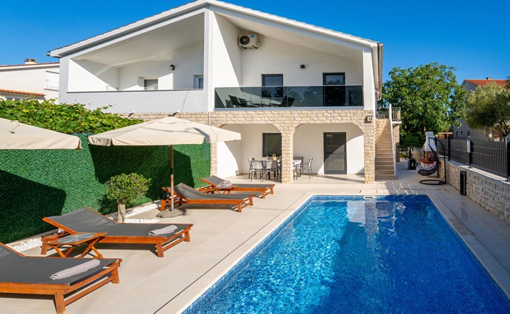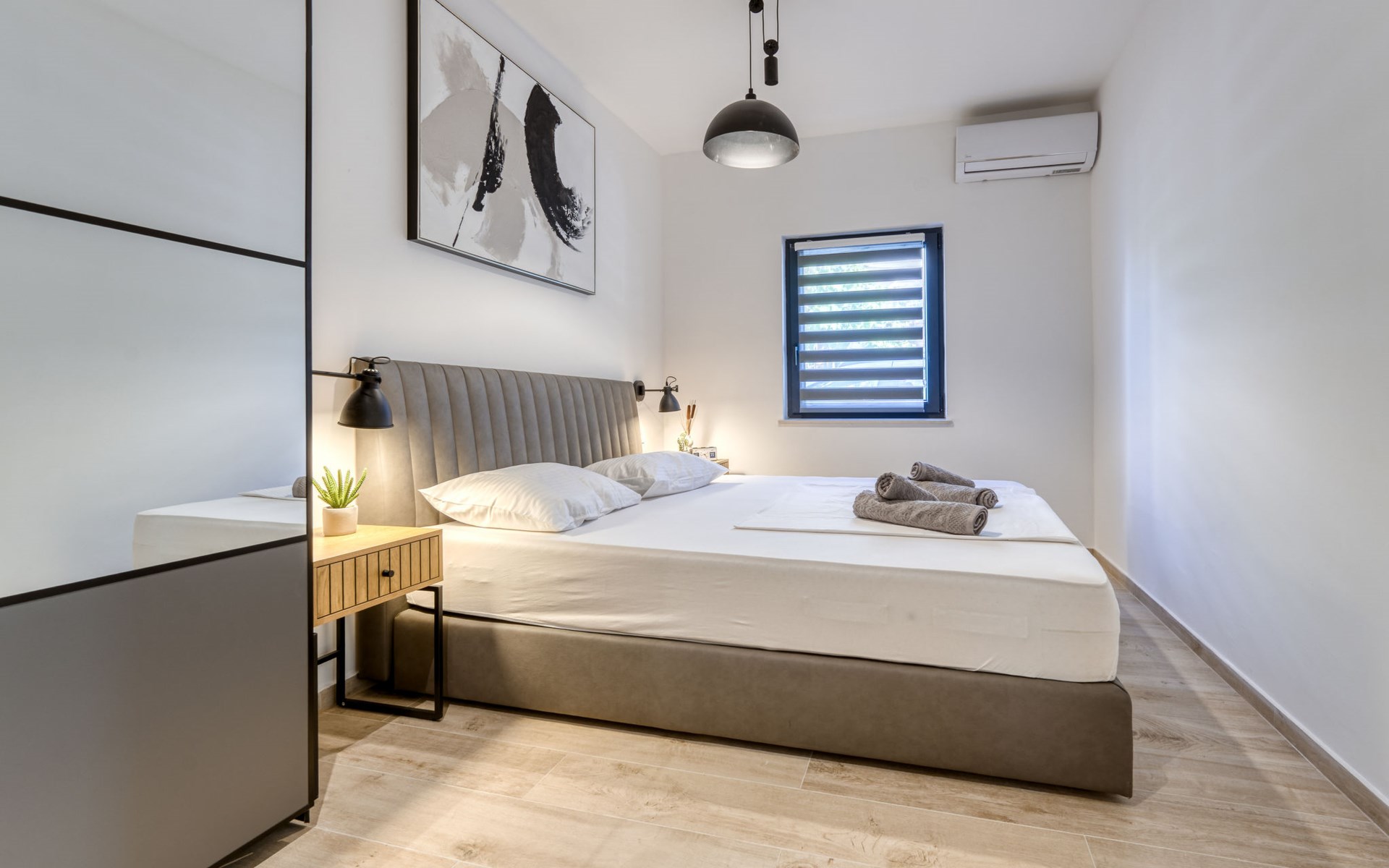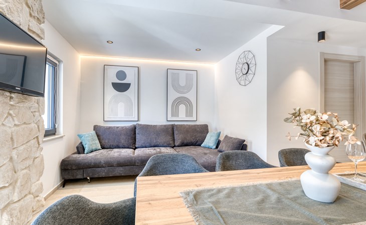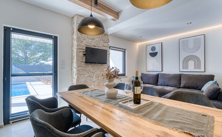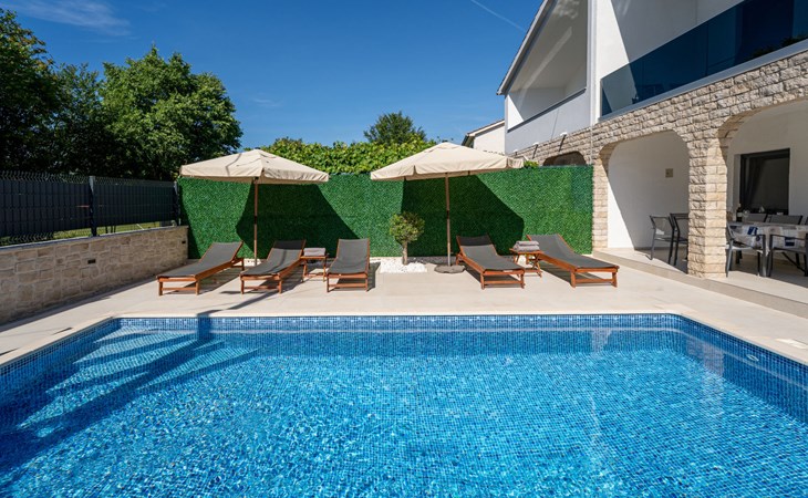Twee onder één kap woning "Domagoj". In het gehucht Sveti Anton, 2.5 km van het centrum van Malinska, 11 km van het centrum van Krk, 20.5 km van het centrum van Vrbnik, 1.8 km van zee. Voor alleengebruik: terrein 200 m2 (omheind) met bomen, openluchtzwembad verwarmd (7 x 3 m, 24 m2, 120 - 150 cm diepte, seizoensgebonden beschikbaarheid: 15.Mrt. - 15.Nov.) met zout-elektrolyse. Buitendouche, onderhoud zwembad door de eigenaar/tuinman. In het huis: wasmachine (voor medegebruik, extra). Parkeerplaats (voor 2 auto's) op het terrein. Winkel 1 km, bushalte 350 m, kiezelstrand 1.8 km. De eigenaar woont in hetzelfde huis. Vliegveld 17 km van het huis.