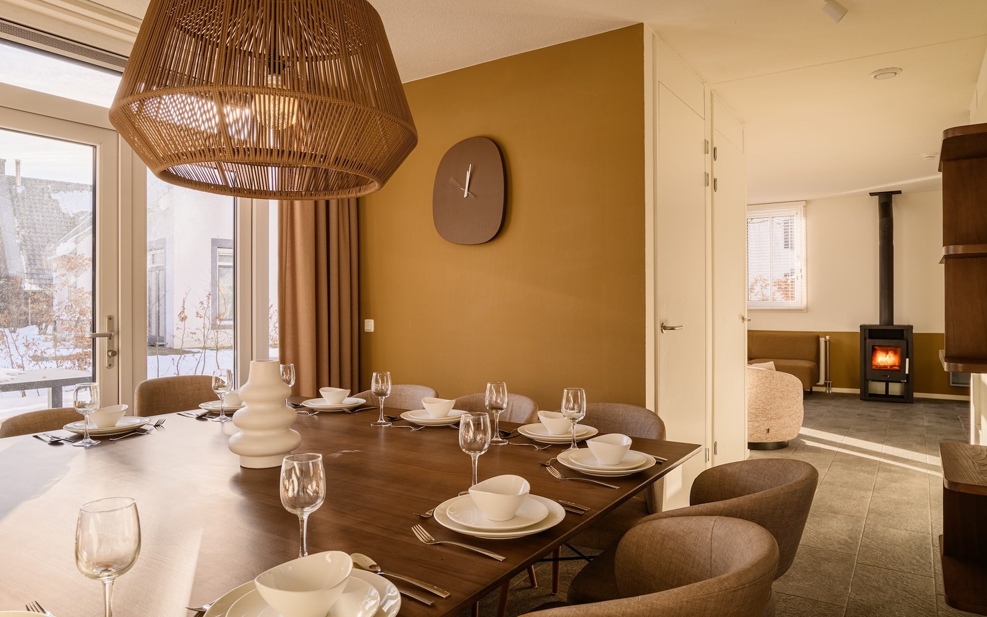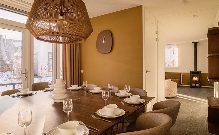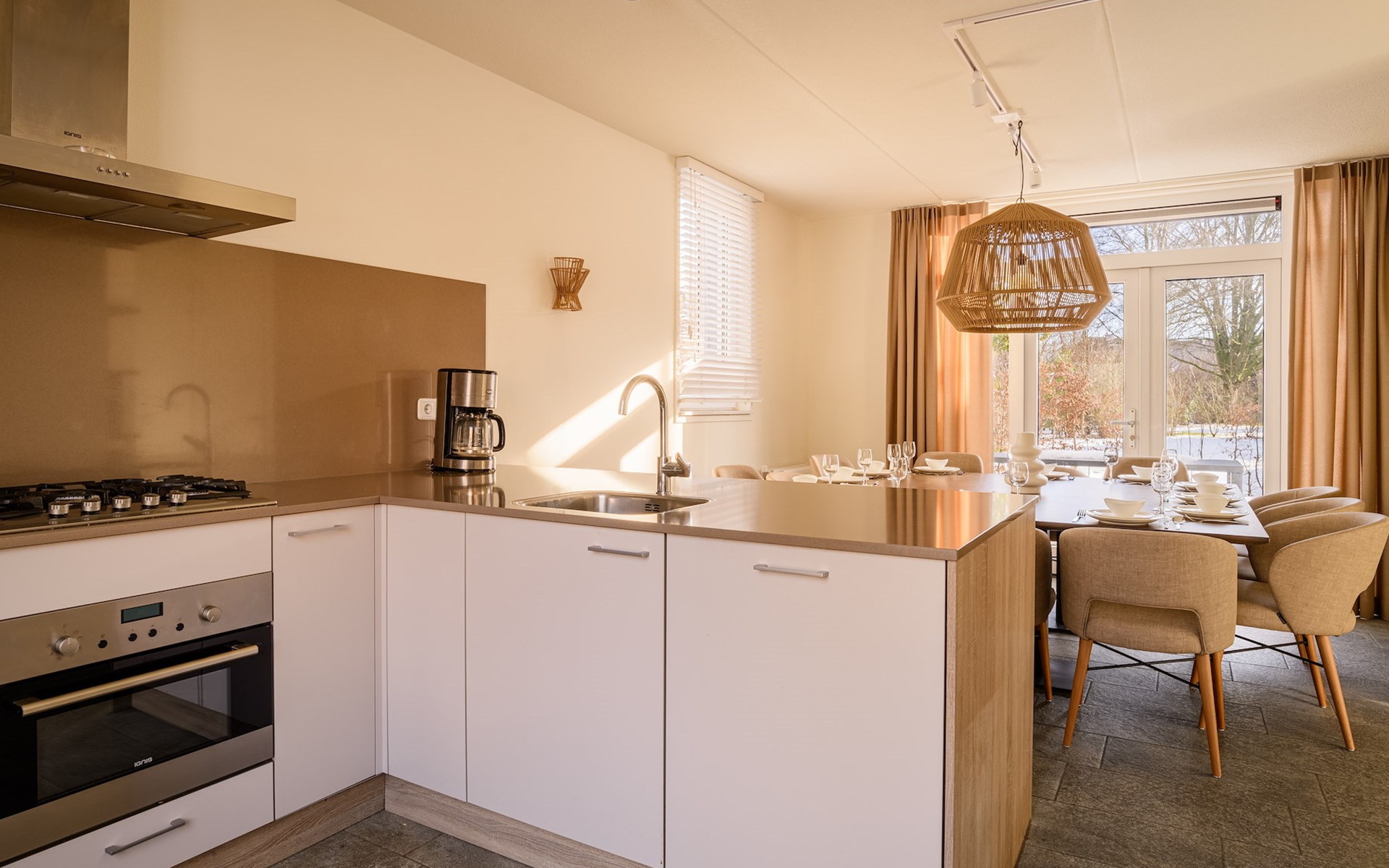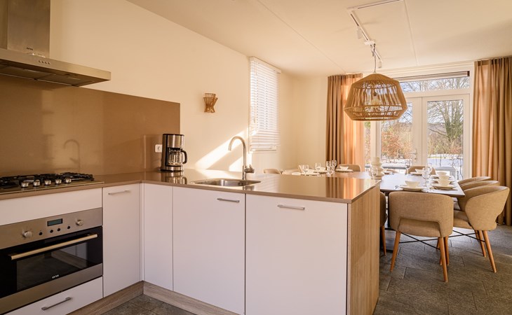 De royale woonkamer is voorzien van een zithoek met televisie en sfeervolle vrijstaande houtkachel waar je kunt genieten van een knisperend haardvuur. Daarnaast is er een apart eetgedeelte met eettafel. De luxe keuken is volledig uitgerust met onder andere een Amerikaanse koelkast, combi-oven, vaatwasser, waterkoker, kookplaat, broodrooster en een Nespresso apparaat.