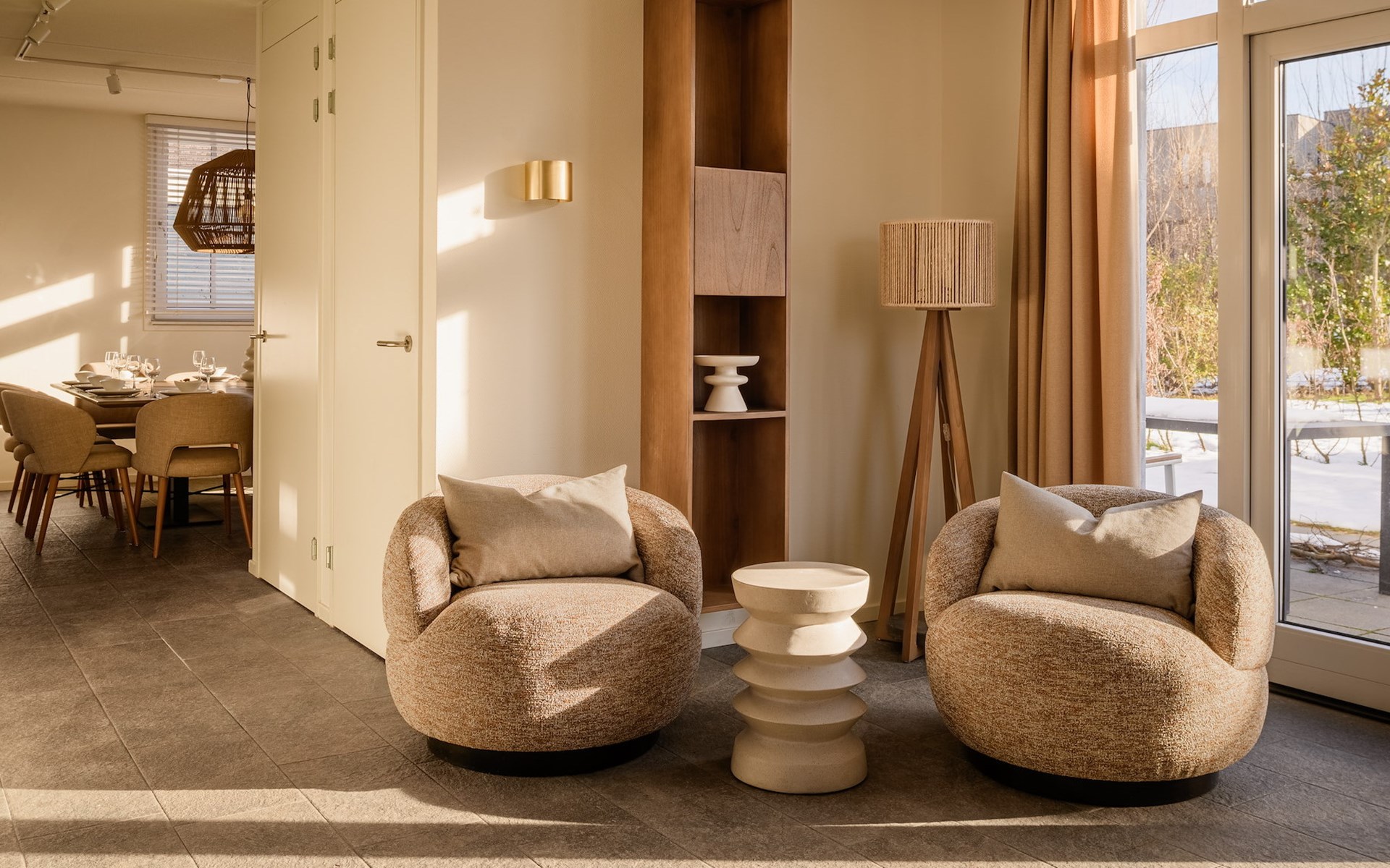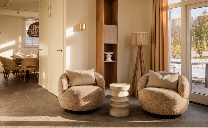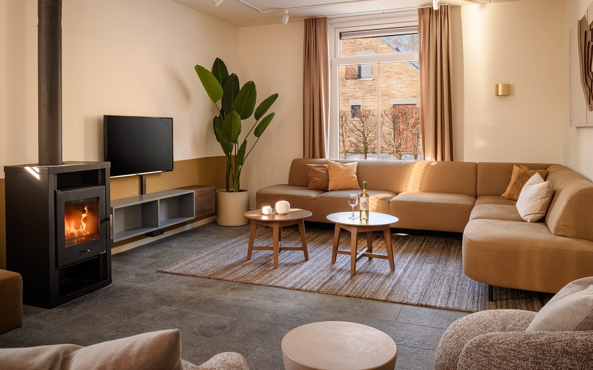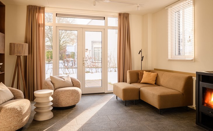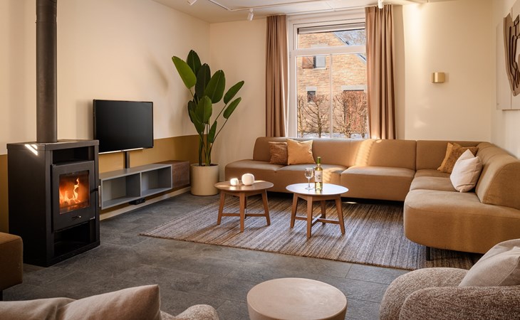 De royale woonkamer is voorzien van een zithoek met televisie en sfeervolle vrijstaande houtkachel waar je kunt genieten van een knisperend haardvuur. Daarnaast is er een apart eetgedeelte met eettafel. De luxe keuken is volledig uitgerust met onder andere een Amerikaanse koelkast, combi-oven, vaatwasser, waterkoker, kookplaat, broodrooster en een Nespresso apparaat.