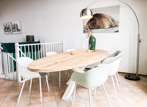 De woonkamer is voorzien van een zithoek met een open haard en televisie. Daarnaast is er een eethoek met eettafel. De luxe keuken is van alle gemakken voorzien met onder andere een koelkast, combi-oven, vaatwasser, waterkoker, kookplaat, broodrooster en een Nespresso apparaat. Via de openslaande deuren bereik je vanuit de woonkamer de tuin met een gemeubileerd terras.