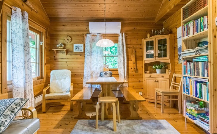 Log cottage 1987, Renovated spring 2021. living room/kitchen sofa bed, sleeping alcove with door double bed (8 cm thick maddress pad), sleeping loft with 2 beds, washroom, sauna, open porch. Cottage is heated mainly by air source heat pump.