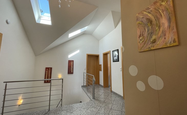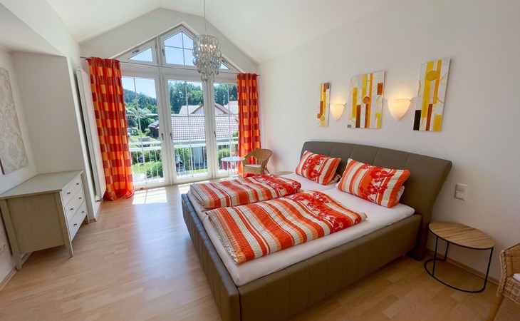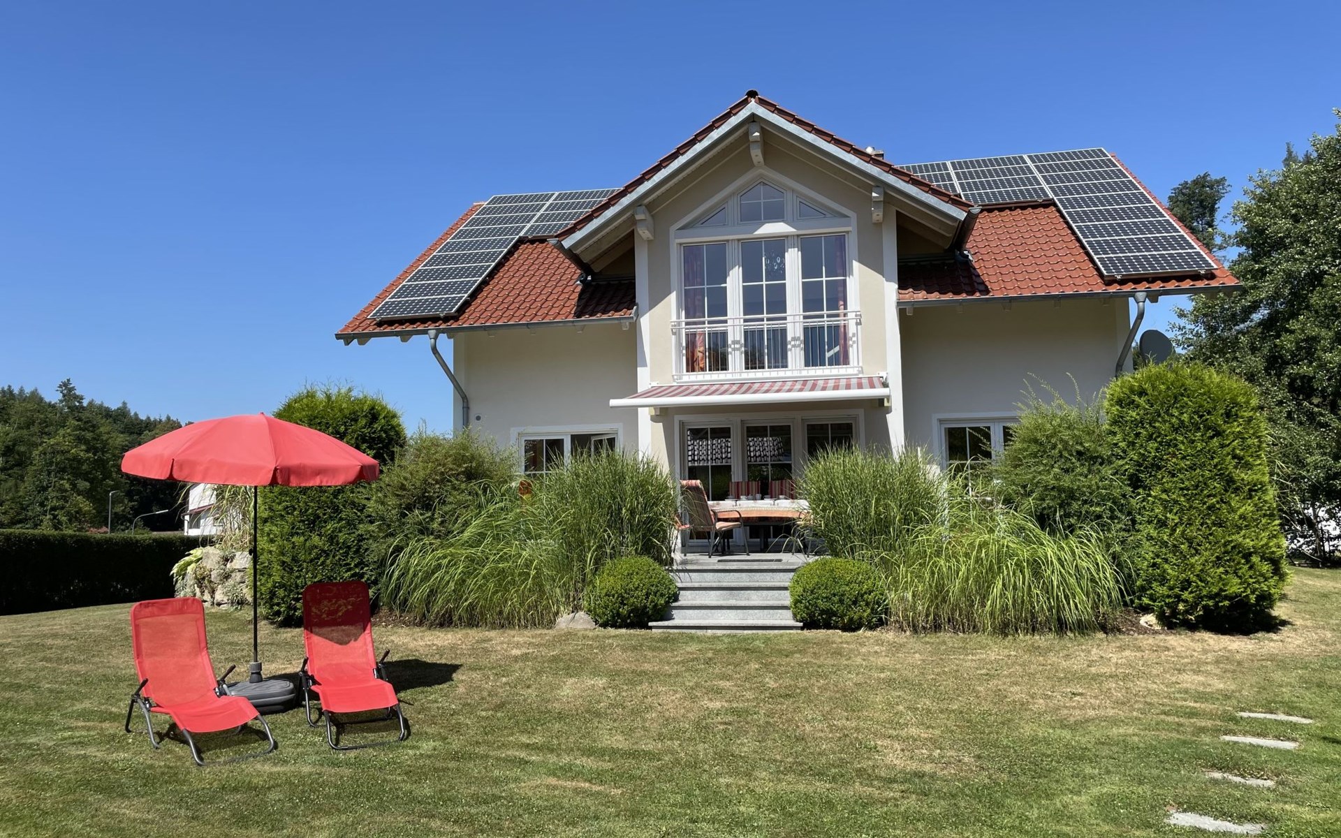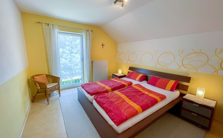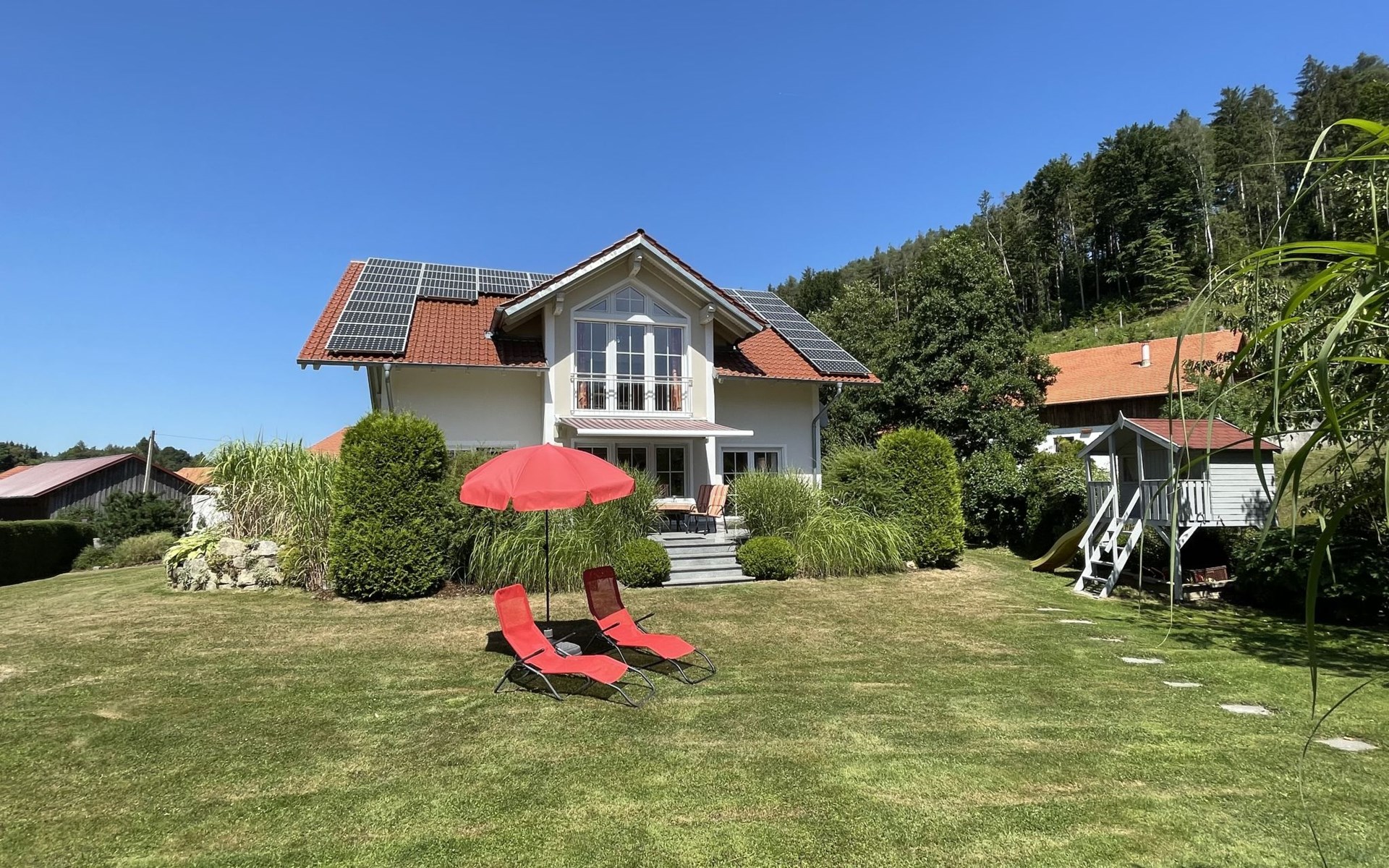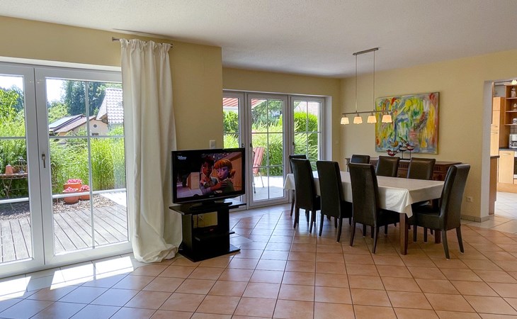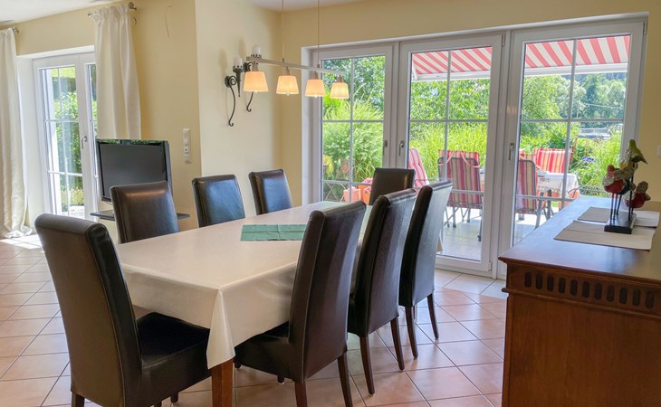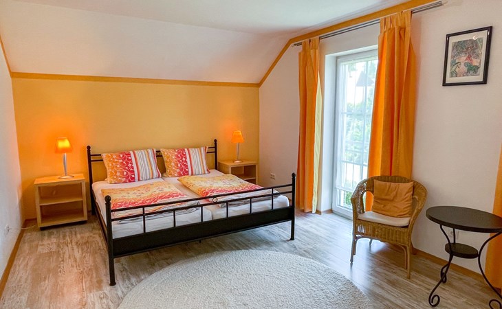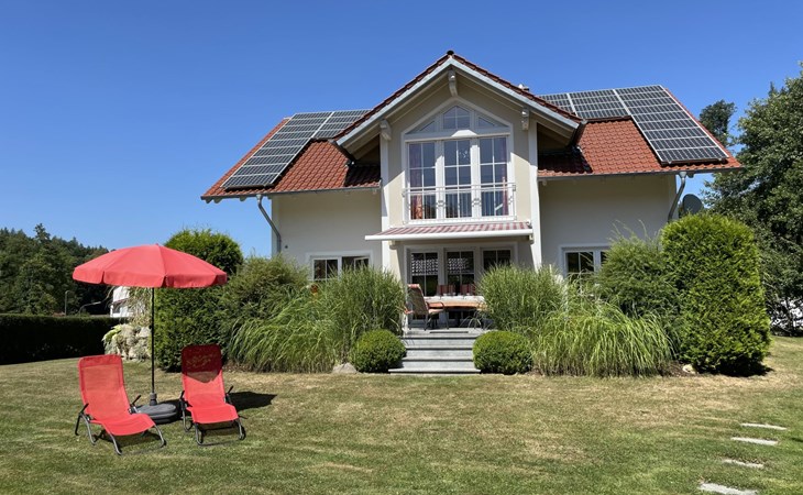 Huis "Ederer", eenzijdig aangebouwd. In de wijk Neuhaus, 3 km van het centrum van Schorndorf, 11 km van het centrum van Cham, 50 km van het centrum van Regensburg, 100 m van de bosrand, te midden van groen. Voor alleengebruik: terrein 1.000 m2, verzorgde tuin (niet omheind) met planten, ligweide. Kinderspeelplaats (schommel, zandbak), parkeerplaats op het terrein, eigen garage. Winkel 3 km, supermarkt 11 km, bushalte "Obergoßzell, Traitsching" 2.4 km, openluchtzwembad 3.7 km.