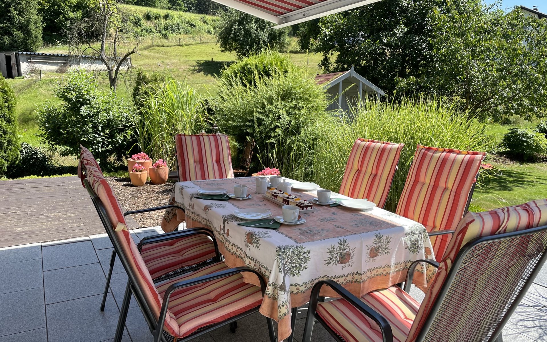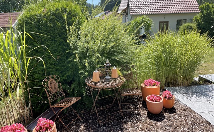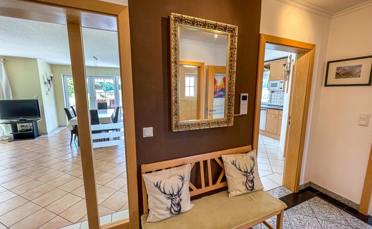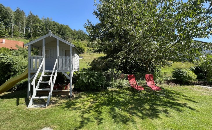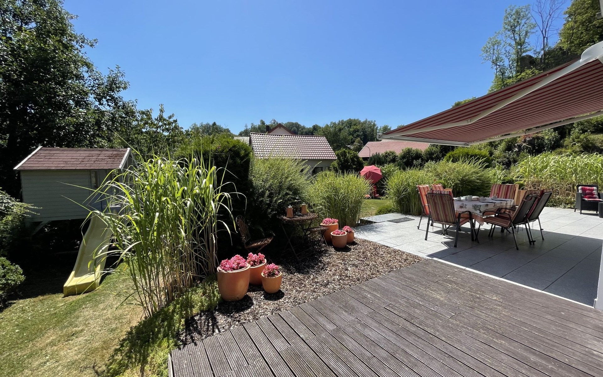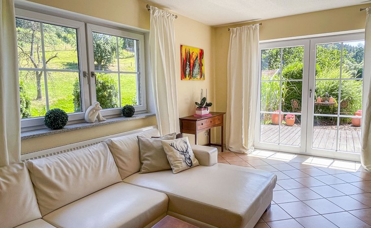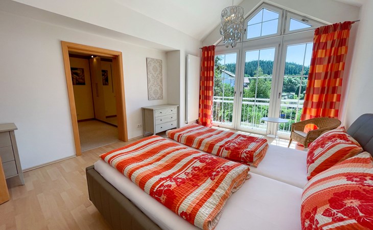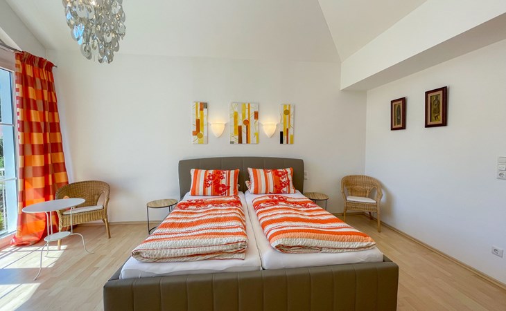 Huis "Ederer", eenzijdig aangebouwd. In de wijk Neuhaus, 3 km van het centrum van Schorndorf, 11 km van het centrum van Cham, 50 km van het centrum van Regensburg, 100 m van de bosrand, te midden van groen. Voor alleengebruik: terrein 1.000 m2, verzorgde tuin (niet omheind) met planten, ligweide. Kinderspeelplaats (schommel, zandbak), parkeerplaats op het terrein, eigen garage. Winkel 3 km, supermarkt 11 km, bushalte "Obergoßzell, Traitsching" 2.4 km, openluchtzwembad 3.7 km.