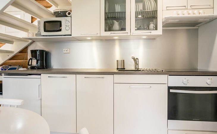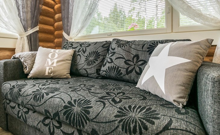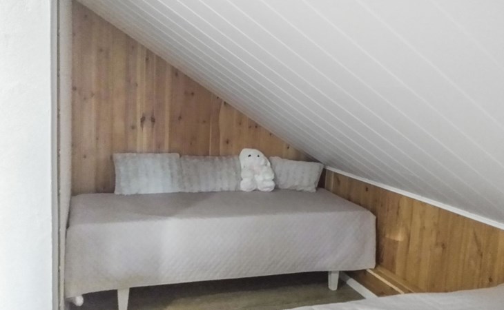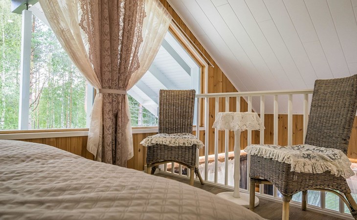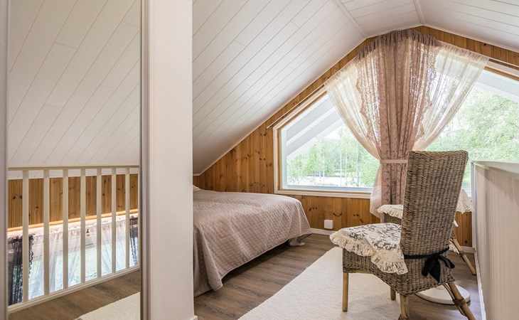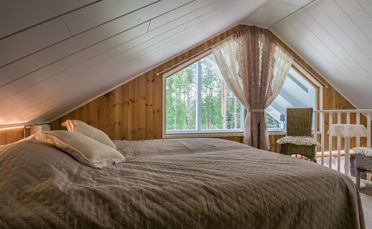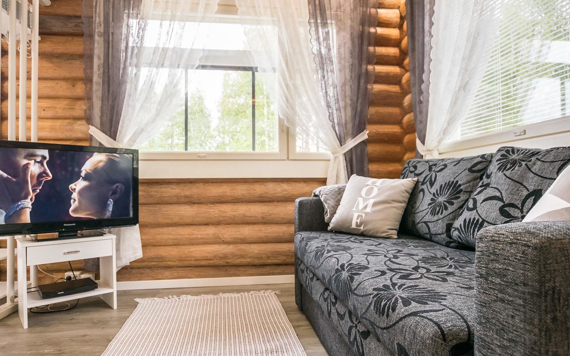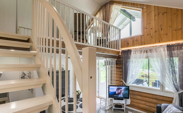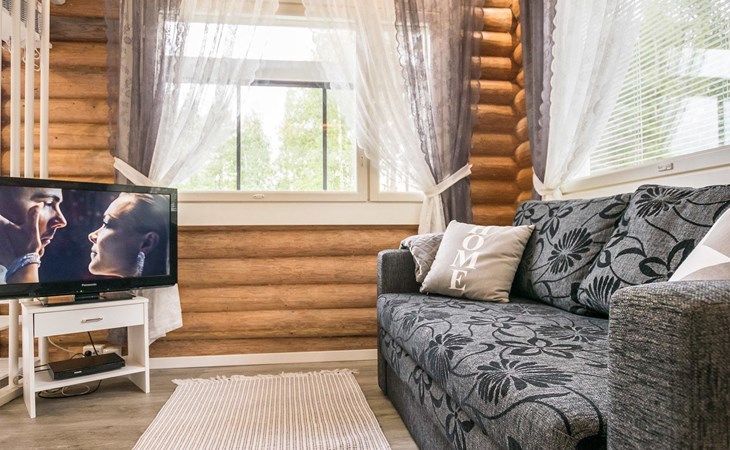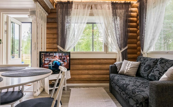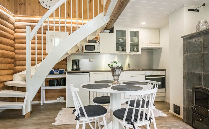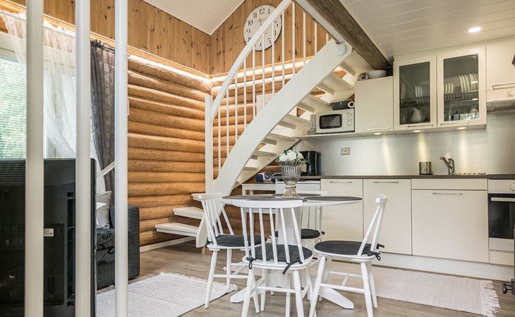 Log-built cabin 2021, living room with kitchen, dining group, TV and sofa bed (135x200 cm bed). Double bed and extra bed (140 x 196 cm) for one in the loft.